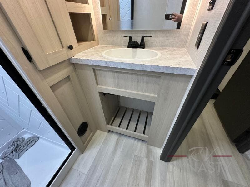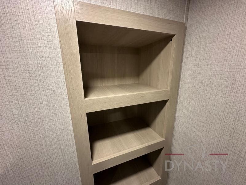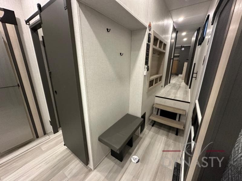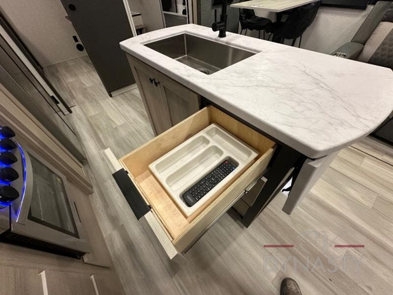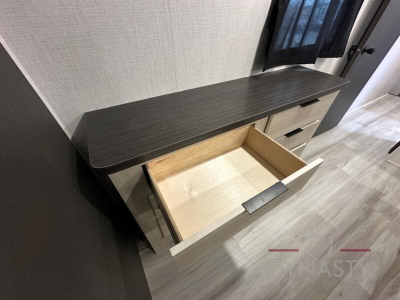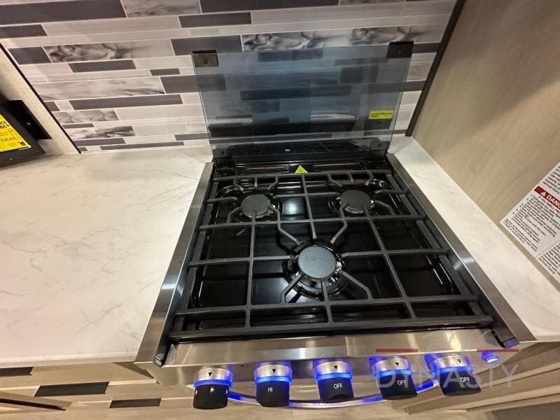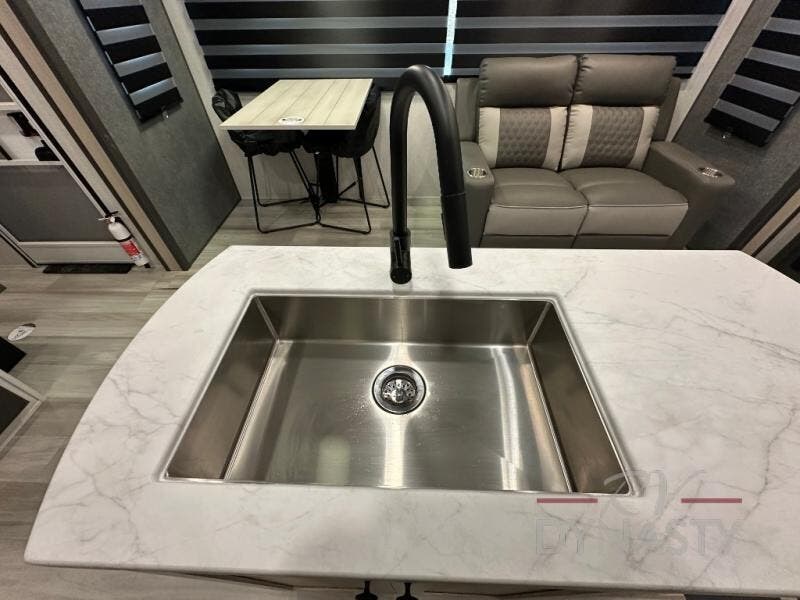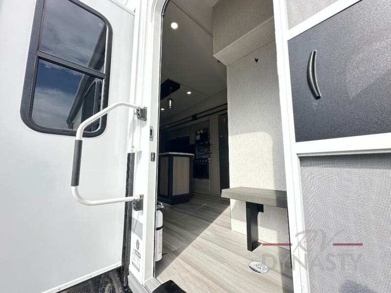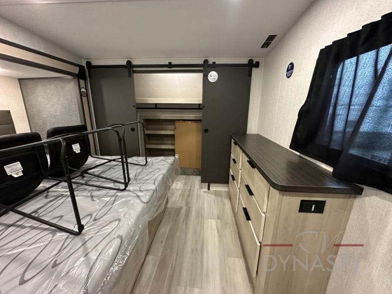 Wow! You won't believe the features found in this luxury fifth wheel that can sleep up to nine each night! Your guests or the kids will absolutely love the middle bunkroom with triple bunks and a loft above for even more sleeping or storage space. There is also a pull-out desk here, which will allow you to utilize this space as an office as well! You'll have your own space in the front private bedroom on the king bed slide out, and there is a walk-in wardrobe to keep your clothes tidy. There is even washer and dryer prep for the option to keep those clothes clean! The chef of your group will have everything they need to prepare meals, including a 21" 2-in-1 oven range, an over-the-range microwave, a 16 cu. ft. 12V refrigerator, plus a kitchen island for more counter space. In the evenings, your crew can get cozy on the rear sofa and theater seats across from the entertainment center and fireplace, or you might just play a game at the hi-top table and chairs!