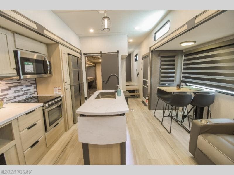 Wow! You won't believe the features found in this luxury fifth wheel that can sleep up to nine each night! Your guests or the kids will absolutely love the middle bunkroom with a hide-a-bed sofa and bunk beds plus a loft above for even more sleeping or storage space. There is also a desk/wardrobe here, which will allow you to utilize this space as an office as well! You'll have your own space in the front private bedroom on the king bed slide out, and there is a walk-in wardrobe to keep your clothes tidy. There is even washer and dryer prep for the option to keep those clothes clean! The chef of your group will have everything they need to prepare meals, including a 21" 2-in-1 oven range, an over-the-range microwave, a 16 cu. ft. 12V refrigerator, plus a kitchen island for more counter space. In the evenings, your crew can get cozy on the rear sofa and theater seats across from the entertainment center and fireplace, or you might just play a game at the hi-top table and chairs!