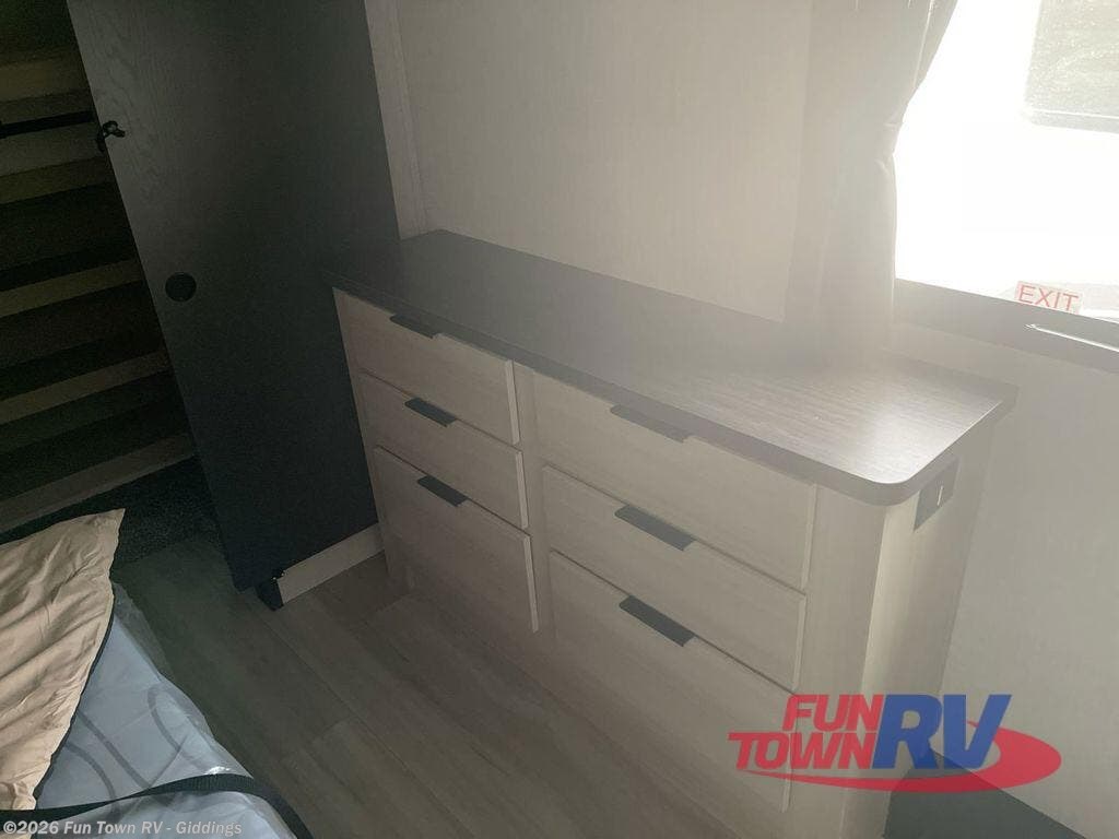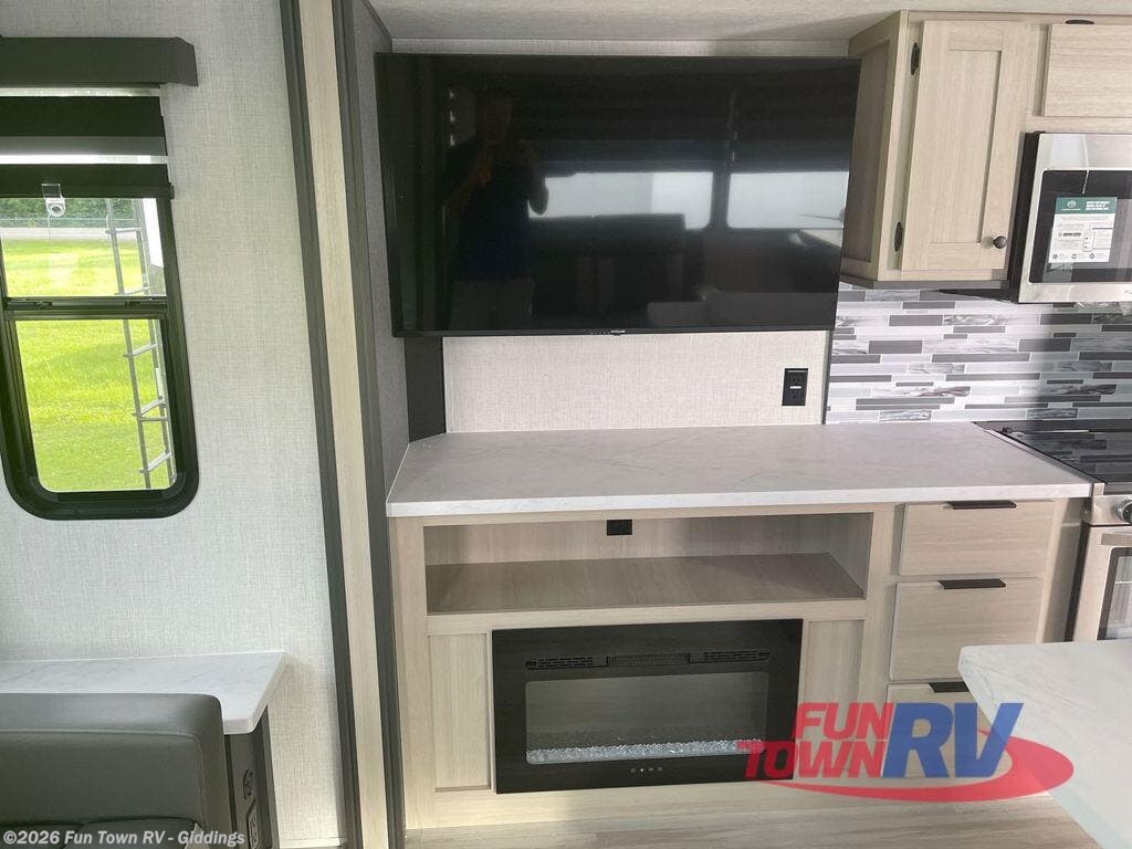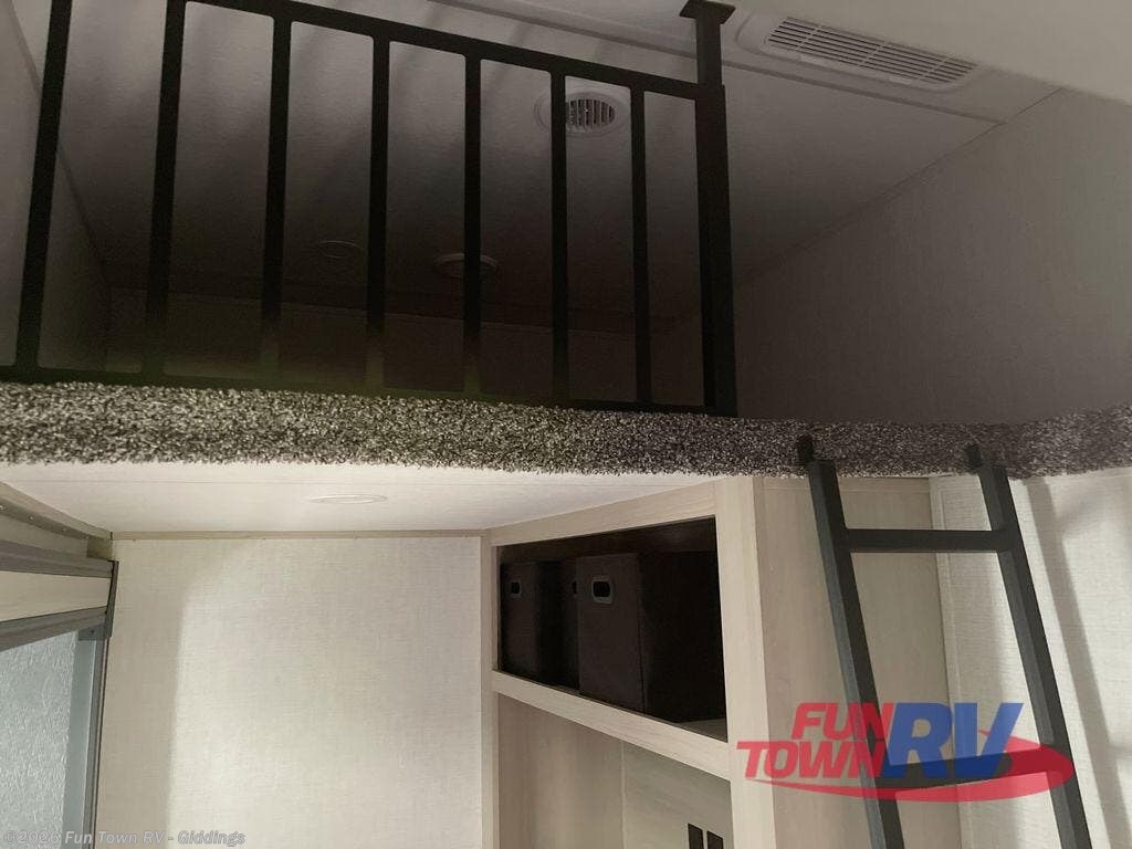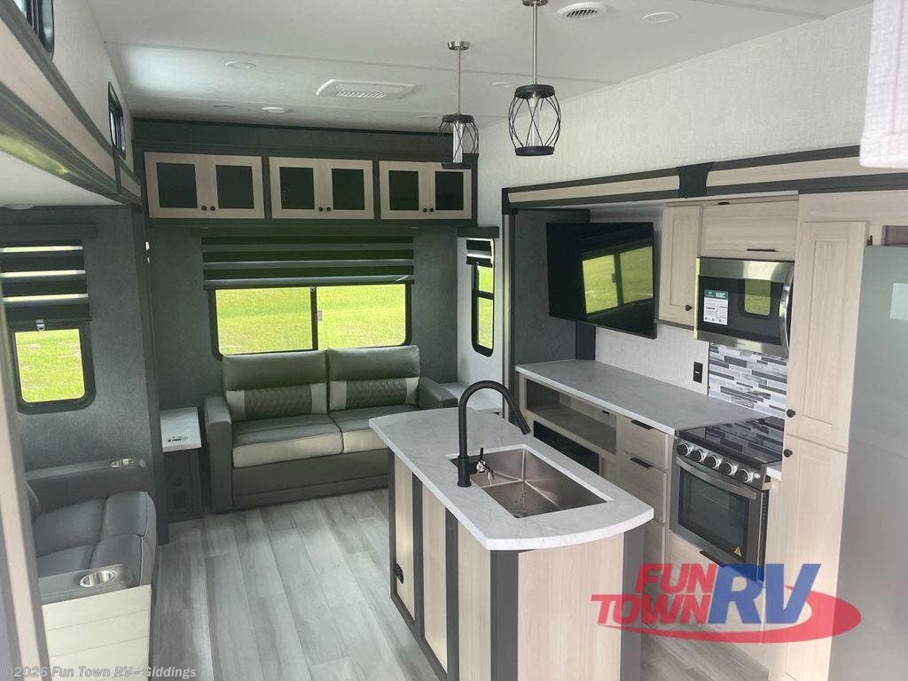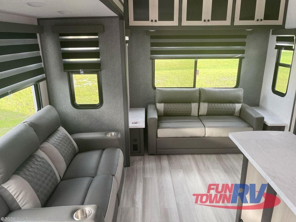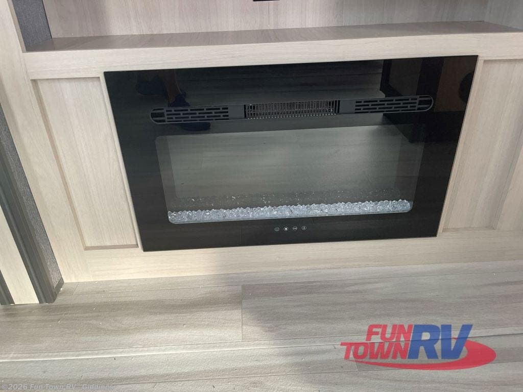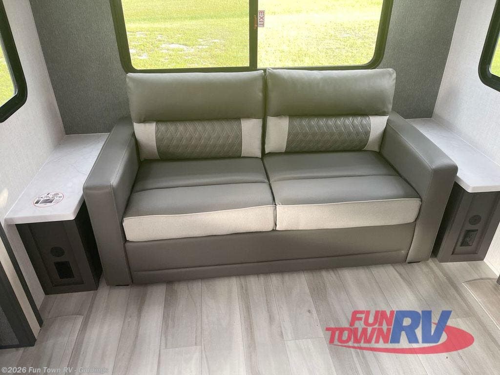 Wow! You won't believe the features found in this luxury fifth wheel that can sleep up to nine each night! Your guests or the kids will absolutely love the middle bunkroom with a hide-a-bed sofa and bunk beds plus a loft above for even more sleeping or storage space. There is also a desk/wardrobe here, which will allow you to utilize this space as an office as well! You'll have your own space in the front private bedroom on the king bed slide out, and there is a walk-in wardrobe to keep your clothes tidy. There is even washer and dryer prep for the option to keep those clothes clean! The chef of your group will have everything they need to prepare meals, including a 21" 2-in-1 oven range, an over-the-range microwave, a 16 cu. ft. 12V refrigerator, plus a kitchen island for more counter space. In the evenings, your crew can get cozy on the rear sofa and theater seats across from the entertainment center and fireplace, or you might just play a game at the hi-top table and chairs!