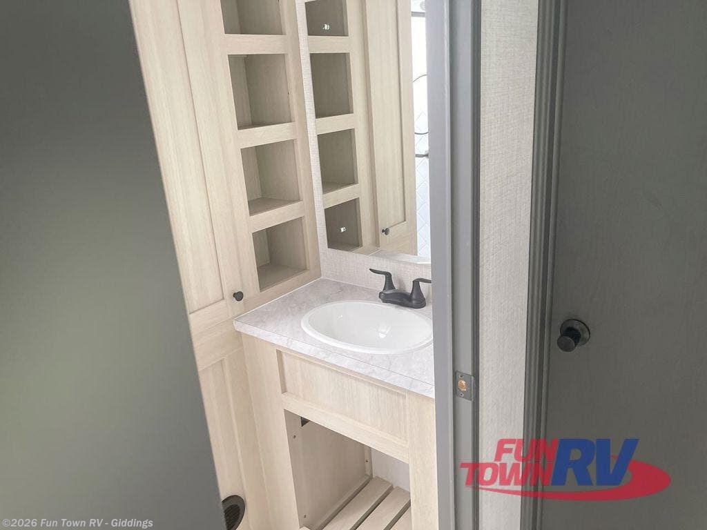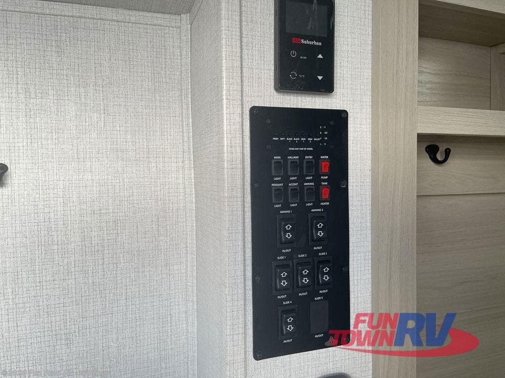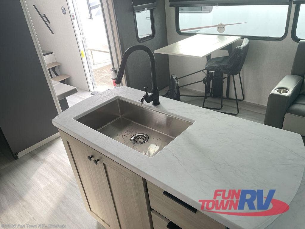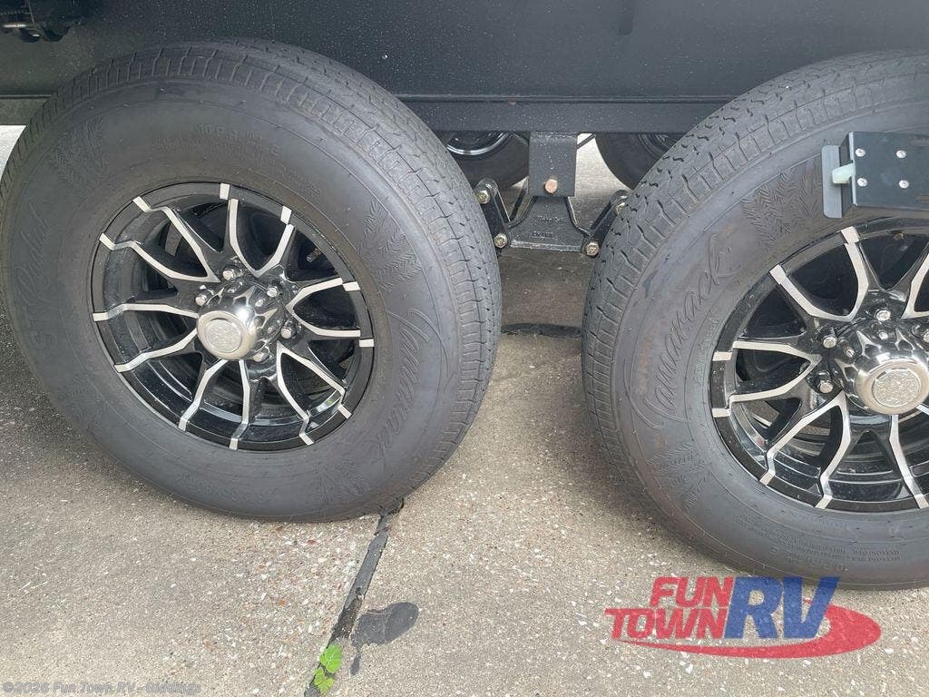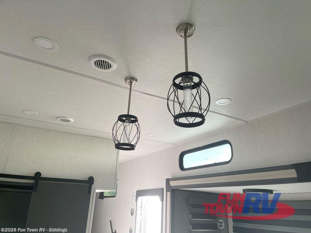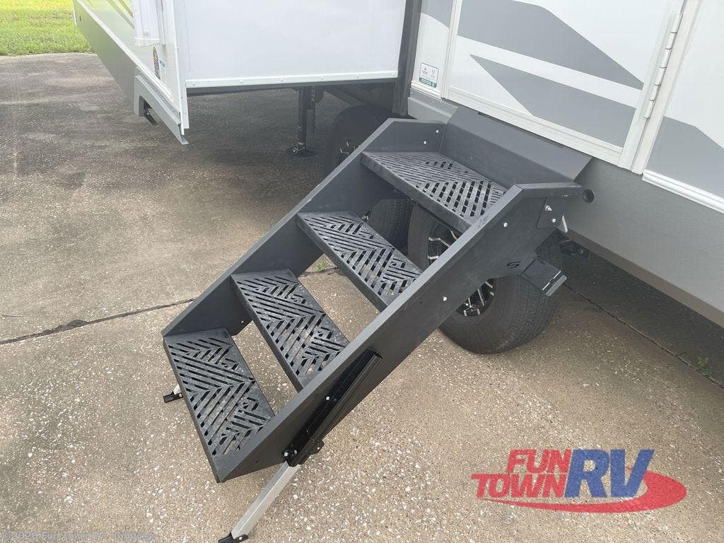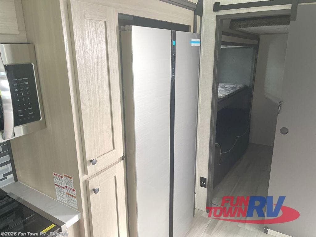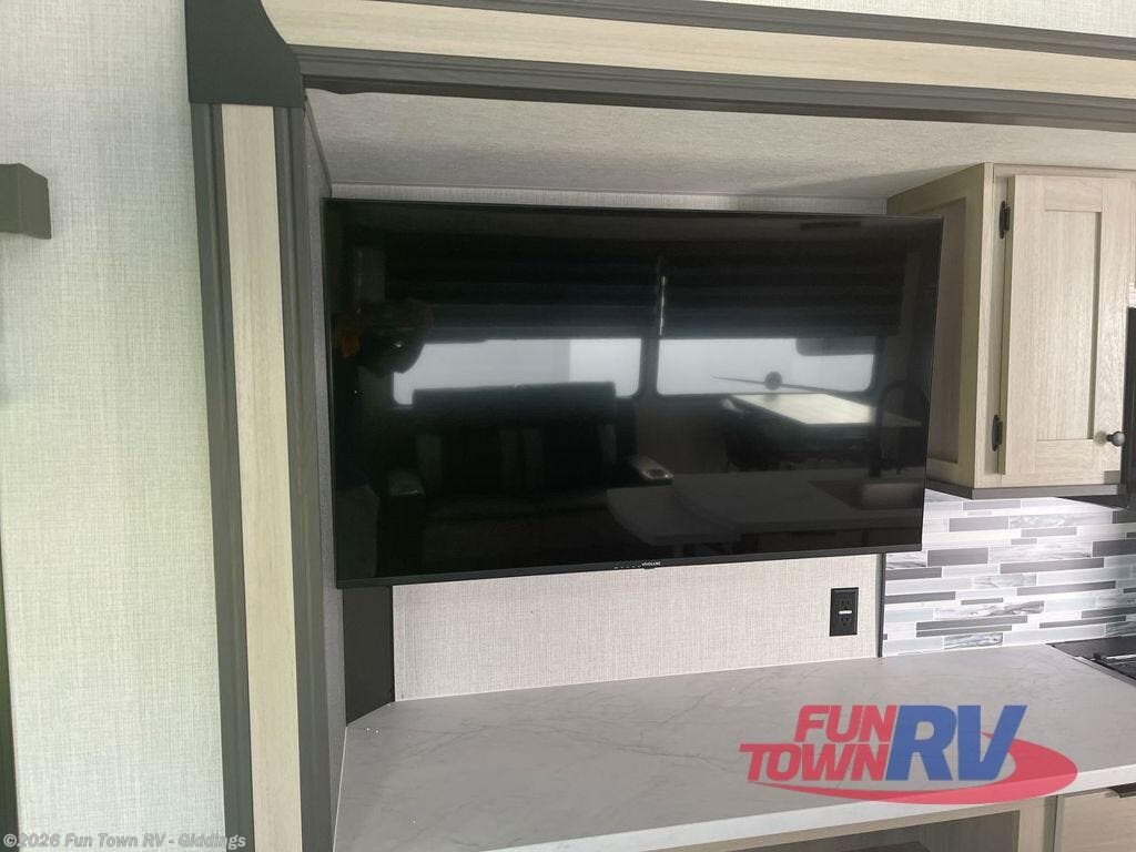 Wow! You won't believe the features found in this luxury fifth wheel that can sleep up to nine each night! Your guests or the kids will absolutely love the middle bunkroom with a hide-a-bed sofa and bunk beds plus a loft above for even more sleeping or storage space. There is also a desk/wardrobe here, which will allow you to utilize this space as an office as well! You'll have your own space in the front private bedroom on the king bed slide out, and there is a walk-in wardrobe to keep your clothes tidy. There is even washer and dryer prep for the option to keep those clothes clean! The chef of your group will have everything they need to prepare meals, including a 21" 2-in-1 oven range, an over-the-range microwave, a 16 cu. ft. 12V refrigerator, plus a kitchen island for more counter space. In the evenings, your crew can get cozy on the rear sofa and theater seats across from the entertainment center and fireplace, or you might just play a game at the hi-top table and chairs!