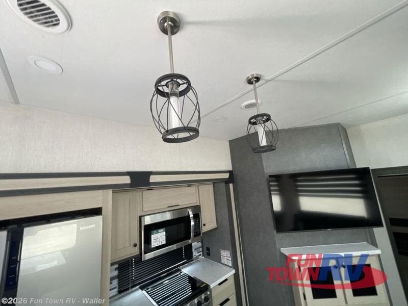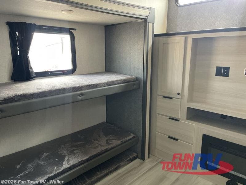 This fifth wheel's name describes it perfectly; it's the best! Your guests will love the rear private bunkhouse with dual opposing slides, bunk beds, plus a hide-a-bed sofa and an entertainment center with dual wardrobes. There is even a half bath with its own exterior entry door! You will have the front private bedroom all to yourselves with a king bed slide out and a walk-in wardrobe with washer and dryer prep. And the full bath is close by for easy nighttime use. The combined middle kitchen and living room will be a space everyone can meet in since there is a hi-top table and chairs and theater seating, an entertainment center with a fireplace, plus a kitchen island where snacks can be set out.