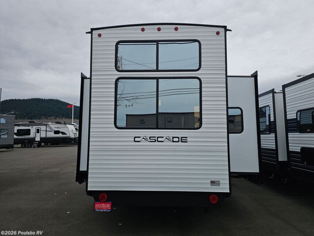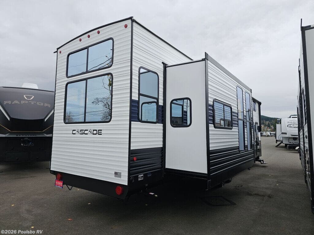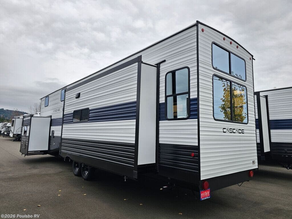 Discover the 2026 Forest River Cascade 39DL, an exceptional new RV crafted for families that value spaciousness, comfort, and everyday convenience during their travels. Measuring an impressive 42.65 feet in length, this model provides generous living and relaxation space for all your adventures. With three thoughtfully designed slide-outs, the Cascade 39DL enhances your living area, ensuring each member of the family can enjoy their own space. Accommodating up to six people, this RV is perfect not only for extended journeys but also for adventurous weekend escapes. A centrally located bunkhouse serves as a delightful hideaway for children, offering them a cozy space to rejuvenate after exciting days filled with exploration. For added residential comfort on longer trips, a stackable washer and dryer are included, making it easy to keep up with laundry wherever the road takes you. Designed for convenience, the RV also features an awning that extends your outdoor living options, making it an excellent choice for those who love to connect with nature. Weighing in with a dry weight of 10,778 pounds and a hitch weight of 1,095 pounds, it is easy to tow, allowing you to travel with confidence. The Cascade 39DL invites you and your family to embark on unforgettable journeys and create lasting memories together. As a family-owned, award-winning local RV dealer with multiple locations in Sumner, Everett, Kent, and Mt. Vernon, Washington, Poulsbo RV is here to help you find the perfect RV. Stock#: FCM663, VIN: 5ZT2CG4B5T1004403.