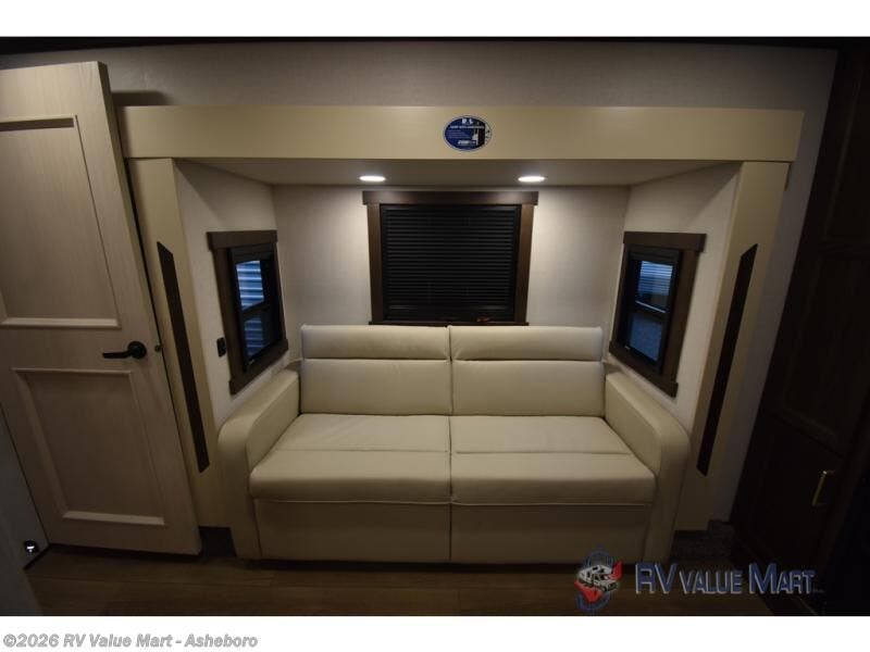 You won't believe all this fifth wheel has to offer! There is a convenient mud room right as you enter the unit where you can use the bench to take your shoes off and not drag dirt in the living areas. The front bedroom includes a jackknife sofa slide out, a half bath, plus a Murphy bed so this room can be used as a guest room! And the loft access is in this room to house more guests or use as storage space. Your crew will love to meet in the middle-combined kitchen and living area with power theater seats, a wall mounted dining table with an extension and an ottoman, plus a kitchen island a sink and plenty of counterspace. There is also a Murphy pantry hidden behind the entertainment center and all the appliances needed to make meals each day. You will be met with comfort in the master bedroom that includes a king bed slide out, a dresser and a TV, plus a full rear bath with dual bath sinks. You will also find a shower with a seat and drop-down storage under the rear bedroom/bathroom, so nothing gets left behind!