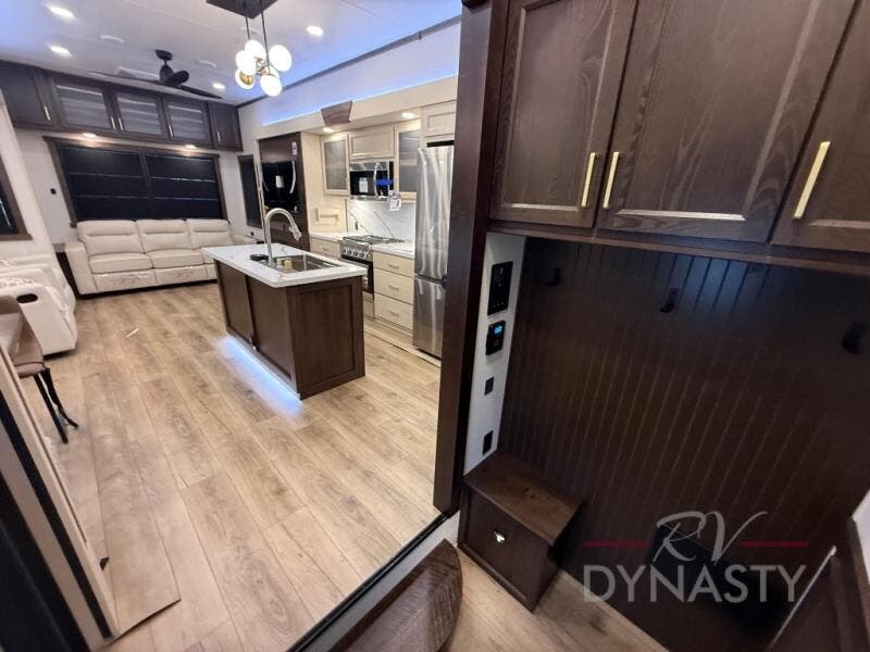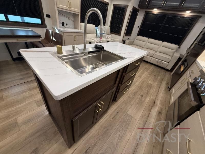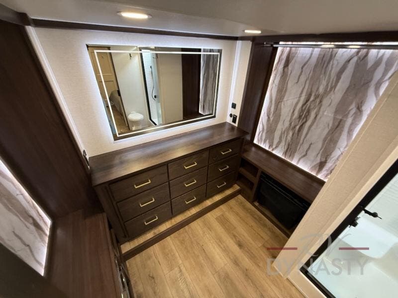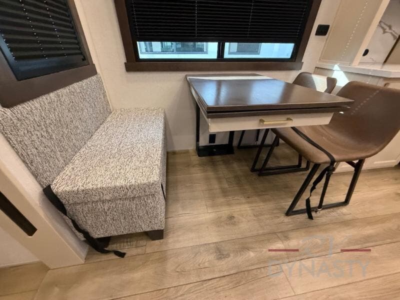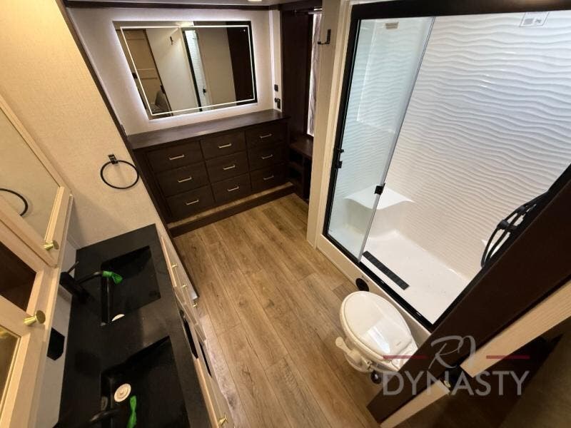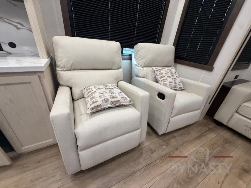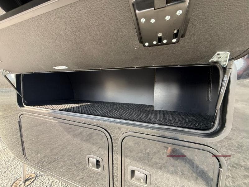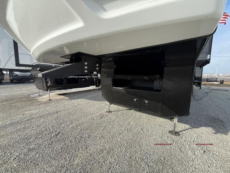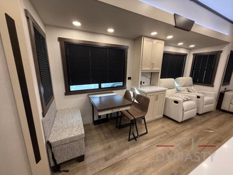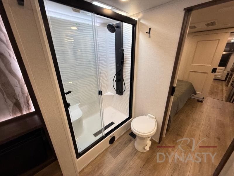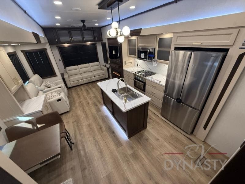 At the front of the 383FB fifth wheel, you’ll find a spacious front bathroom featuring a 48" x 30" shower with a built-in seat and upgraded shower head for a refreshing experience. The 18" high porcelain toilet includes a top circular flush system for added comfort, while LED motion night lighting beneath the vanity adds a convenient touch for nighttime use. This bathroom also provides a walk-in closet with a dresser and shelves equipped with hanging rods, perfect for keeping clothes and essentials neatly organized. Just next to the bathroom, the bedroom houses a king bed in a slide-out, offering plenty of room to stretch out and relax, with additional storage space located across from the bed. Moving toward the rear, the main living area and kitchen open up with dual opposing slides to maximize space and comfort. One slide features a Murphy pantry, a 3-burner gas oven, a 20-cu. ft. stainless steel refrigerator, and a 30" over-the-range microwave with an updated backsplash, while the central kitchen island provides a convenient workspace for the chef on board. Across the way, the opposite slide holds the recliner, table with chairs, and a bench, ideal for dining or lounging after a long day. At the very back, a hide-a-bed sofa offers additional seating and converts easily into extra sleeping space, making this fifth wheel as functional as it is comfortable.