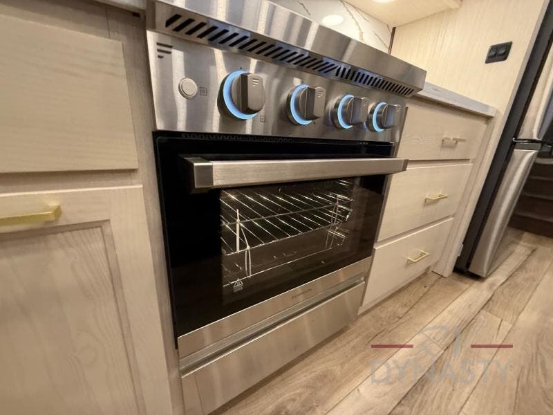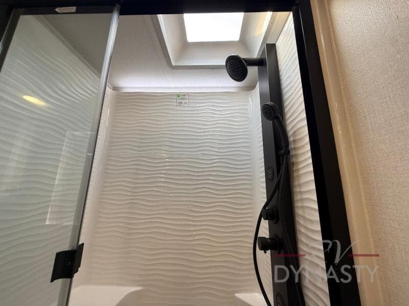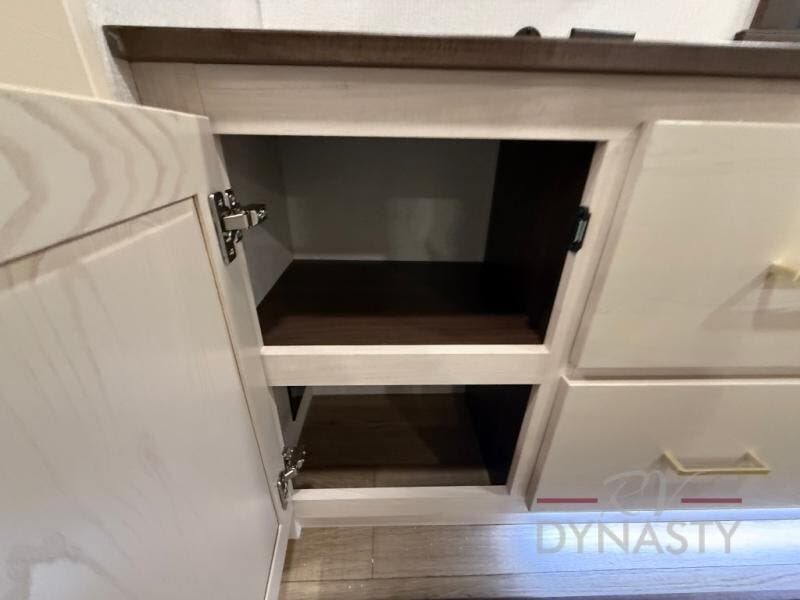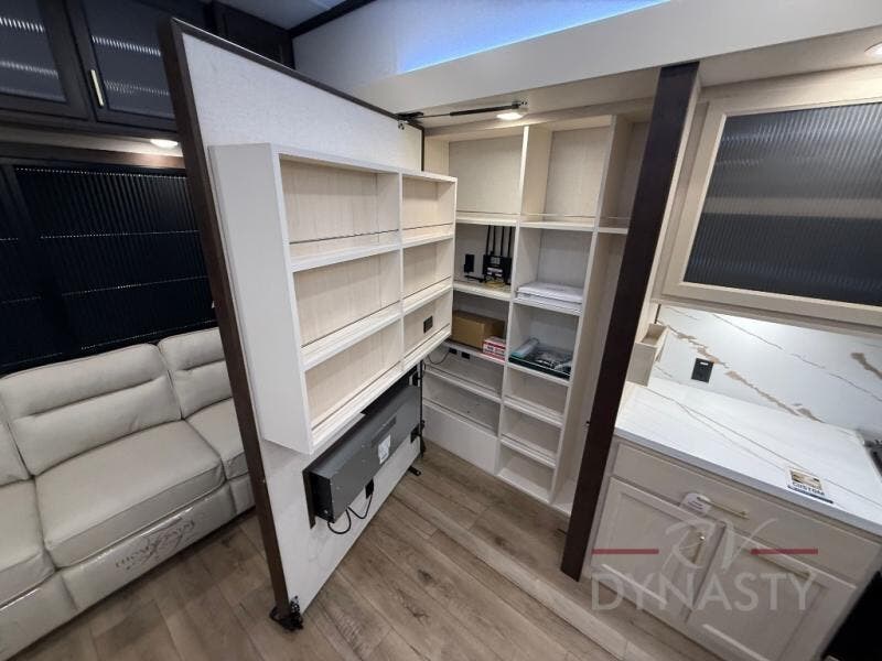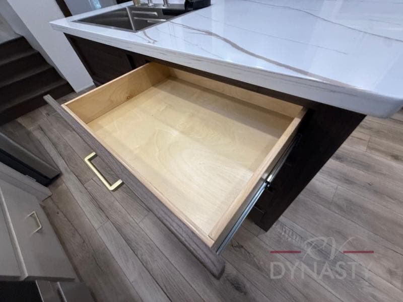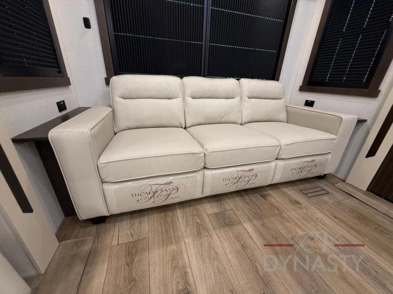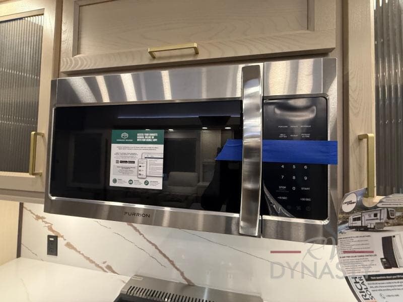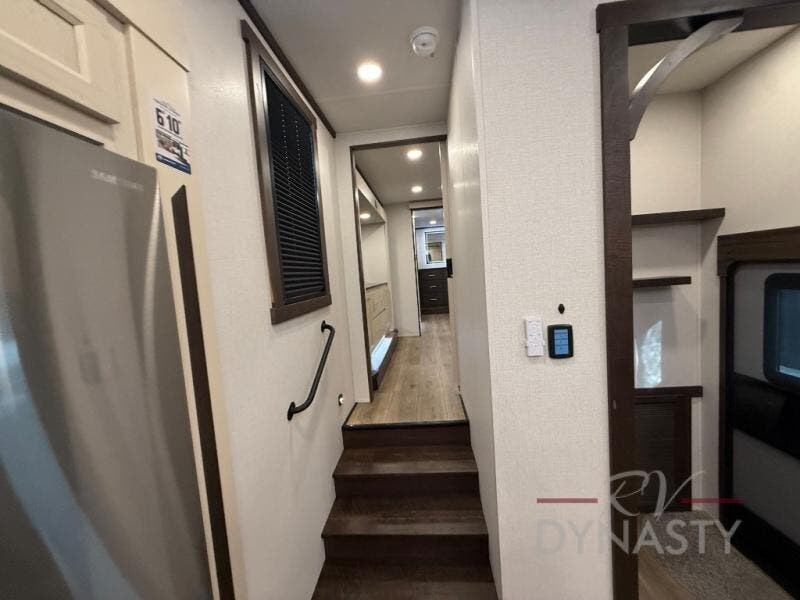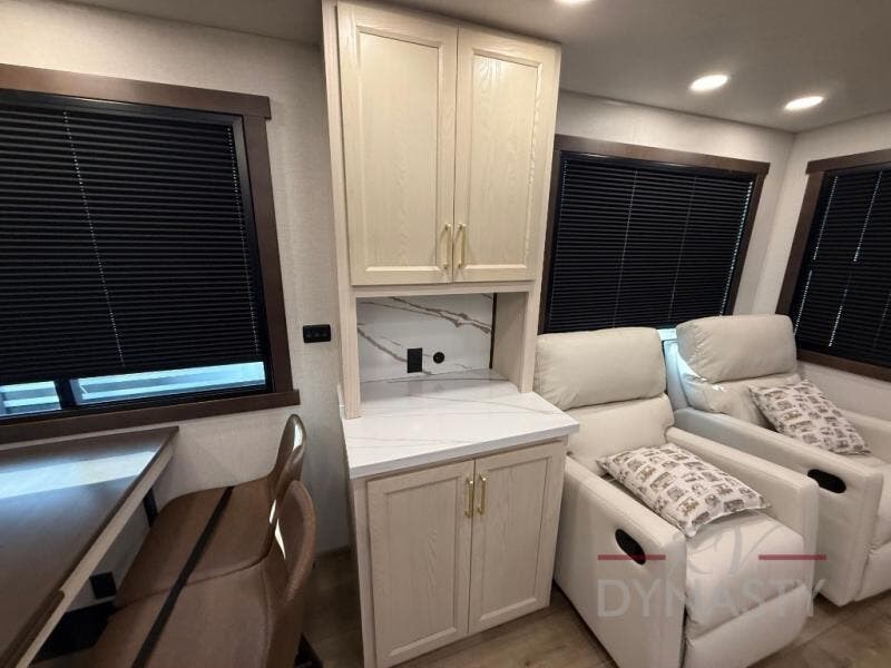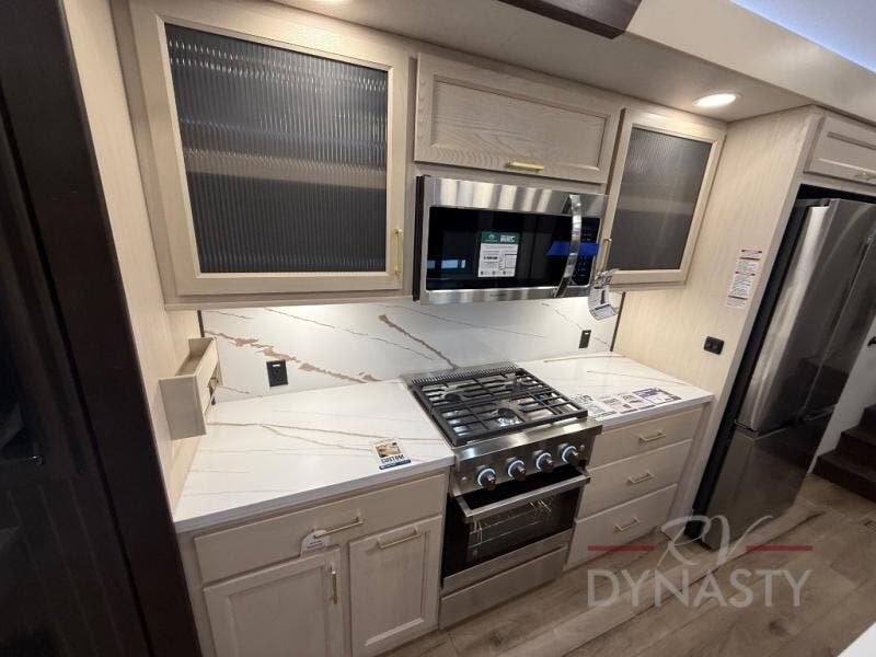 At the front of the 383FB fifth wheel, you’ll find a spacious front bathroom featuring a 48" x 30" shower with a built-in seat and upgraded shower head for a refreshing experience. The 18" high porcelain toilet includes a top circular flush system for added comfort, while LED motion night lighting beneath the vanity adds a convenient touch for nighttime use. This bathroom also provides a walk-in closet with a dresser and shelves equipped with hanging rods, perfect for keeping clothes and essentials neatly organized. Just next to the bathroom, the bedroom houses a king bed in a slide-out, offering plenty of room to stretch out and relax, with additional storage space located across from the bed. Moving toward the rear, the main living area and kitchen open up with dual opposing slides to maximize space and comfort. One slide features a Murphy pantry, a 3-burner gas oven, a 20-cu. ft. stainless steel refrigerator, and a 30" over-the-range microwave with an updated backsplash, while the central kitchen island provides a convenient workspace for the chef on board. Across the way, the opposite slide holds the recliner, table with chairs, and a bench, ideal for dining or lounging after a long day. At the very back, a hide-a-bed sofa offers additional seating and converts easily into extra sleeping space, making this fifth wheel as functional as it is comfortable.
