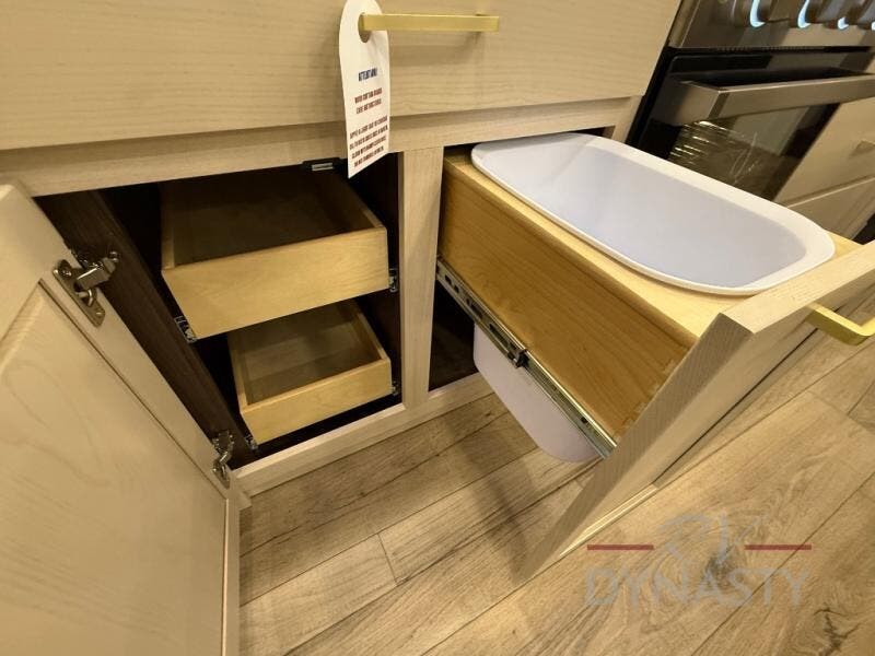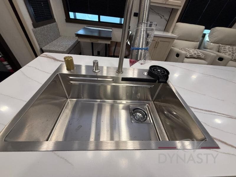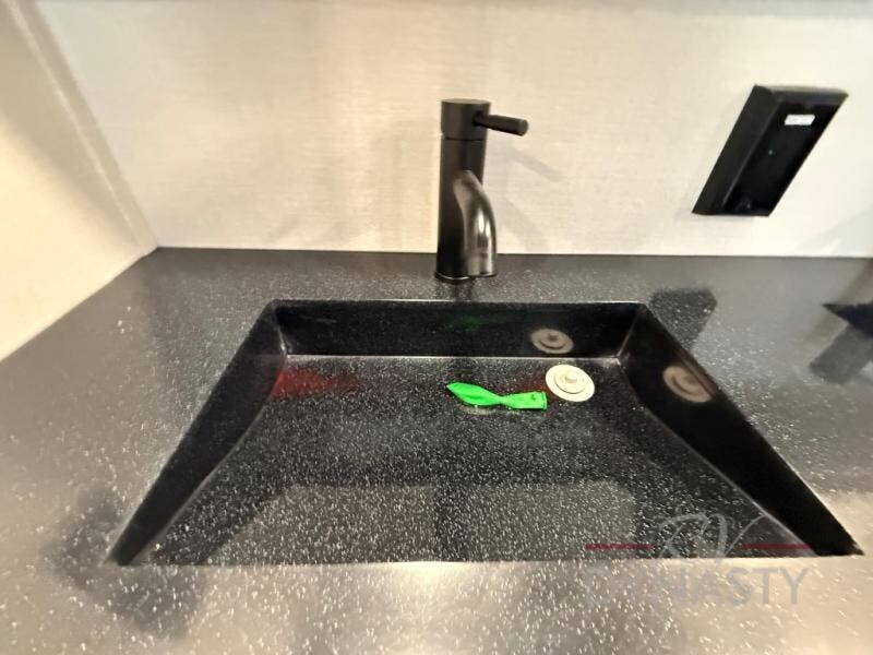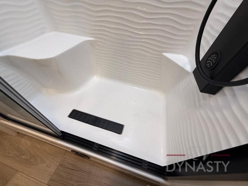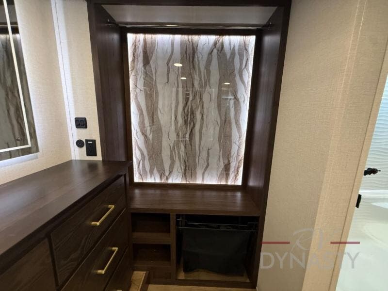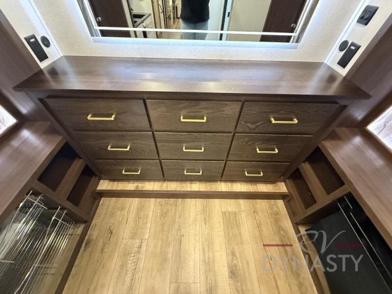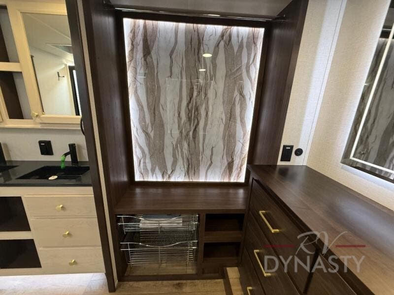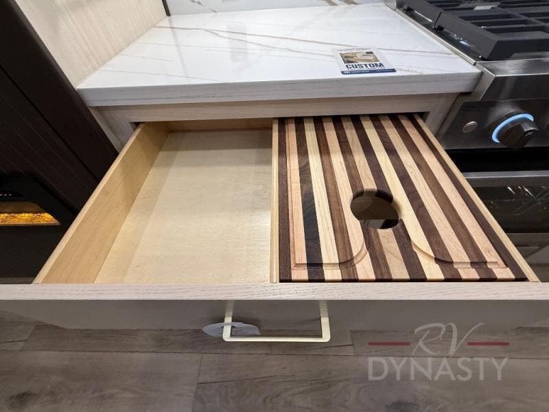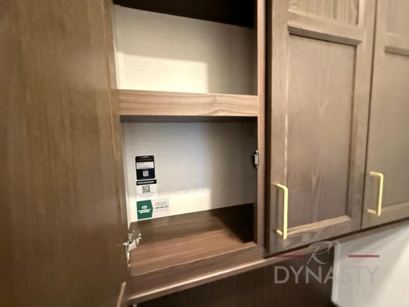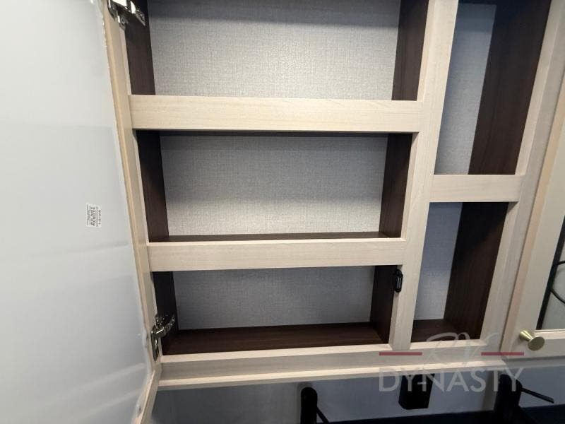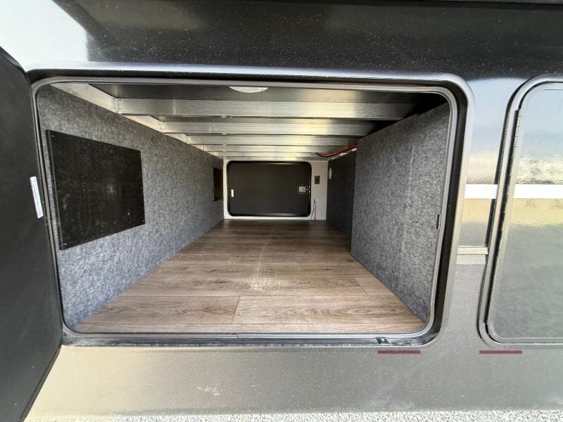 At the front of the 383FB fifth wheel, you’ll find a spacious front bathroom featuring a 48" x 30" shower with a built-in seat and upgraded shower head for a refreshing experience. The 18" high porcelain toilet includes a top circular flush system for added comfort, while LED motion night lighting beneath the vanity adds a convenient touch for nighttime use. This bathroom also provides a walk-in closet with a dresser and shelves equipped with hanging rods, perfect for keeping clothes and essentials neatly organized. Just next to the bathroom, the bedroom houses a king bed in a slide-out, offering plenty of room to stretch out and relax, with additional storage space located across from the bed. Moving toward the rear, the main living area and kitchen open up with dual opposing slides to maximize space and comfort. One slide features a Murphy pantry, a 3-burner gas oven, a 20-cu. ft. stainless steel refrigerator, and a 30" over-the-range microwave with an updated backsplash, while the central kitchen island provides a convenient workspace for the chef on board. Across the way, the opposite slide holds the recliner, table with chairs, and a bench, ideal for dining or lounging after a long day. At the very back, a hide-a-bed sofa offers additional seating and converts easily into extra sleeping space, making this fifth wheel as functional as it is comfortable.