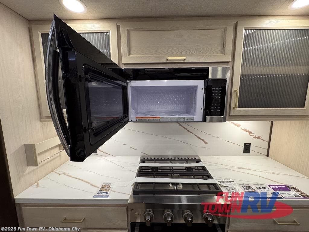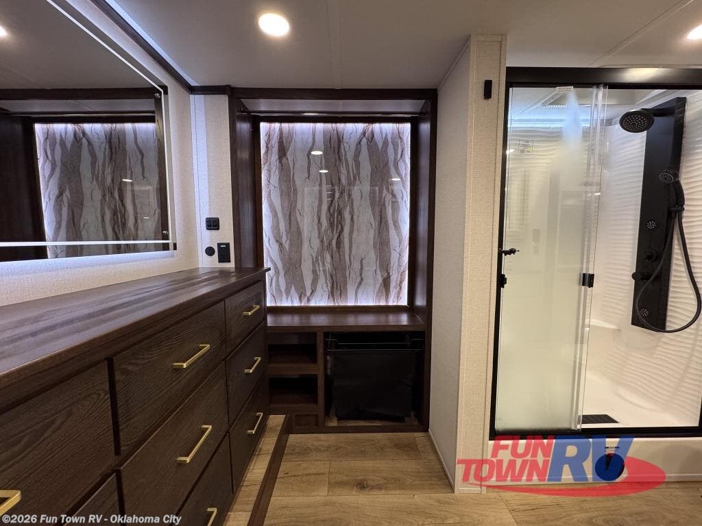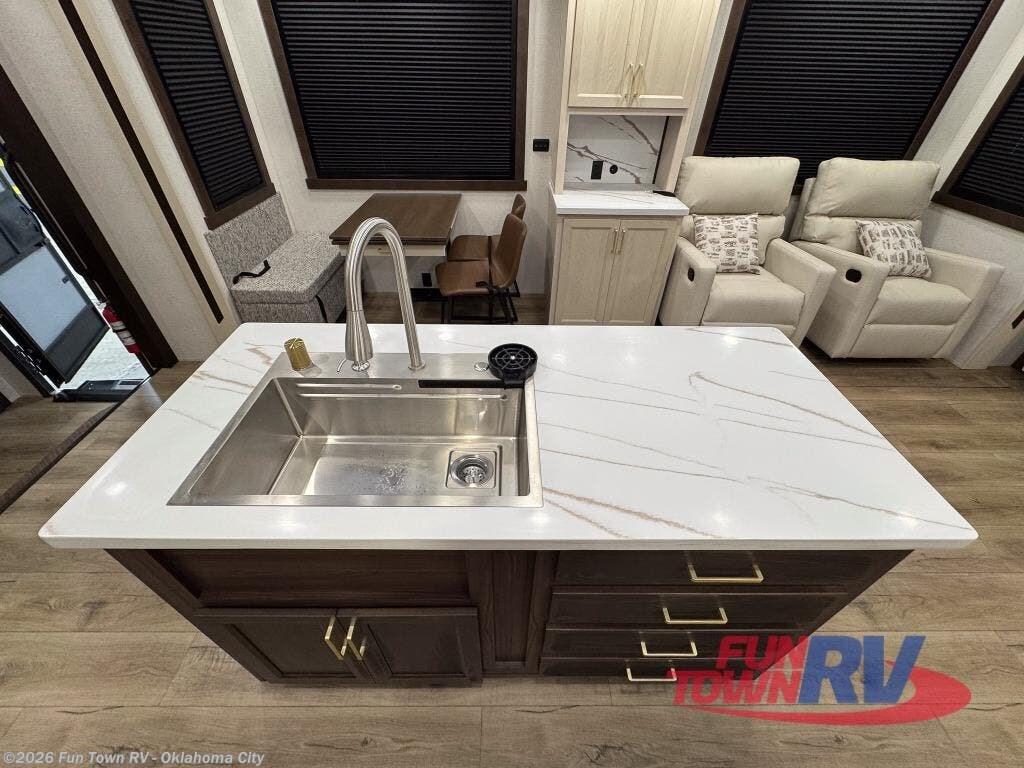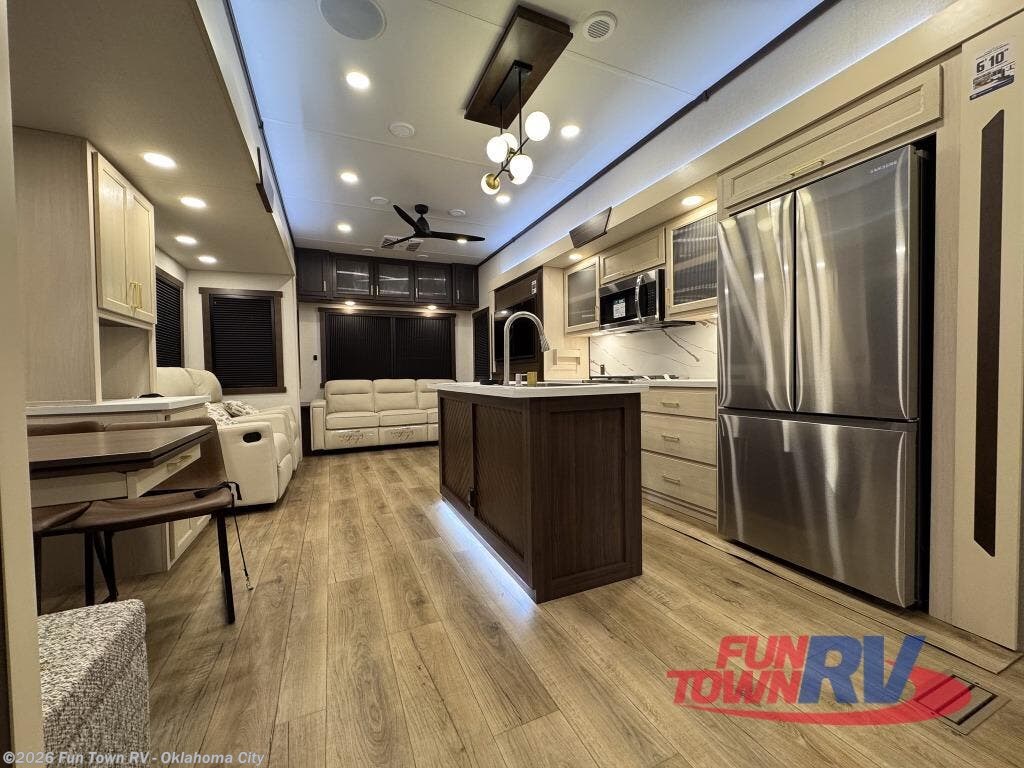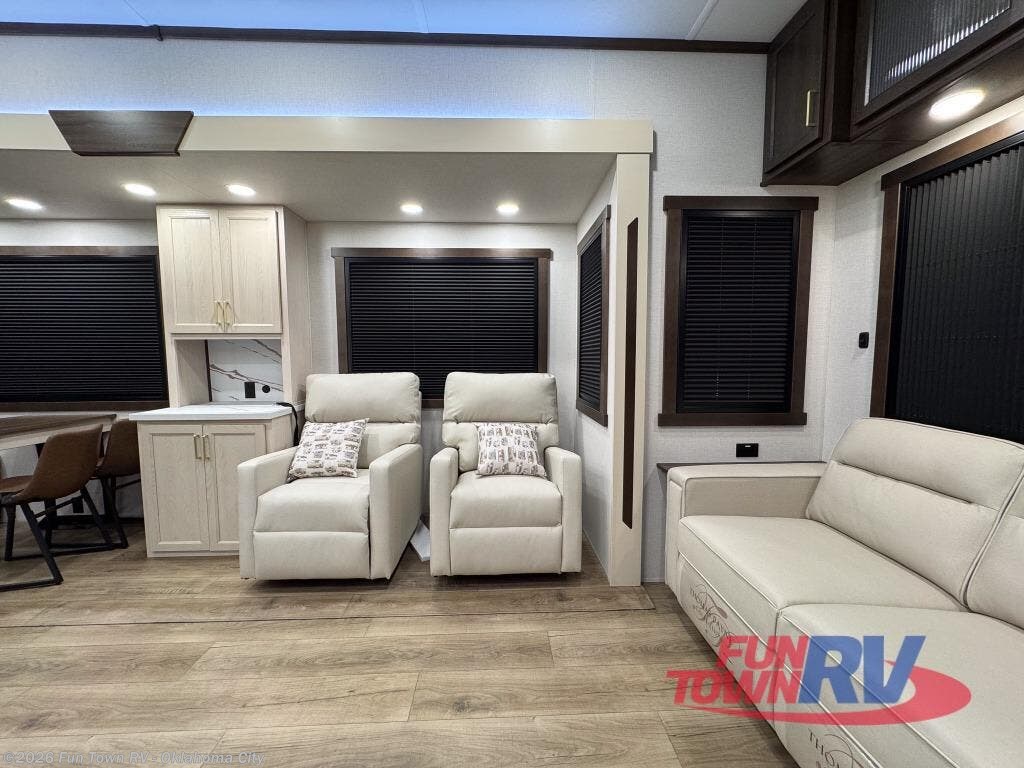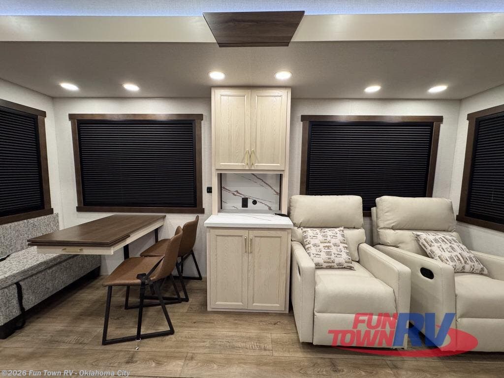 At the front of the 383FB fifth wheel, you’ll find a spacious front bathroom featuring a 48" x 30" shower with a built-in seat and upgraded shower head for a refreshing experience. The 18" high porcelain toilet includes a top circular flush system for added comfort, while LED motion night lighting beneath the vanity adds a convenient touch for nighttime use. This bathroom also provides a walk-in closet with a dresser and shelves equipped with hanging rods, perfect for keeping clothes and essentials neatly organized. Just next to the bathroom, the bedroom houses a king bed in a slide-out, offering plenty of room to stretch out and relax, with additional storage space located across from the bed. Moving toward the rear, the main living area and kitchen open up with dual opposing slides to maximize space and comfort. One slide features a Murphy pantry, a 3-burner gas oven, a 20-cu. ft. stainless steel refrigerator, and a 30" over-the-range microwave with an updated backsplash, while the central kitchen island provides a convenient workspace for the chef on board. Across the way, the opposite slide holds the recliner, table with chairs, and a bench, ideal for dining or lounging after a long day. At the very back, a hide-a-bed sofa offers additional seating and converts easily into extra sleeping space, making this fifth wheel as functional as it is comfortable.
