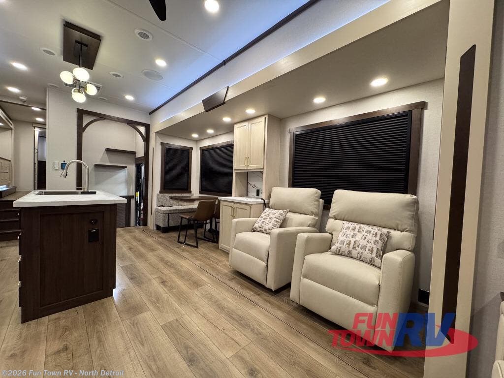 At the front of the 383FB fifth wheel, you’ll find a spacious front bathroom featuring a 48" x 30" shower with a built-in seat and upgraded shower head for a refreshing experience. The 18" high porcelain toilet includes a top circular flush system for added comfort, while LED motion night lighting beneath the vanity adds a convenient touch for nighttime use. This bathroom also provides a walk-in closet with a dresser and shelves equipped with hanging rods, perfect for keeping clothes and essentials neatly organized. Just next to the bathroom, the bedroom houses a king bed in a slide-out, offering plenty of room to stretch out and relax, with additional storage space located across from the bed. Moving toward the rear, the main living area and kitchen open up with dual opposing slides to maximize space and comfort. One slide features a Murphy pantry, a 3-burner gas oven, a 20-cu. ft. stainless steel refrigerator, and a 30" over-the-range microwave with an updated backsplash, while the central kitchen island provides a convenient workspace for the chef on board. Across the way, the opposite slide holds the recliner, table with chairs, and a bench, ideal for dining or lounging after a long day. At the very back, a hide-a-bed sofa offers additional seating and converts easily into extra sleeping space, making this fifth wheel as functional as it is comfortable.