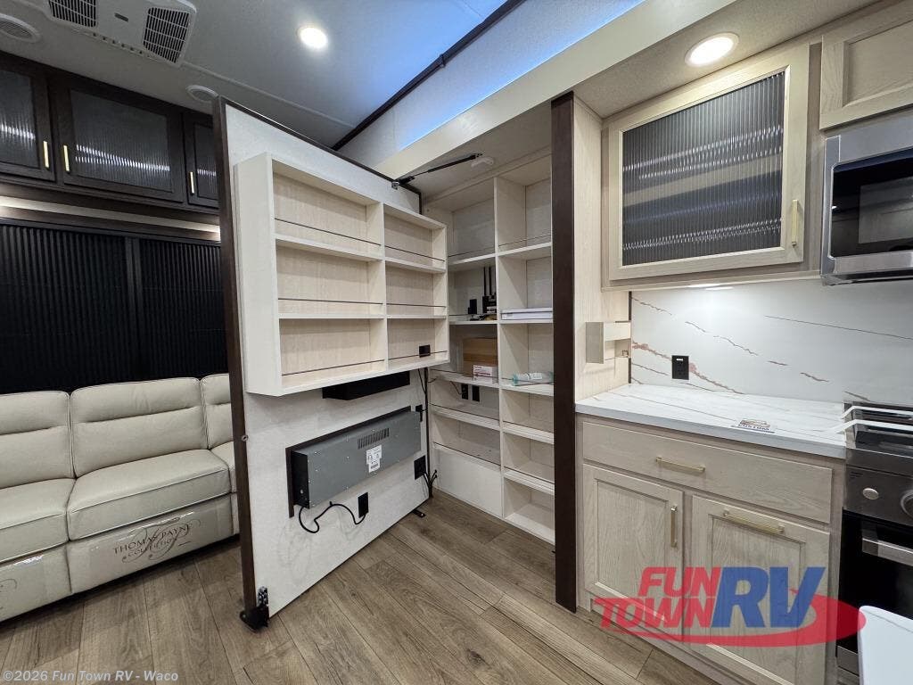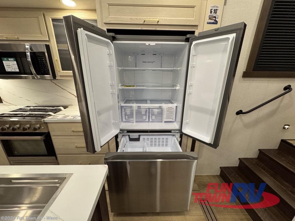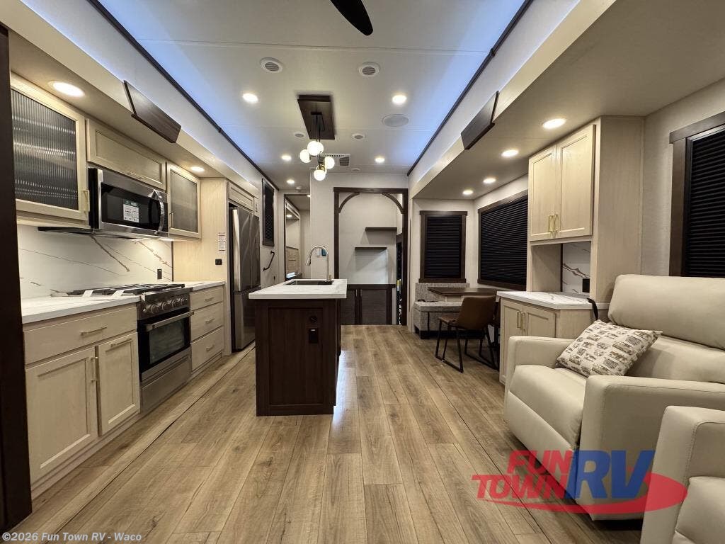 At the front of the 383FB fifth wheel, you’ll find a spacious front bathroom featuring a 48" x 30" shower with a built-in seat and upgraded shower head for a refreshing experience. The 18" high porcelain toilet includes a top circular flush system for added comfort, while LED motion night lighting beneath the vanity adds a convenient touch for nighttime use. This bathroom also provides a walk-in closet with a dresser and shelves equipped with hanging rods, perfect for keeping clothes and essentials neatly organized. Just next to the bathroom, the bedroom houses a king bed in a slide-out, offering plenty of room to stretch out and relax, with additional storage space located across from the bed. Moving toward the rear, the main living area and kitchen open up with dual opposing slides to maximize space and comfort. One slide features a Murphy pantry, a 3-burner gas oven, a 20-cu. ft. stainless steel refrigerator, and a 30" over-the-range microwave with an updated backsplash, while the central kitchen island provides a convenient workspace for the chef on board. Across the way, the opposite slide holds the recliner, table with chairs, and a bench, ideal for dining or lounging after a long day. At the very back, a hide-a-bed sofa offers additional seating and converts easily into extra sleeping space, making this fifth wheel as functional as it is comfortable.