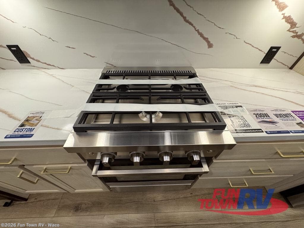 With any Cedar Creek fifth wheel by Forest River, you will find a quality-built RV with your comfort in mind! The all-aluminum super structure on 16" centers or less will provide a solid foundation to your fifth wheel, and the 3M bonded sidewalls will hold up and provide resistance to UV, heat, cold moisture, and even highway chemicals. Each model also includes a Road Warrior suspension for smooth towing, a 6-Point Hydraulic, GEN 3 Leveling System, and a new 101" wide body frame. Inside, you'll enjoy walnut/two tone wooden cabinetry with hidden hinges, cutting board drawer with cut-out trash funnel, motion lighting in the bath and bedroom closet, plus many more comforts. The New Travelfi™ Pay-as-you go internet provides the ability to bring your own internet rather than relying solely on campground WiFi, and the "Rich Solar" 200W solar panel will give you off-grid capabilities!