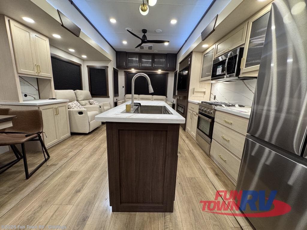 At the front of the 383FB fifth wheel, you’ll find a spacious front bathroom featuring a 48" x 30" shower with a built-in seat and upgraded shower head for a refreshing experience. The 18" high porcelain toilet includes a top circular flush system for added comfort, while LED motion night lighting beneath the vanity adds a convenient touch for nighttime use. This bathroom also provides a walk-in closet with a dresser and shelves equipped with hanging rods, perfect for keeping clothes and essentials neatly organized. Just next to the bathroom, the bedroom houses a king bed in a slide-out, offering plenty of room to stretch out and relax, with additional storage space located across from the bed. Moving toward the rear, the main living area and kitchen open up with dual opposing slides to maximize space and comfort. One slide features a Murphy pantry, a 3-burner gas oven, a 20-cu. ft. stainless steel refrigerator, and a 30" over-the-range microwave with an updated backsplash, while the central kitchen island provides a convenient workspace for the chef on board. Across the way, the opposite slide holds the recliner, table with chairs, and a bench, ideal for dining or lounging after a long day. At the very back, a hide-a-bed sofa offers additional seating and converts easily into extra sleeping space, making this fifth wheel as functional as it is comfortable.