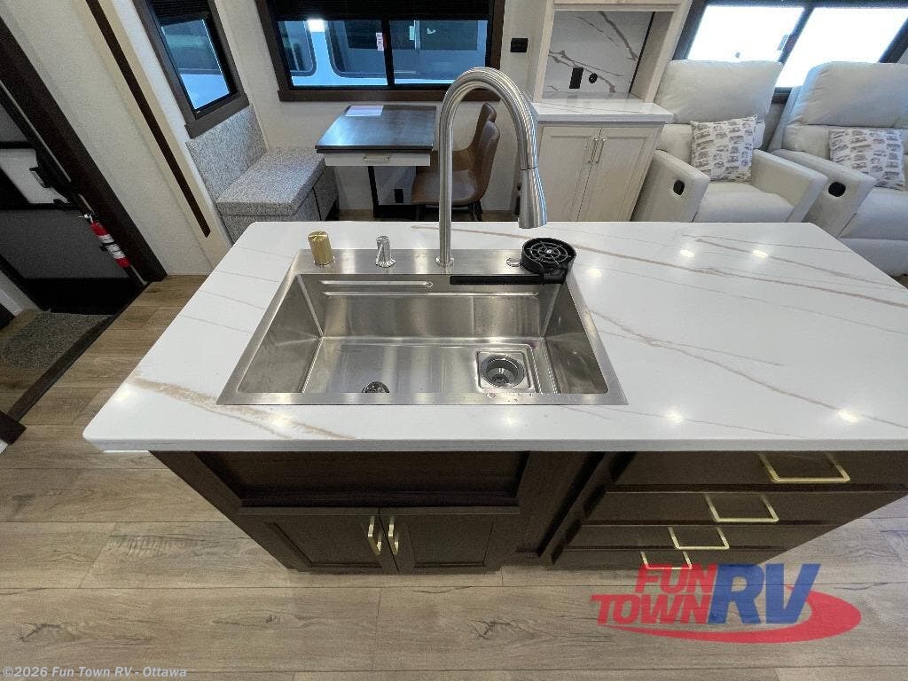 At the front of the 383FB fifth wheel, you’ll find a spacious front bathroom featuring a 48" x 30" shower with a built-in seat and upgraded shower head for a refreshing experience. The 18" high porcelain toilet includes a top circular flush system for added comfort, while LED motion night lighting beneath the vanity adds a convenient touch for nighttime use. This bathroom also provides a walk-in closet with a dresser and shelves equipped with hanging rods, perfect for keeping clothes and essentials neatly organized. Just next to the bathroom, the bedroom houses a king bed in a slide-out, offering plenty of room to stretch out and relax, with additional storage space located across from the bed. Moving toward the rear, the main living area and kitchen open up with dual opposing slides to maximize space and comfort. One slide features a Murphy pantry, a 3-burner gas oven, a 20-cu. ft. stainless steel refrigerator, and a 30" over-the-range microwave with an updated backsplash, while the central kitchen island provides a convenient workspace for the chef on board. Across the way, the opposite slide holds the recliner, table with chairs, and a bench, ideal for dining or lounging after a long day. At the very back, a hide-a-bed sofa offers additional seating and converts easily into extra sleeping space, making this fifth wheel as functional as it is comfortable.