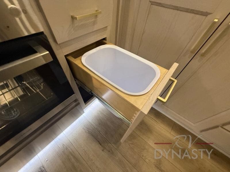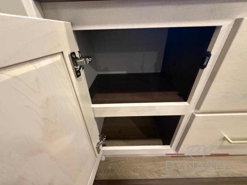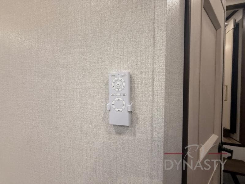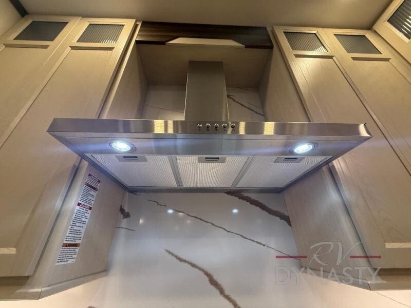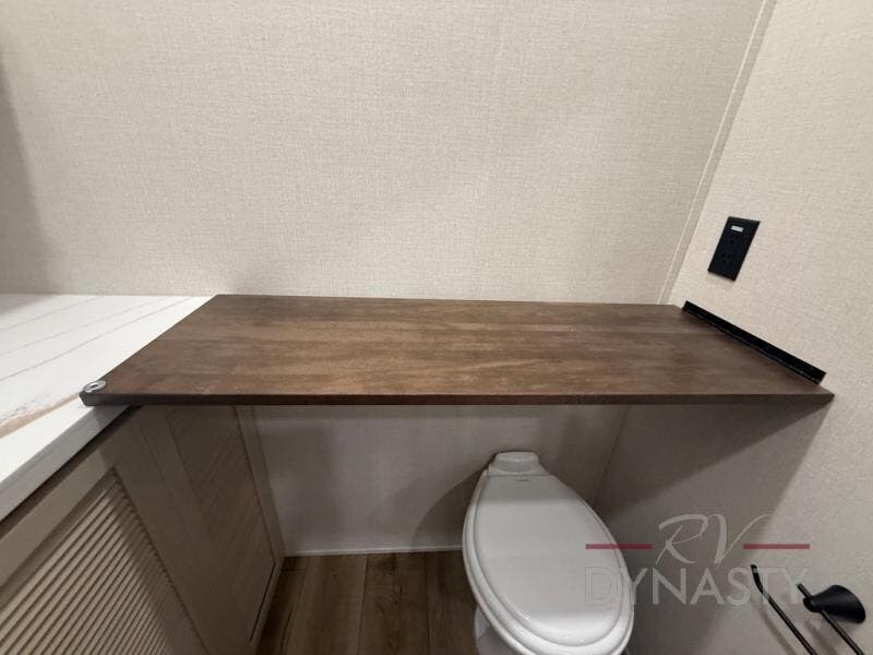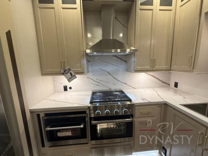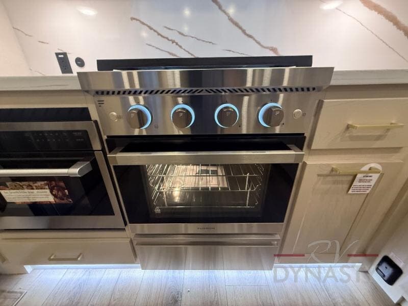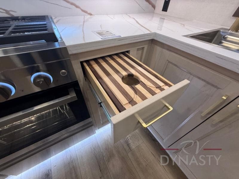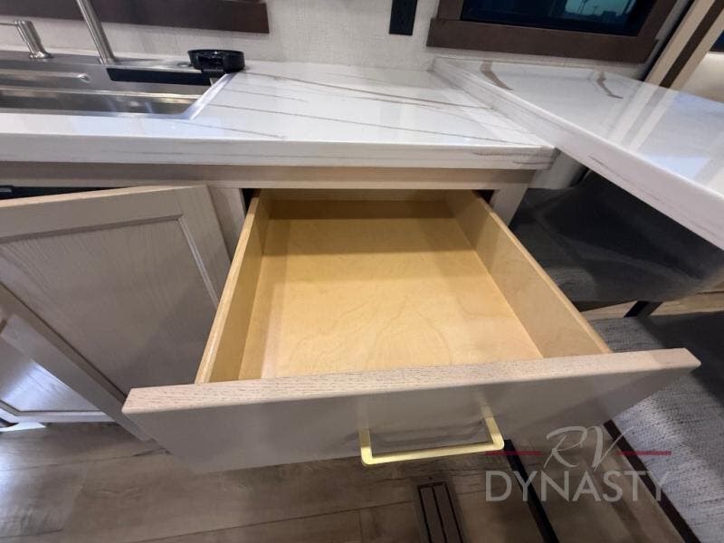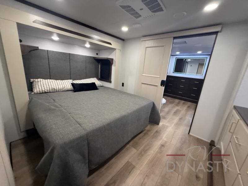 At the front of this 385RK fifth wheel, you’ll find a full bathroom featuring a spacious shower with a built-in seat and convenient LED motion night lighting under the vanity for added comfort. Adjacent to the bathroom is a walk-in closet complete with a dresser and hanging rods, offering ample storage for clothing and gear. Next to this area is the bedroom, which houses a 72" x 80" king bed set in a slide-out for a restful night’s sleep. Across from the bed sits another dresser with a TV, providing extra storage and entertainment. Moving toward the center, a half bath is conveniently located across from the entrance for easy access. The living area opens up with dual opposing slides, creating a roomy lounge space featuring a sectional sofa and an entertainment center with a TV and fireplace, perfect for cozy movie nights. At the rear, the U-shaped kitchen invites the chef of the trip to cook to their heart’s content, equipped with ample overhead cabinets, a 20-cu. ft. stainless steel refrigerator, a 30" stainless steel over-the-range microwave with an updated backsplash, and a 3-burner gas oven with a pull-out pan drawer. Meals can be enjoyed at the convenient bartop with stools to the side, making this fifth wheel both stylish and functional.