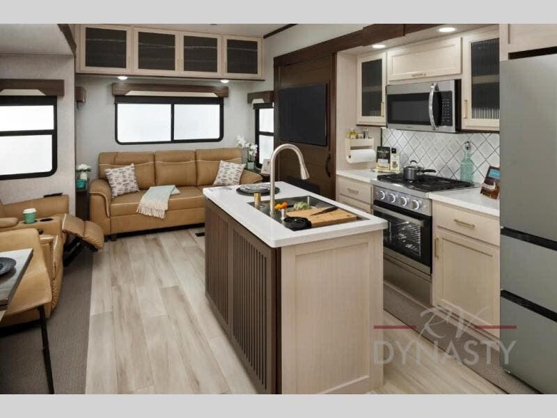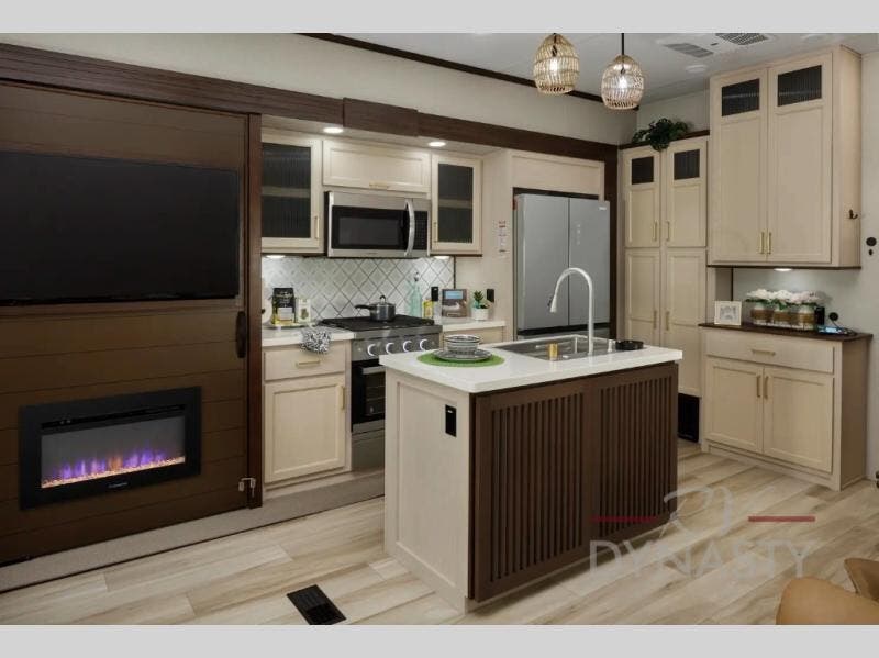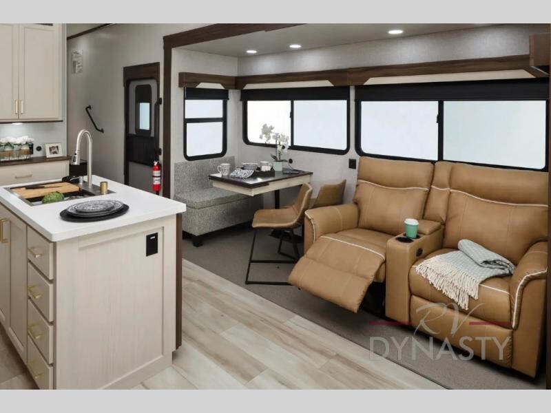 This is the perfect fifth wheel to camp with family or neighbor friends since there are two bedrooms, one of which is a master bedroom with a full rear bath. The second full bath is up front, and both bedrooms include a king bed slide out for added comfort. There is even a loft above the rear bedroom, complete with two bunk mats, two cabinets, and a TV hookup. Everyone can meet in the combined kitchen and living room to enjoy the swivel mounted TV and fireplace across from the theater seating. There is also a wall-mounted dining table with an extension and ottoman.
