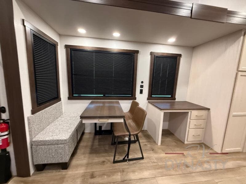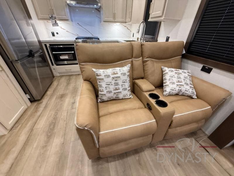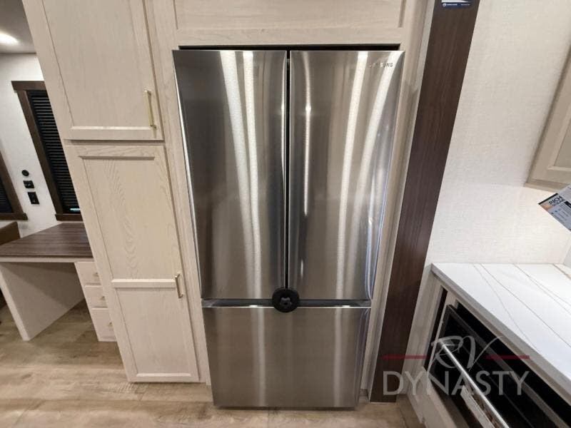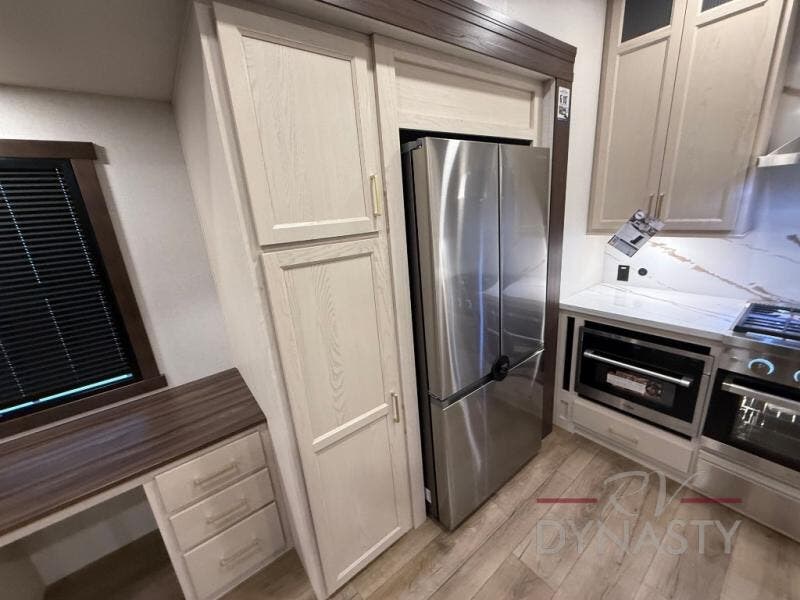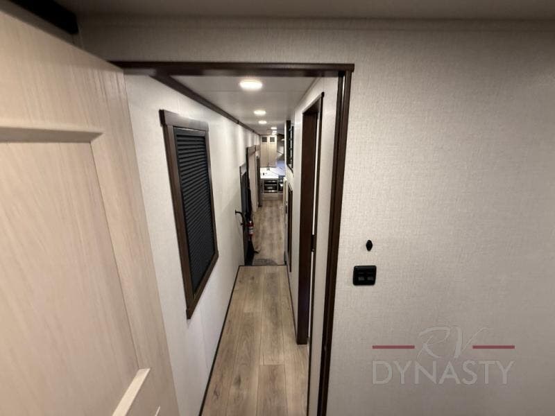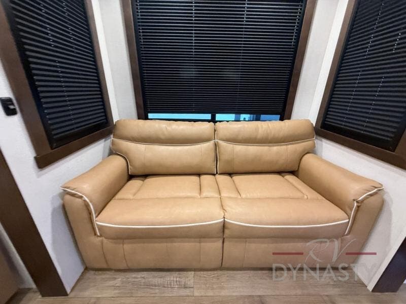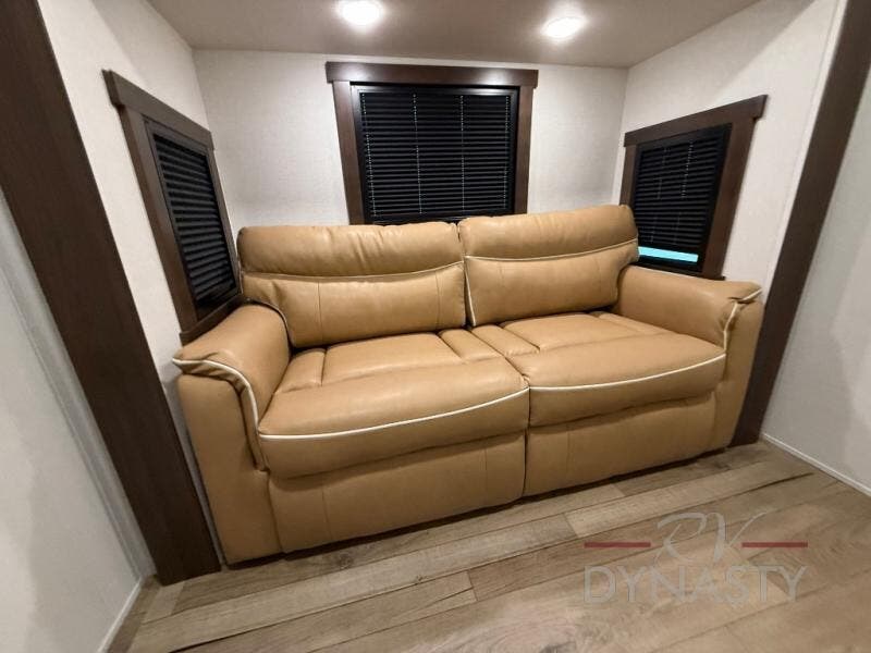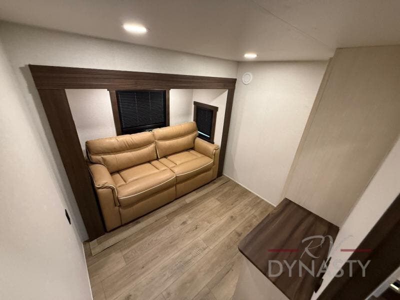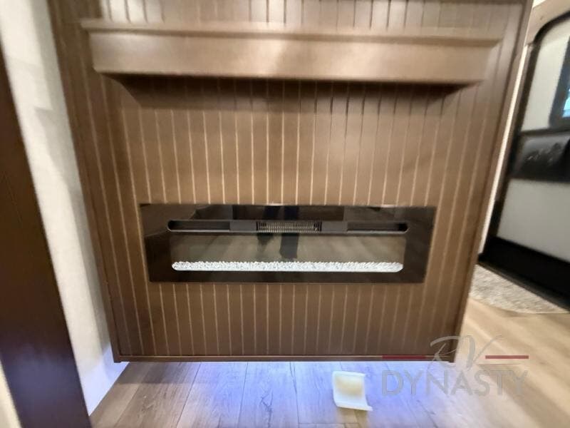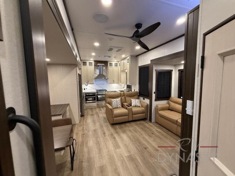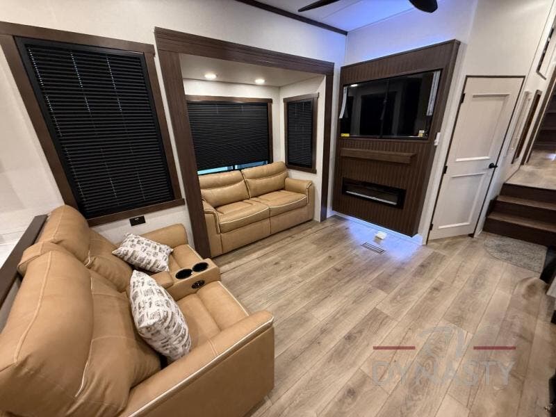 At the front of the 39RKB fifth wheel, you’ll find the main bedroom featuring a king bed in a slide-out for a restful night’s sleep. This area also includes a large wardrobe with shelves and a dresser topped with a TV, offering plenty of storage for clothing and personal essentials. Moving down the hall, the full bathroom provides a touch of comfort and convenience with a shower featuring an upgraded shower head, an 18" high porcelain toilet with a top circular flush system, and linen shelves for added storage. In the center, a versatile middle room offers additional sleeping space with a 66" hide-a-bed sofa and a closet for extra storage, perfect for accommodating guests. Toward the rear, the living area and kitchen create a warm, inviting space for relaxation and entertainment. The living room includes another hide-a-bed sofa in one slide-out for both lounging and sleeping, complemented by a power theater seat for additional comfort. Across the room, the TV and fireplace make it an ideal spot for cozy movie nights. The opposite slide-out houses a dining table with chairs and a bench for shared meals or game nights, along with a 24" x 36" desk for a convenient work area. This same slide also features a 20-cu. ft. stainless steel refrigerator and a pantry to keep groceries and dry goods organized. At the very rear, the U-shaped kitchen boasts abundant overhead cabinets, a three-burner gas range, and a stainless-steel sink, providing an efficient and functional layout for all your cooking needs.
