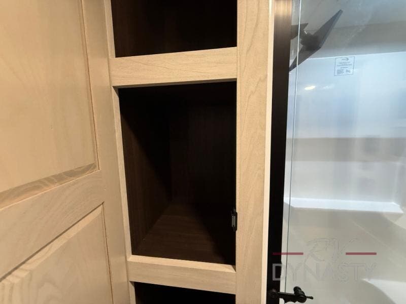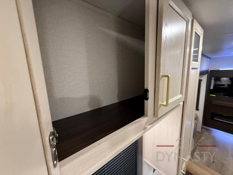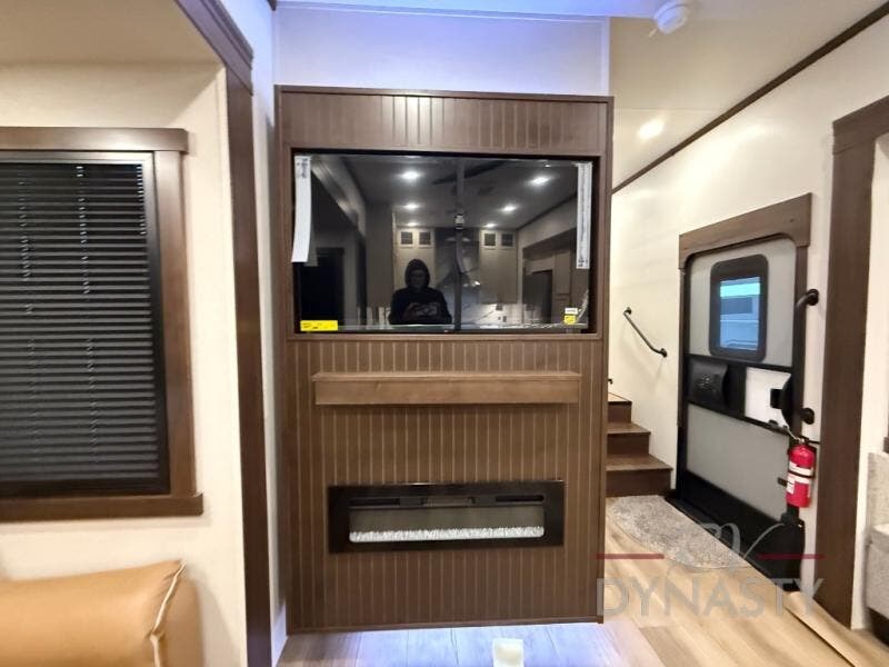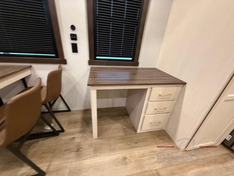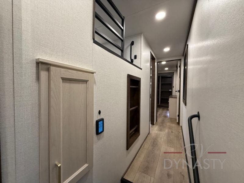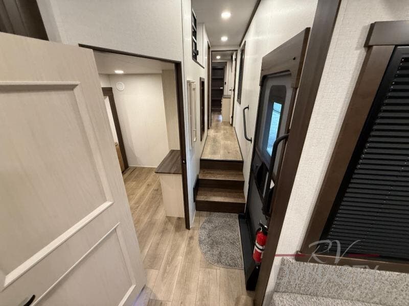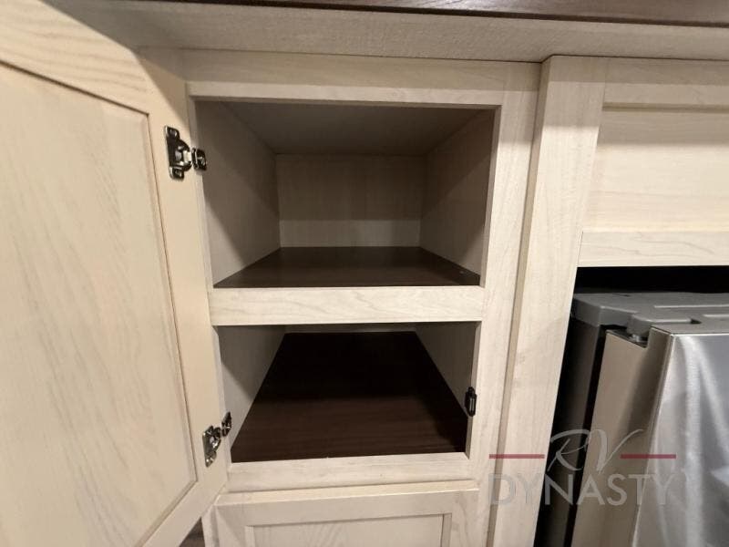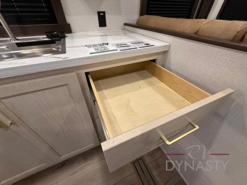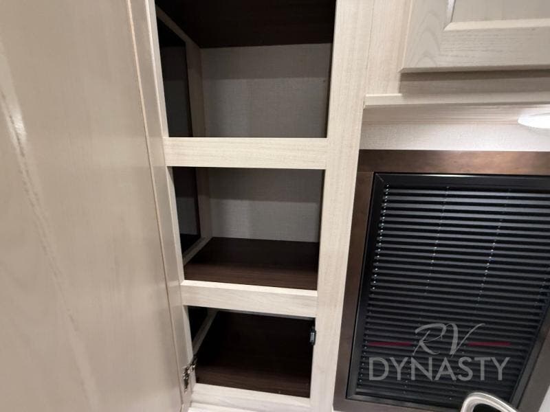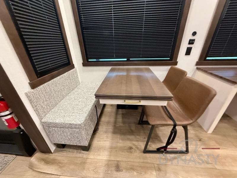 At the front of the 39RKB fifth wheel, you’ll find the main bedroom featuring a king bed in a slide-out for a restful night’s sleep. This area also includes a large wardrobe with shelves and a dresser topped with a TV, offering plenty of storage for clothing and personal essentials. Moving down the hall, the full bathroom provides a touch of comfort and convenience with a shower featuring an upgraded shower head, an 18" high porcelain toilet with a top circular flush system, and linen shelves for added storage. In the center, a versatile middle room offers additional sleeping space with a 66" hide-a-bed sofa and a closet for extra storage, perfect for accommodating guests. Toward the rear, the living area and kitchen create a warm, inviting space for relaxation and entertainment. The living room includes another hide-a-bed sofa in one slide-out for both lounging and sleeping, complemented by a power theater seat for additional comfort. Across the room, the TV and fireplace make it an ideal spot for cozy movie nights. The opposite slide-out houses a dining table with chairs and a bench for shared meals or game nights, along with a 24" x 36" desk for a convenient work area. This same slide also features a 20-cu. ft. stainless steel refrigerator and a pantry to keep groceries and dry goods organized. At the very rear, the U-shaped kitchen boasts abundant overhead cabinets, a three-burner gas range, and a stainless-steel sink, providing an efficient and functional layout for all your cooking needs.