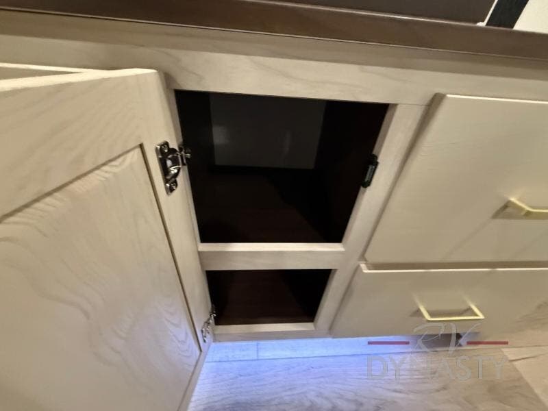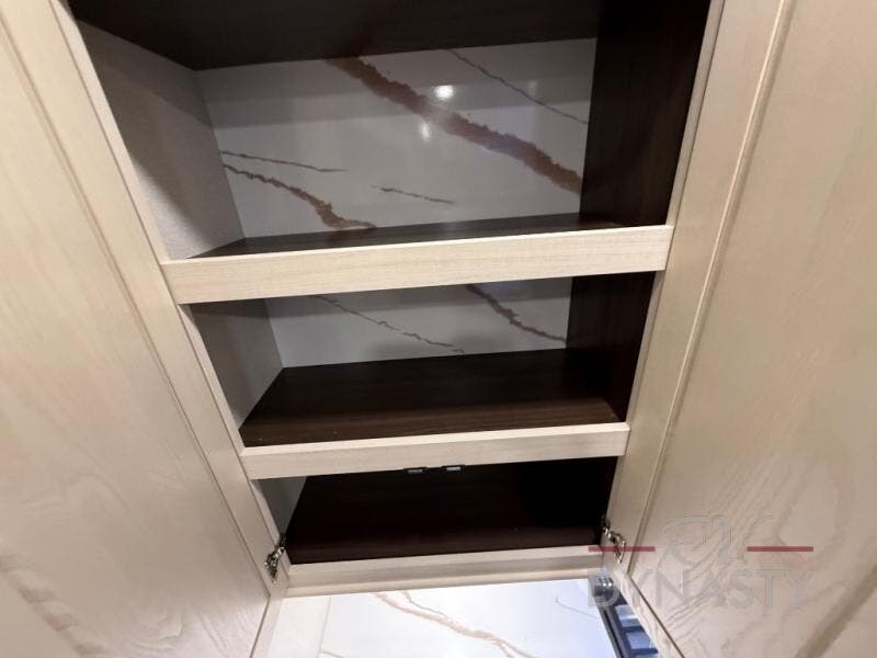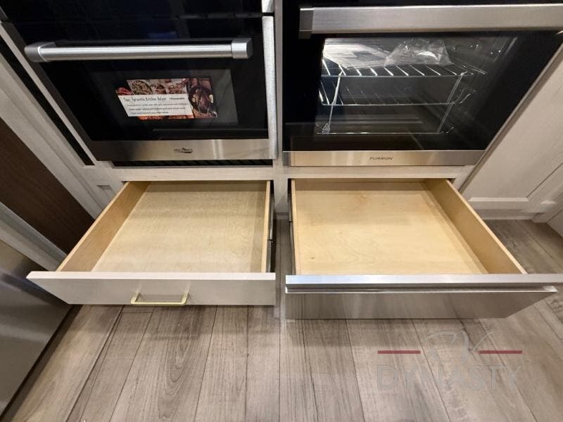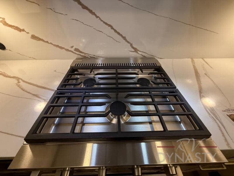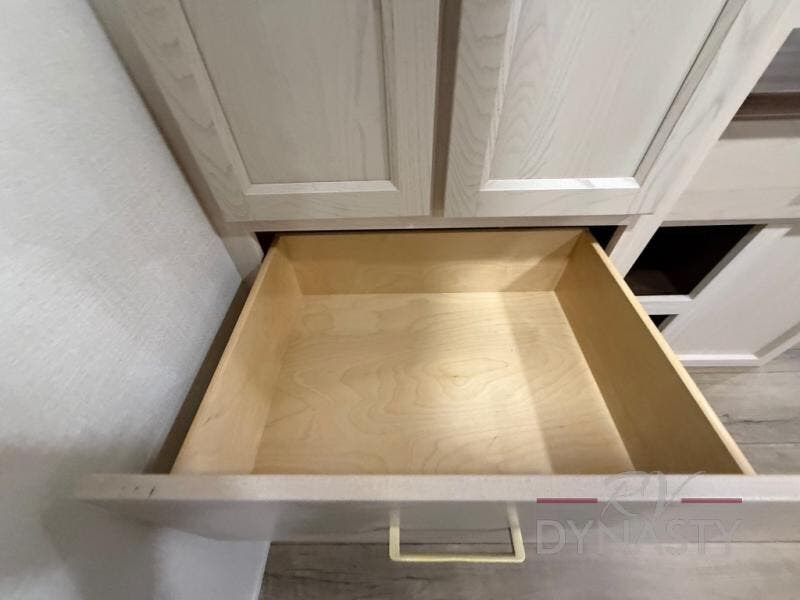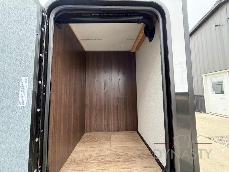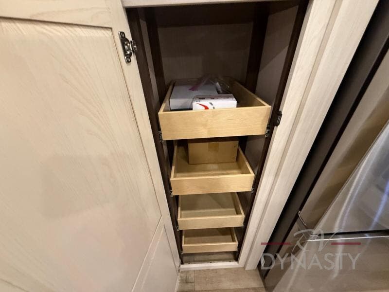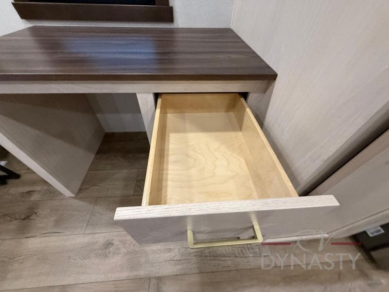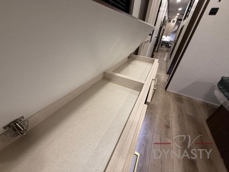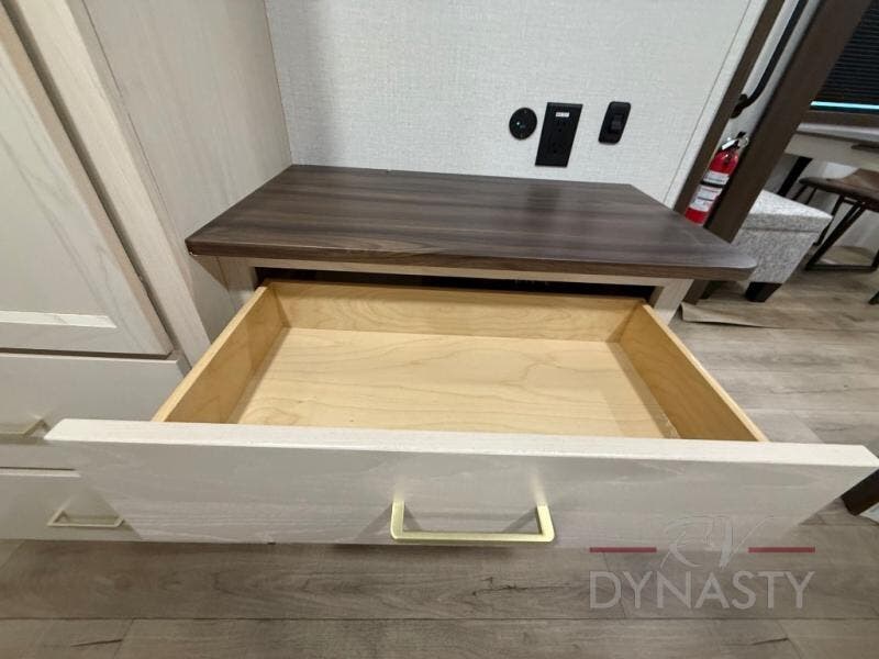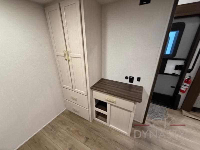 At the front of the 39RKB fifth wheel, you’ll find the main bedroom featuring a king bed in a slide-out for a restful night’s sleep. This area also includes a large wardrobe with shelves and a dresser topped with a TV, offering plenty of storage for clothing and personal essentials. Moving down the hall, the full bathroom provides a touch of comfort and convenience with a shower featuring an upgraded shower head, an 18" high porcelain toilet with a top circular flush system, and linen shelves for added storage. In the center, a versatile middle room offers additional sleeping space with a 66" hide-a-bed sofa and a closet for extra storage, perfect for accommodating guests. Toward the rear, the living area and kitchen create a warm, inviting space for relaxation and entertainment. The living room includes another hide-a-bed sofa in one slide-out for both lounging and sleeping, complemented by a power theater seat for additional comfort. Across the room, the TV and fireplace make it an ideal spot for cozy movie nights. The opposite slide-out houses a dining table with chairs and a bench for shared meals or game nights, along with a 24" x 36" desk for a convenient work area. This same slide also features a 20-cu. ft. stainless steel refrigerator and a pantry to keep groceries and dry goods organized. At the very rear, the U-shaped kitchen boasts abundant overhead cabinets, a three-burner gas range, and a stainless-steel sink, providing an efficient and functional layout for all your cooking needs.