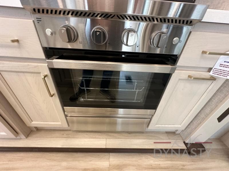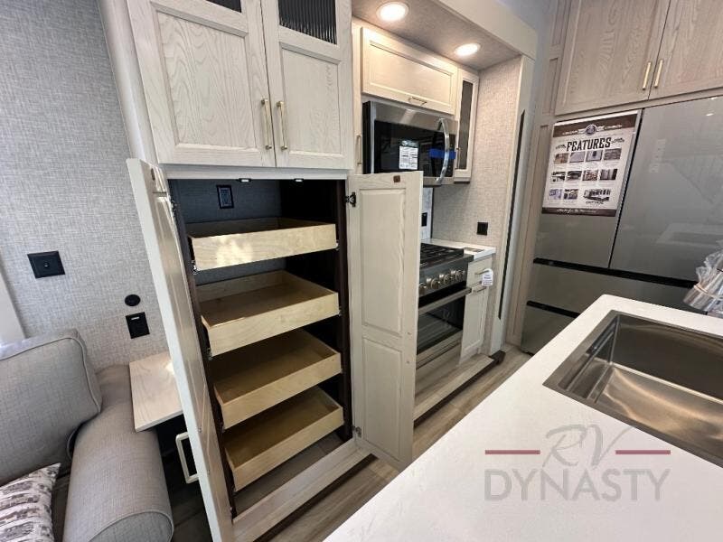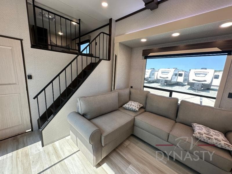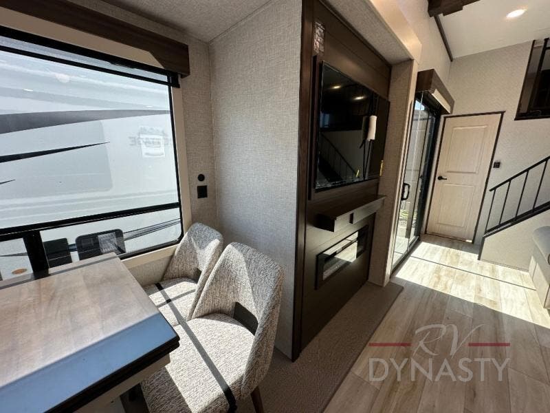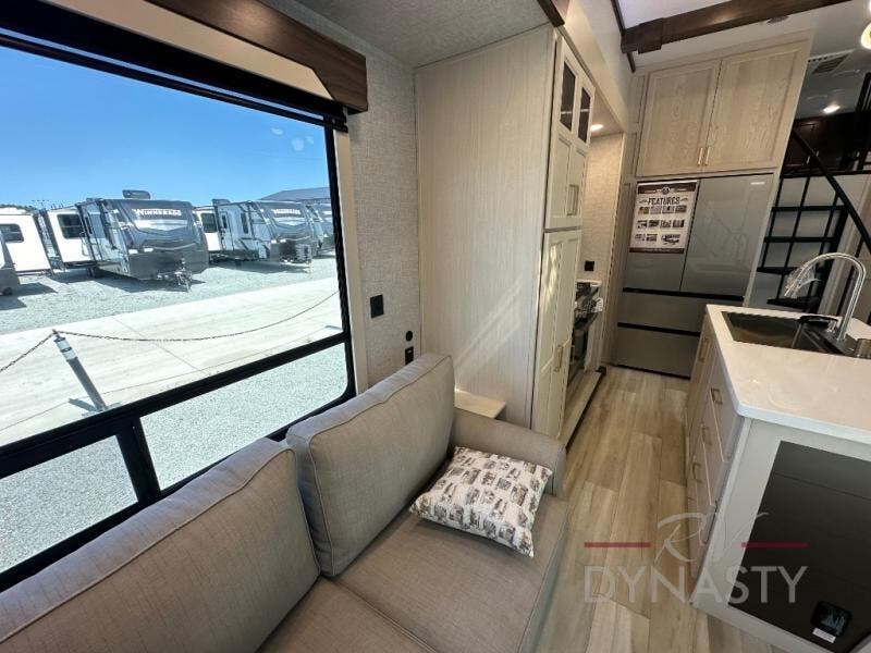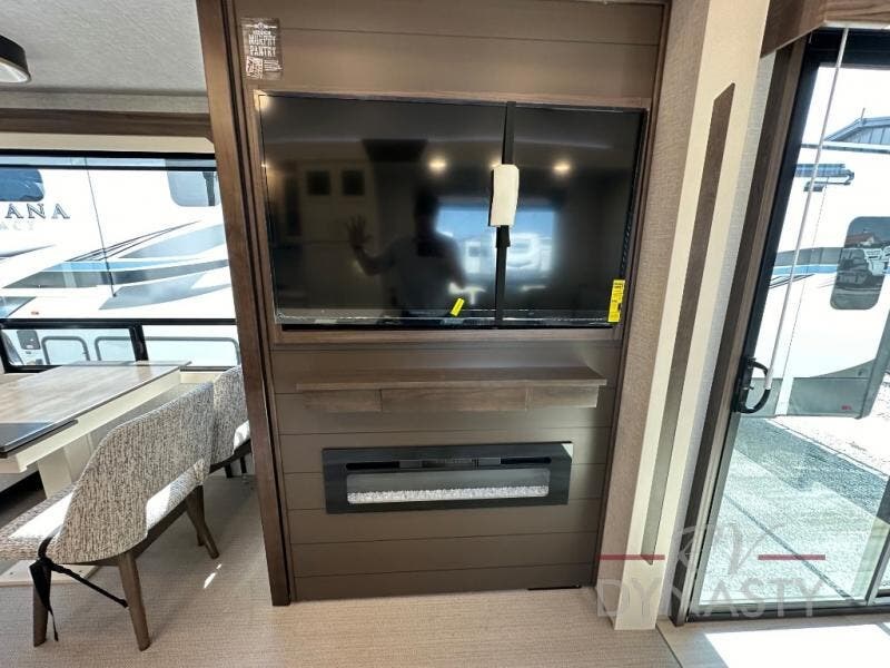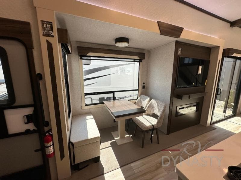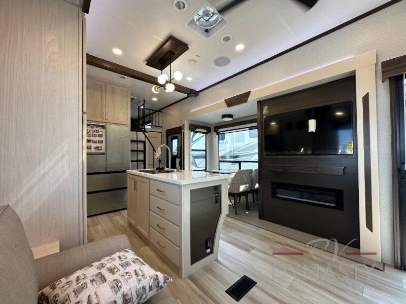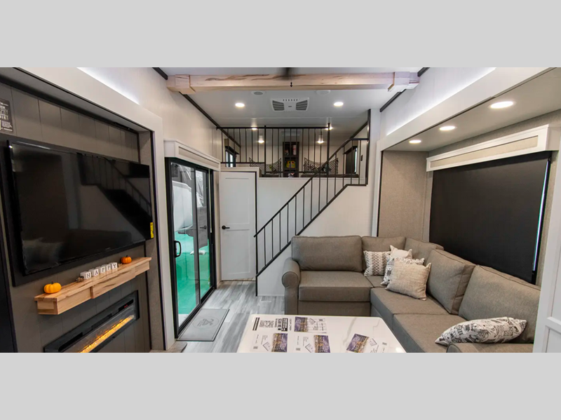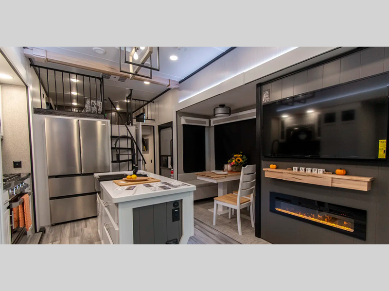 A front and rear loft plus master bedroom offer three different sleeping spaces that you and your family or guests will enjoy. The front offers a king bed slide, a dresser and front seating that is perfect to add comfort so you can relax or read your favorite book! There is also a TV as well. The main combined living and kitchen area features a large L-shaped sectional sofa opposite a swivel mount Smart TV and fireplace mounted on the exterior door that hides a Murphy pantry. The kitchen is fully equipped for all of your cooking needs with a 30" stainless steel microwave, a 110V 20 cu. ft. refrigerator, and an island. There is also a free standing dinette with an extension and an ottoman.