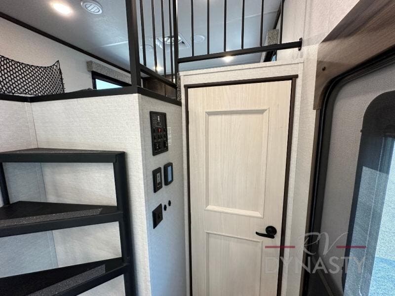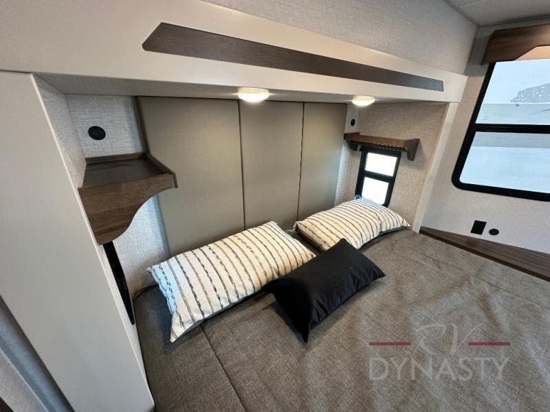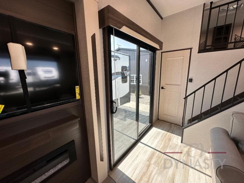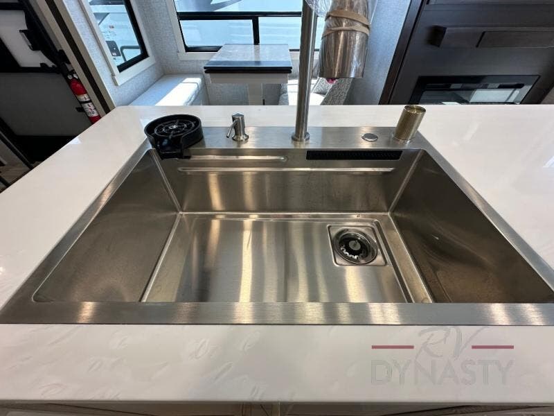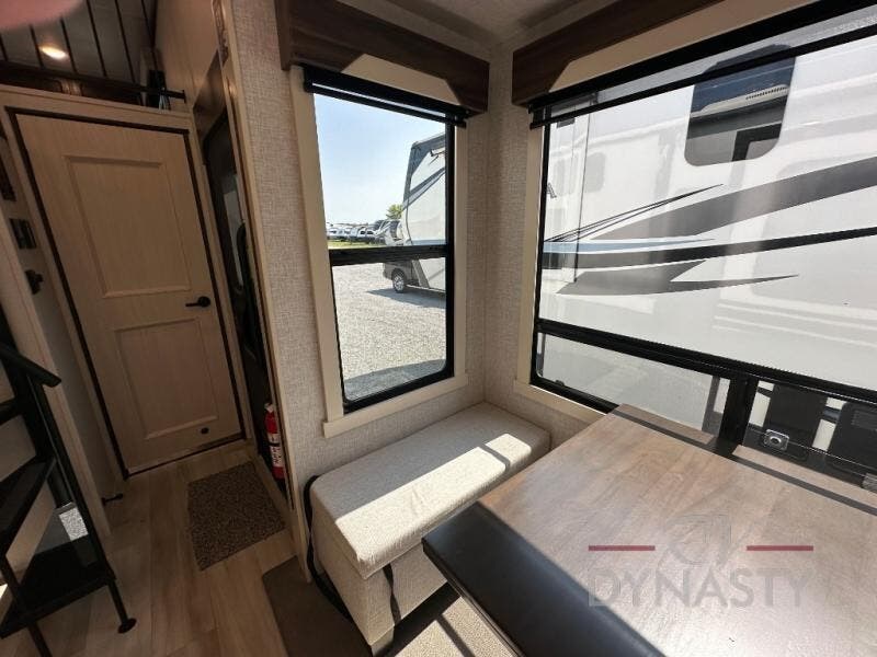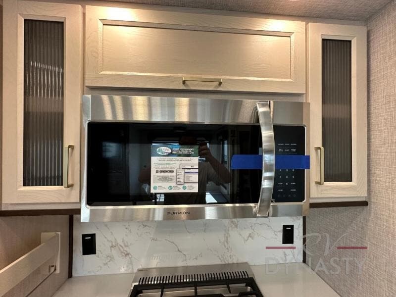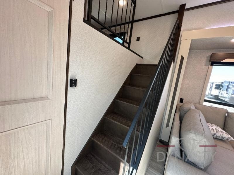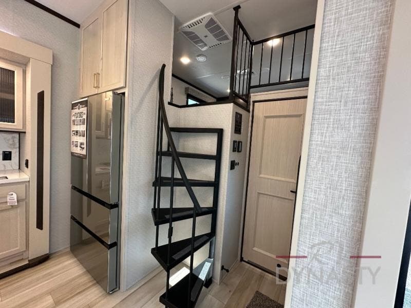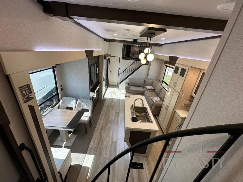 A front and rear loft plus master bedroom offer three different sleeping spaces that you and your family or guests will enjoy. The front offers a king bed slide, a dresser and front seating that is perfect to add comfort so you can relax or read your favorite book! There is also a TV as well. The main combined living and kitchen area features a large L-shaped sectional sofa opposite a swivel mount Smart TV and fireplace mounted on the exterior door that hides a Murphy pantry. The kitchen is fully equipped for all of your cooking needs with a 30" stainless steel microwave, a 110V 20 cu. ft. refrigerator, and an island. There is also a free standing dinette with an extension and an ottoman.