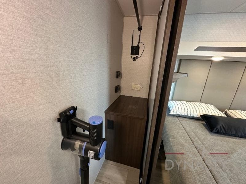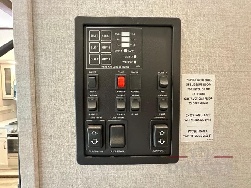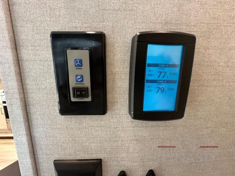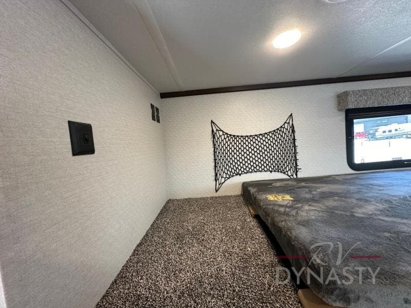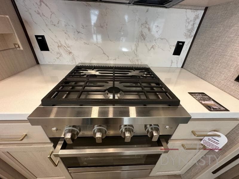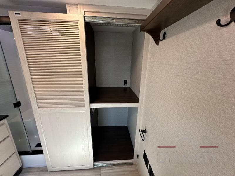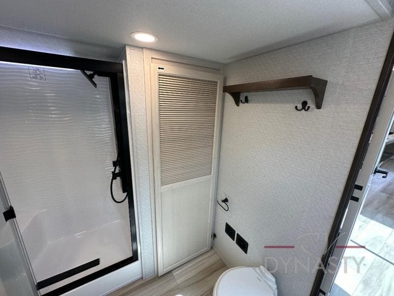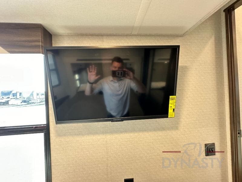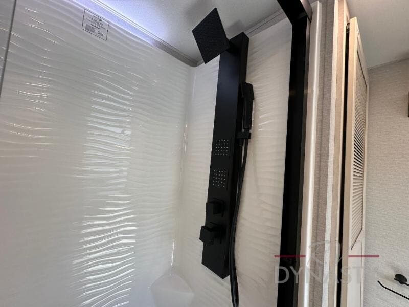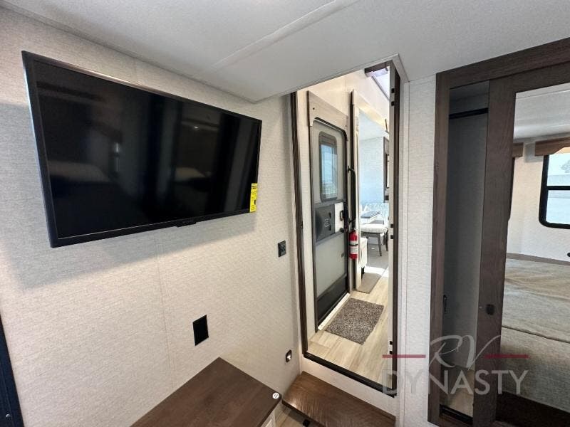 A front and rear loft plus master bedroom offer three different sleeping spaces that you and your family or guests will enjoy. The front offers a king bed slide, a dresser and front seating that is perfect to add comfort so you can relax or read your favorite book! There is also a TV as well. The main combined living and kitchen area features a large L-shaped sectional sofa opposite a swivel mount Smart TV and fireplace mounted on the exterior door that hides a Murphy pantry. The kitchen is fully equipped for all of your cooking needs with a 30" stainless steel microwave, a 110V 20 cu. ft. refrigerator, and an island. There is also a free standing dinette with an extension and an ottoman.