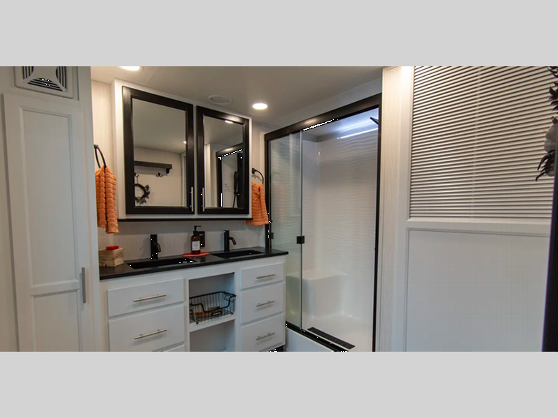 With any Cedar Creek Cottage destination trailer by Forest River, you can enjoy extended stays with residential features at the location of your choice! Each model is built with 3M bonded sidewalls that grow stronger with age and are resistant to UV, heat, oil, moisture, and more. There is also an AlphaPly TPO roof membrane, and new waterproof and bug proof Vixenite slide room floor panels for added durability. Head inside where you'll find residential dovetail, self-closing drawers, flush floor slides in the kitchen and living area, a residential style headboard and luxurious bedding decor, and extra storage for linens in the bedroom and bath.