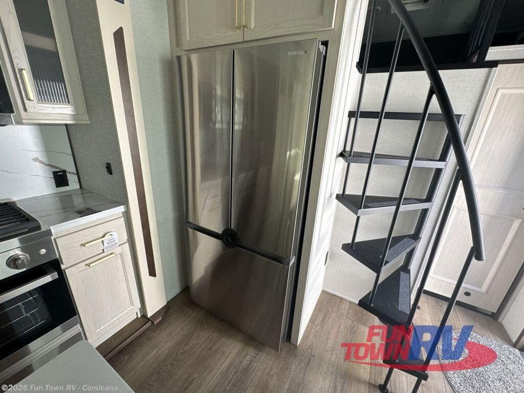 A front and rear loft plus master bedroom offer three different sleeping spaces that you and your family or guests will enjoy. The front master offers a king bed slide, plus two dressers and a wardrobe for clothing. There is also a 32" TV as well. The main combined living and kitchen area features a large L-shaped sectional sofa opposite a swivel mount Smart TV and fireplace mounted on the exterior door that hides a Murphy pantry. The kitchen is fully equipped for all of your cooking needs with a 30" stainless steel microwave, a 12V 18 cu. ft. refrigerator, and an island with fold-down breakfast counter. There is also a free standing dinette with an extension and an ottoman.