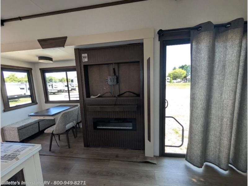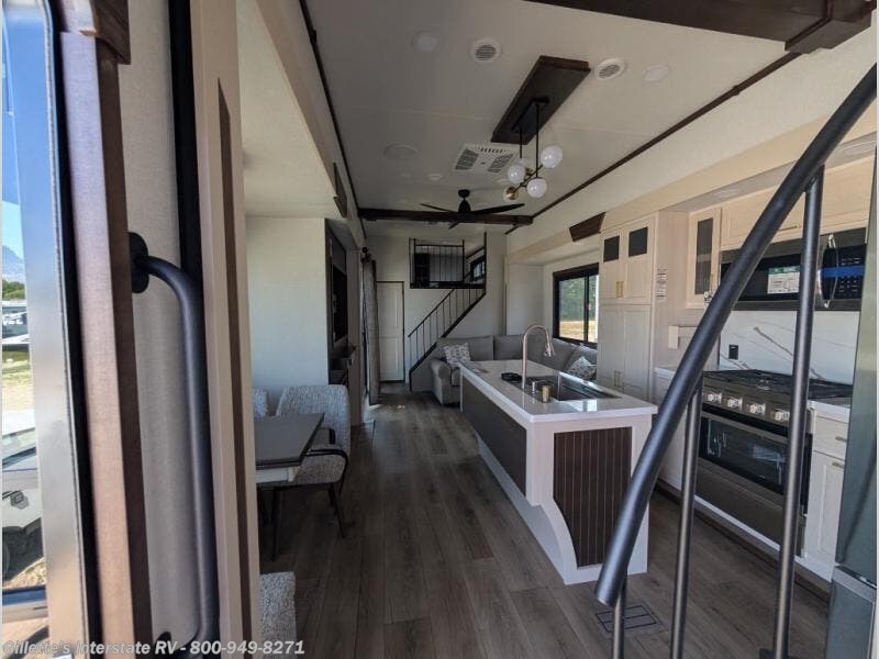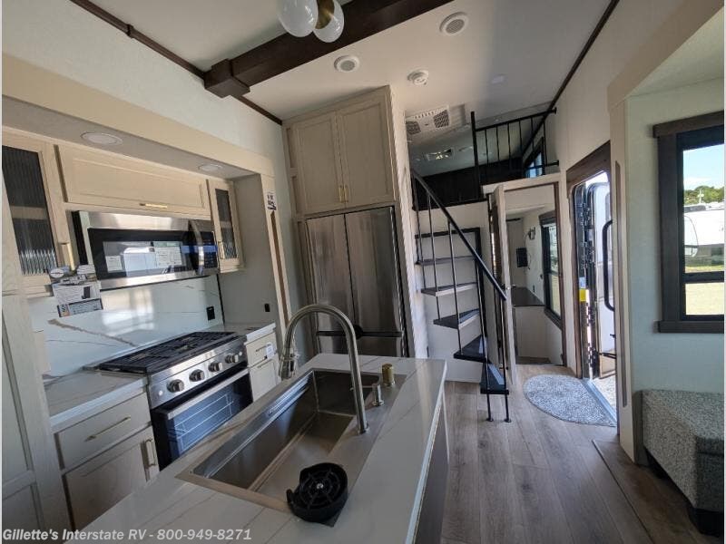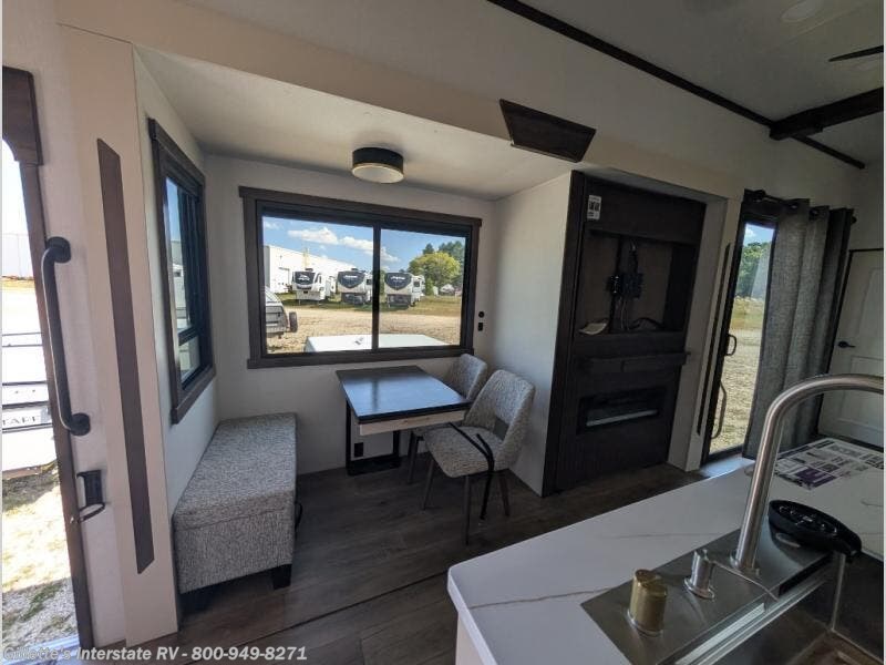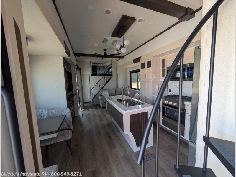 A front and rear loft plus master bedroom offer three different sleeping spaces that you and your family or guests will enjoy. The front master offers a king bed slide, plus two dressers and a wardrobe for clothing. There is also a 32" TV as well. The main combined living and kitchen area features a large L-shaped sectional sofa opposite a swivel mount Smart TV and fireplace mounted on the exterior door that hides a Murphy pantry. The kitchen is fully equipped for all of your cooking needs with a 30" stainless steel microwave, a 12V 18 cu. ft. refrigerator, and an island with fold-down breakfast counter. There is also a free standing dinette with an extension and an ottoman.