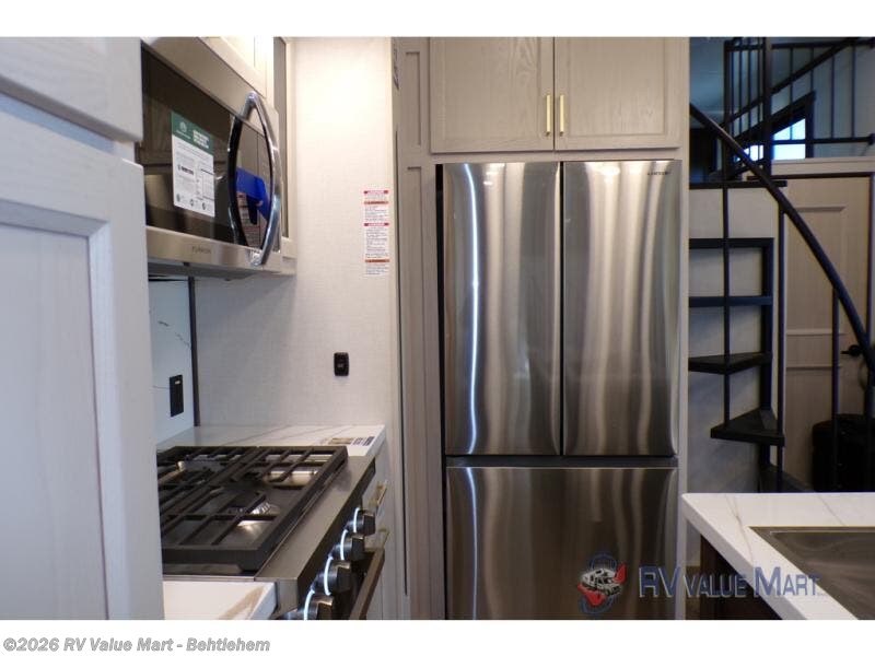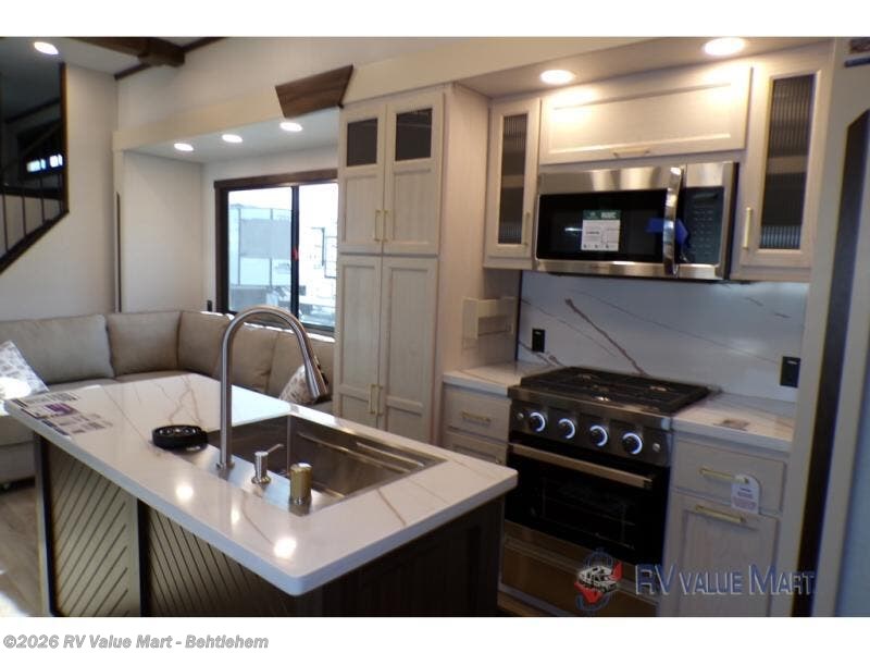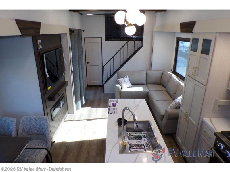 A front and rear loft plus master bedroom offer three different sleeping spaces that you and your family or guests will enjoy. The front offers a king bed slide, a dresser and front seating that is perfect to add comfort so you can relax or read your favorite book! There is also a TV as well. The main combined living and kitchen area features a large L-shaped sectional sofa opposite a swivel mount Smart TV and fireplace mounted on the exterior door that hides a Murphy pantry. The kitchen is fully equipped for all of your cooking needs with a 30" stainless steel microwave, a 110V 20 cu. ft. refrigerator, and an island. There is also a free standing dinette with an extension and an ottoman.