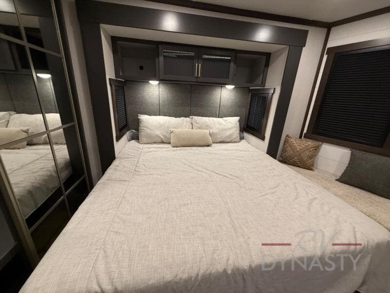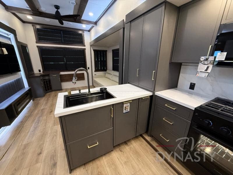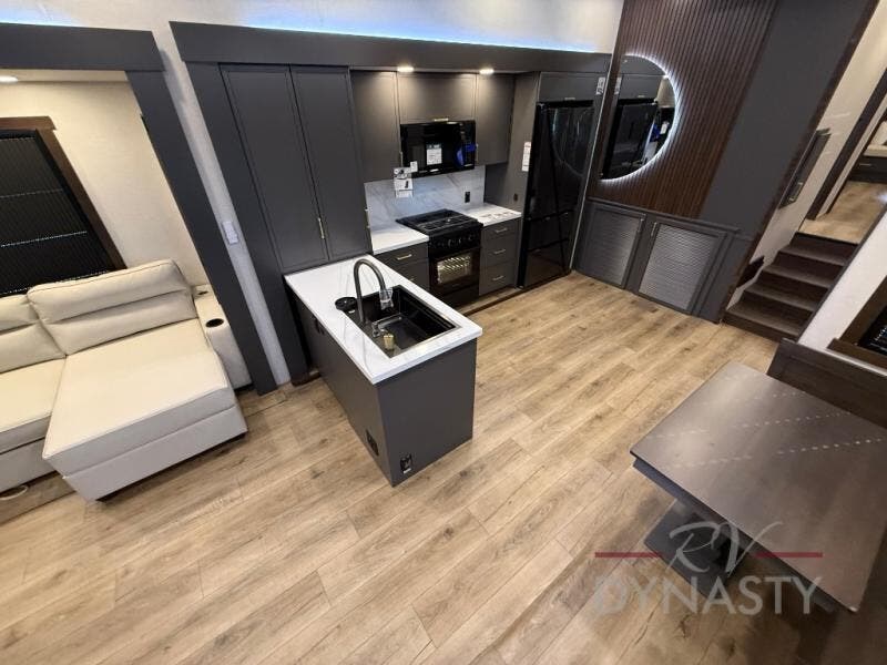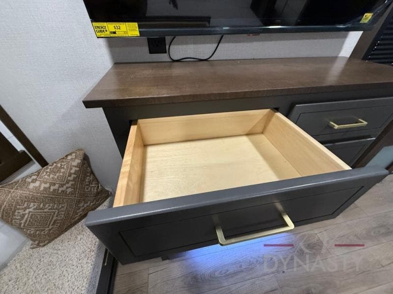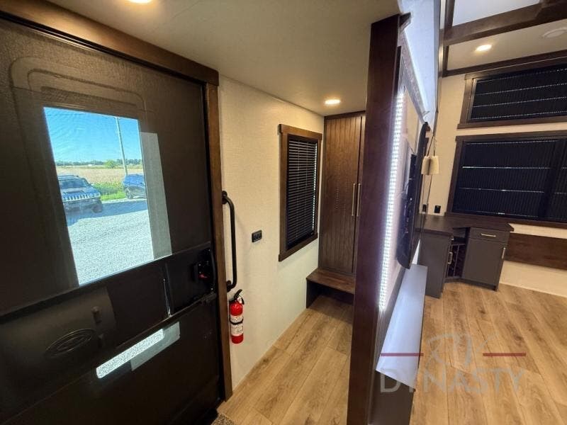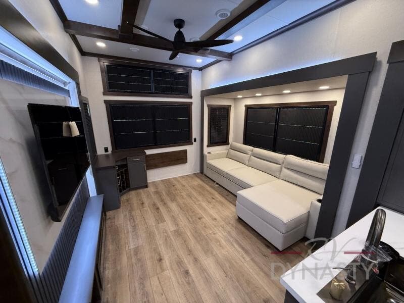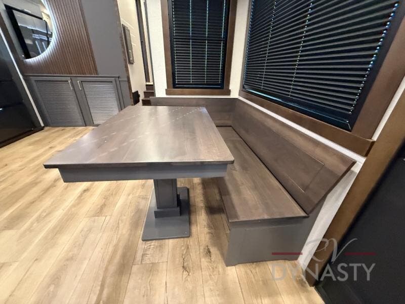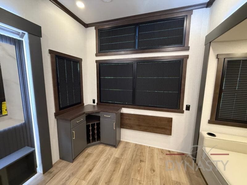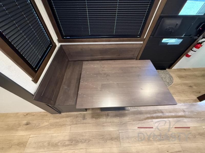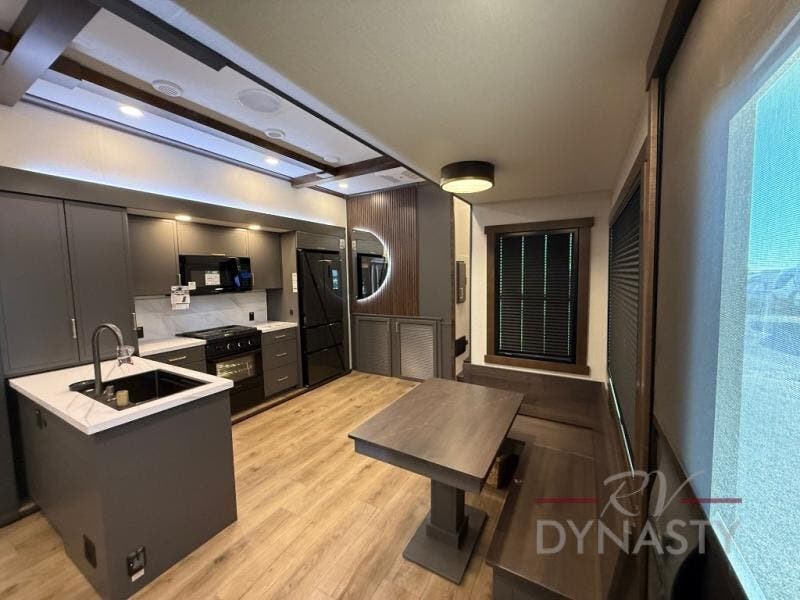 The rear living room is a spacious retreat, featuring a comfortable sectional sofa and a flip desk perfect for working or relaxing. Unwind with a glass of wine at the wine bar, or cozy up by the fireplace while enjoying your favorite show on the TV. The mud room is a practical and convenient feature, perfect for storing gear, boots, and jackets. The kitchen is fully equipped with overhead cabinets, a microwave, a refrigerator, and a table with swivel chairs, providing a comfortable spot to enjoy meals with family and friends. The full bathroom features an ample shower, providing plenty of space to get ready for the day, while the front bedroom is the perfect spot to relax and recharge after a long day of exploring, featuring a king bed, closet, and dresser.