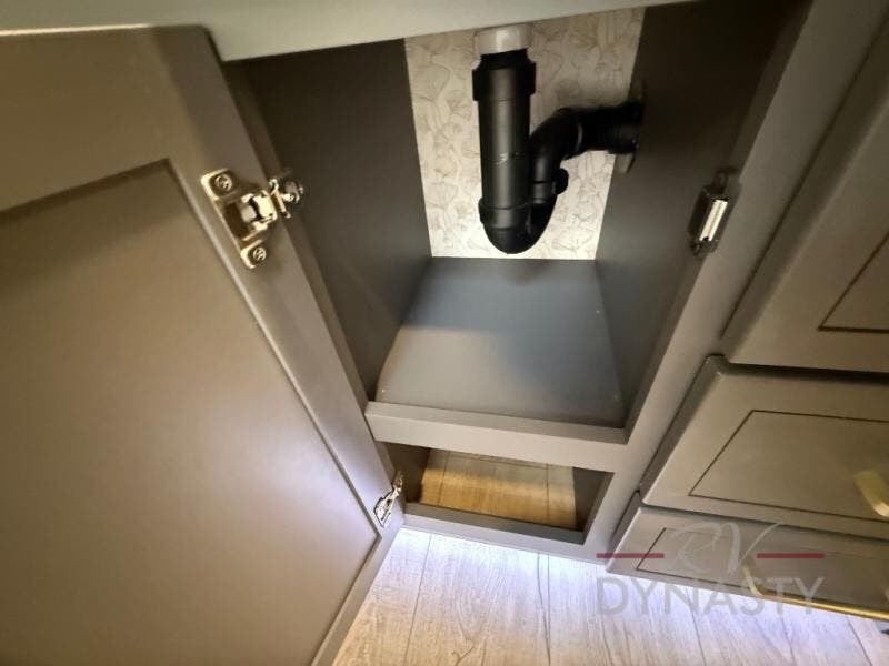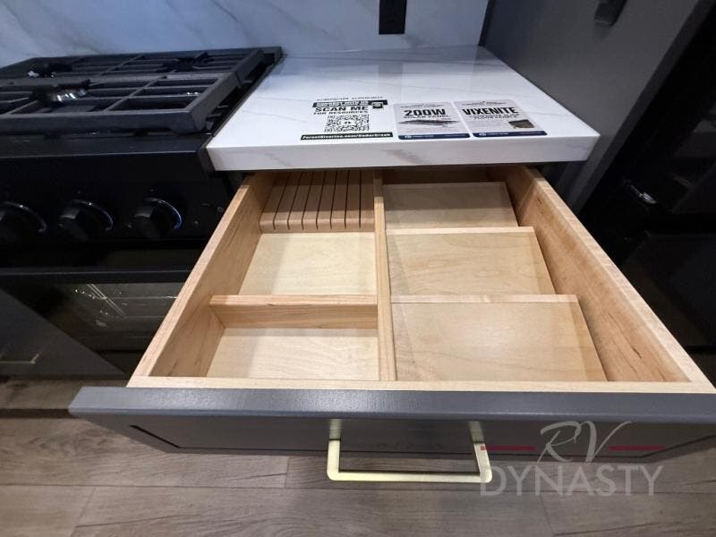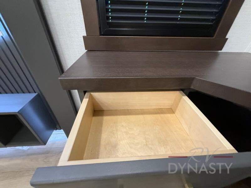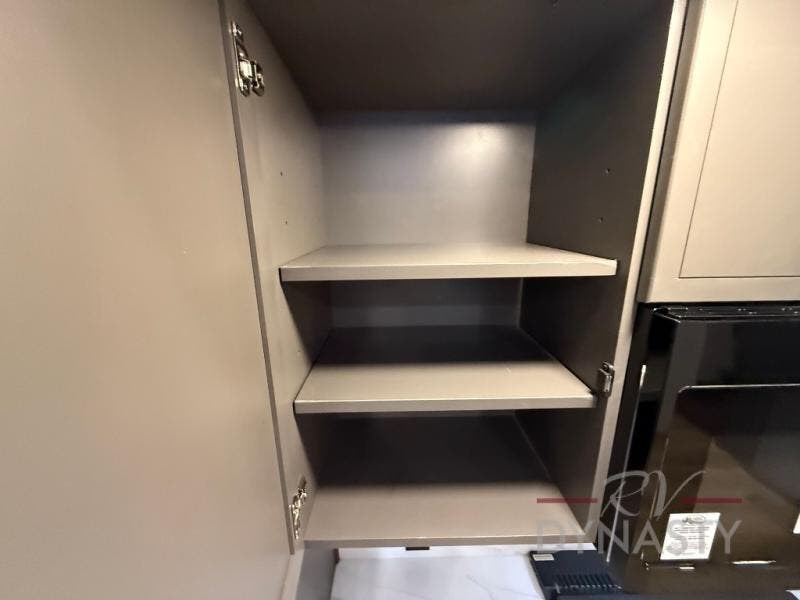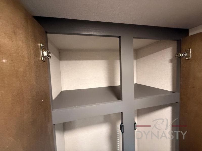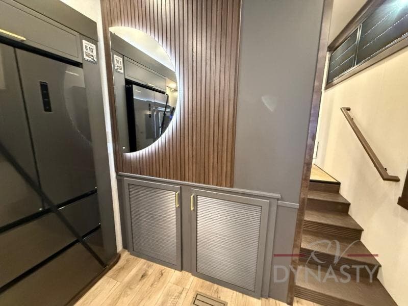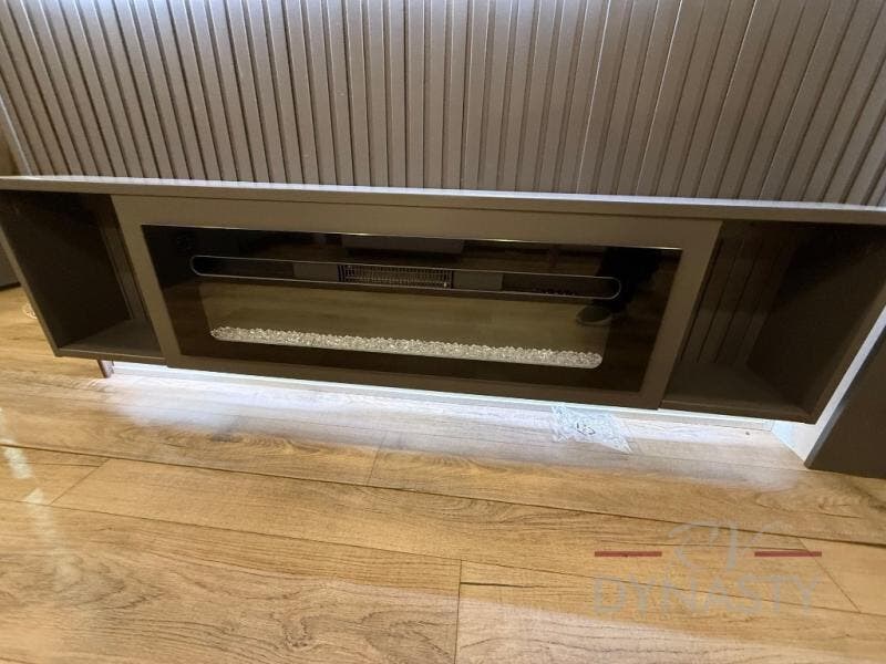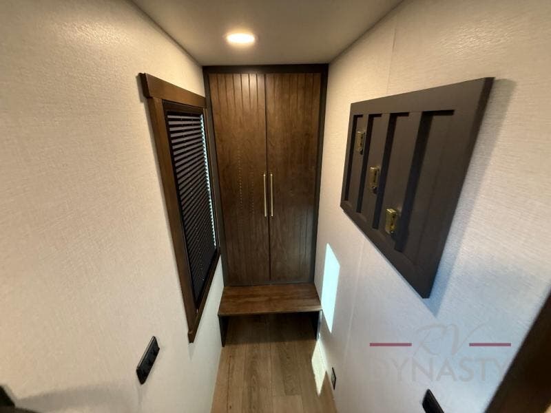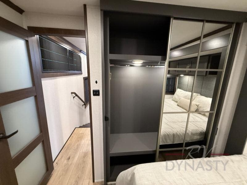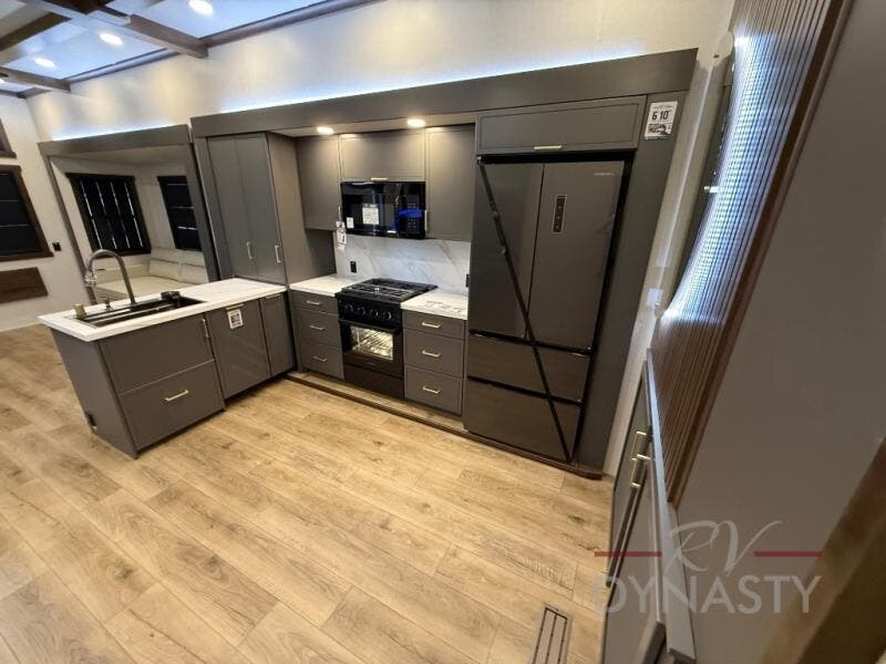 The rear living room is a spacious retreat, featuring a comfortable sectional sofa and a flip desk perfect for working or relaxing. Unwind with a glass of wine at the wine bar, or cozy up by the fireplace while enjoying your favorite show on the TV. The mud room is a practical and convenient feature, perfect for storing gear, boots, and jackets. The kitchen is fully equipped with overhead cabinets, a microwave, a refrigerator, and a table with swivel chairs, providing a comfortable spot to enjoy meals with family and friends. The full bathroom features an ample shower, providing plenty of space to get ready for the day, while the front bedroom is the perfect spot to relax and recharge after a long day of exploring, featuring a king bed, closet, and dresser.