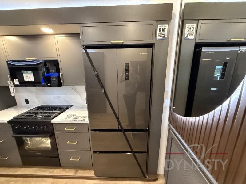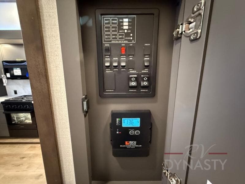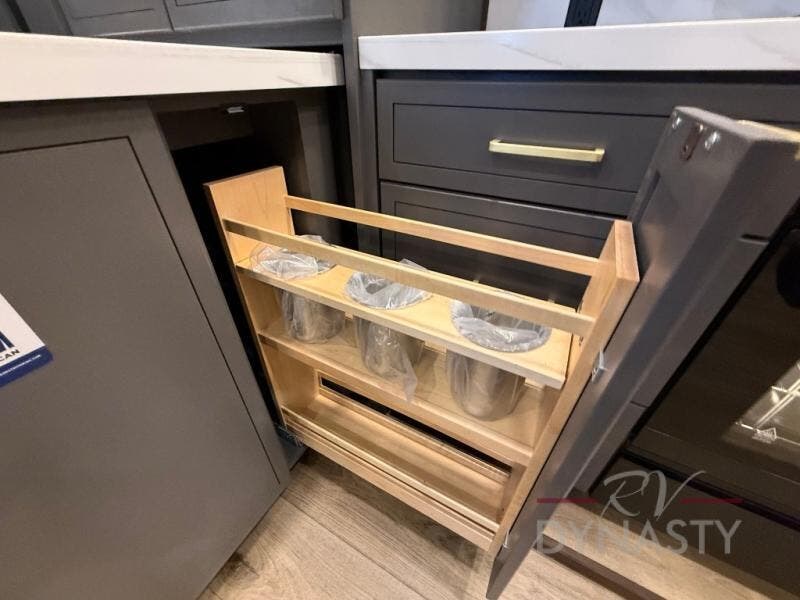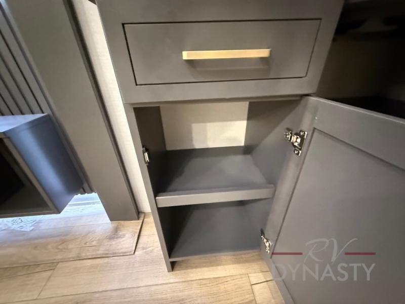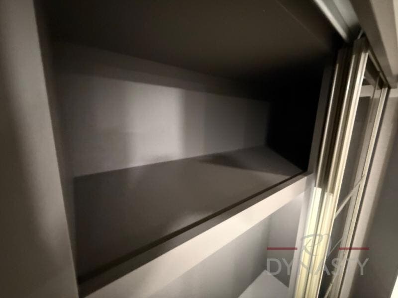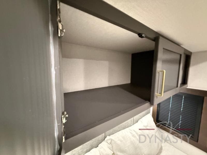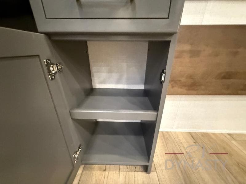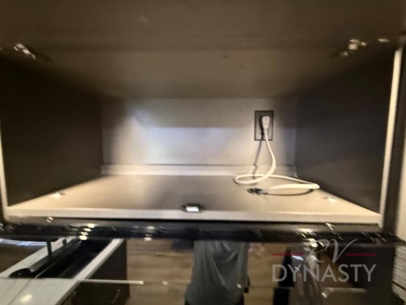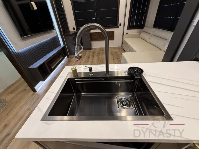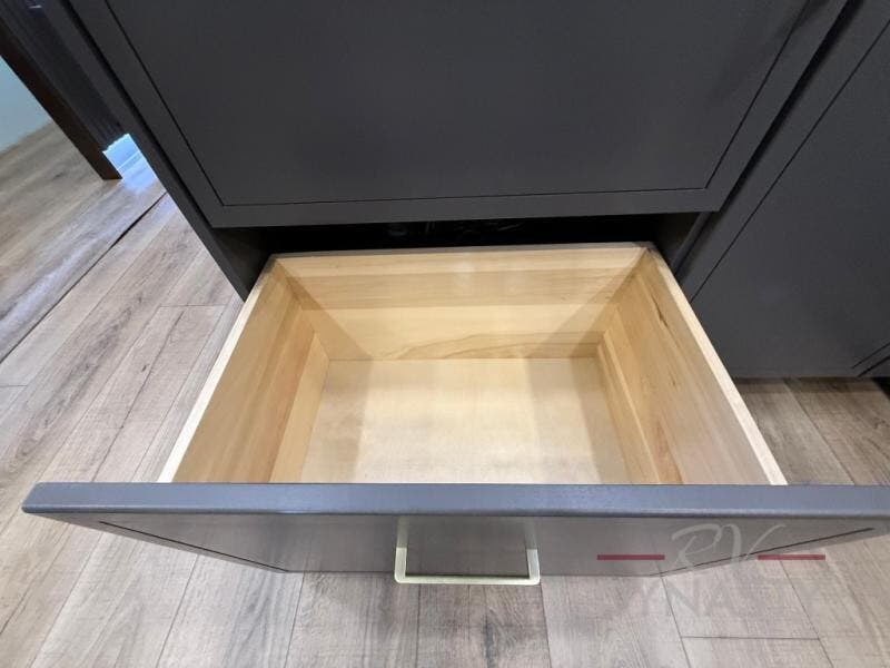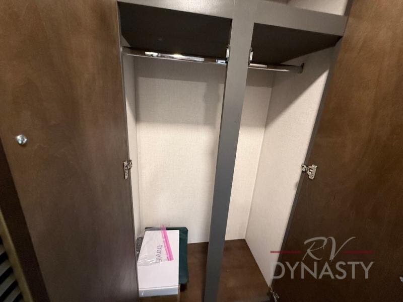 The rear living room is a spacious retreat, featuring a comfortable sectional sofa and a flip desk perfect for working or relaxing. Unwind with a glass of wine at the wine bar, or cozy up by the fireplace while enjoying your favorite show on the TV. The mud room is a practical and convenient feature, perfect for storing gear, boots, and jackets. The kitchen is fully equipped with overhead cabinets, a microwave, a refrigerator, and a table with swivel chairs, providing a comfortable spot to enjoy meals with family and friends. The full bathroom features an ample shower, providing plenty of space to get ready for the day, while the front bedroom is the perfect spot to relax and recharge after a long day of exploring, featuring a king bed, closet, and dresser.