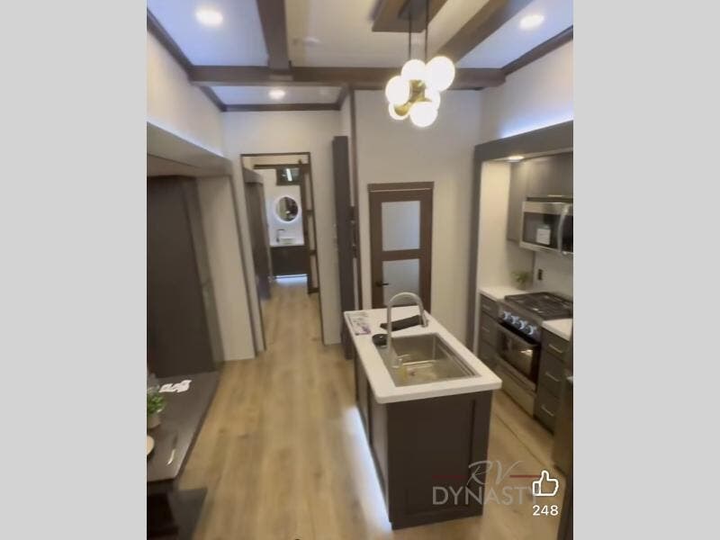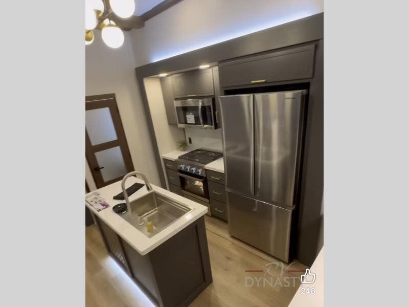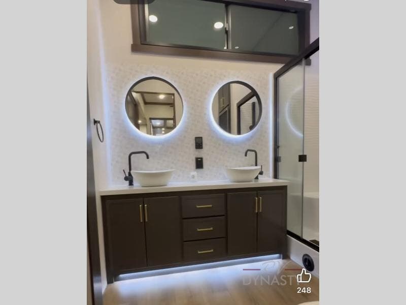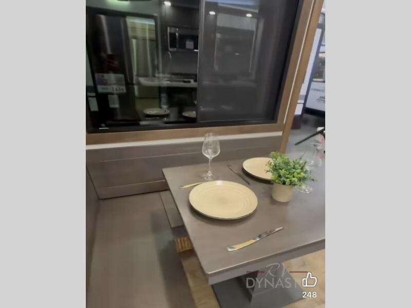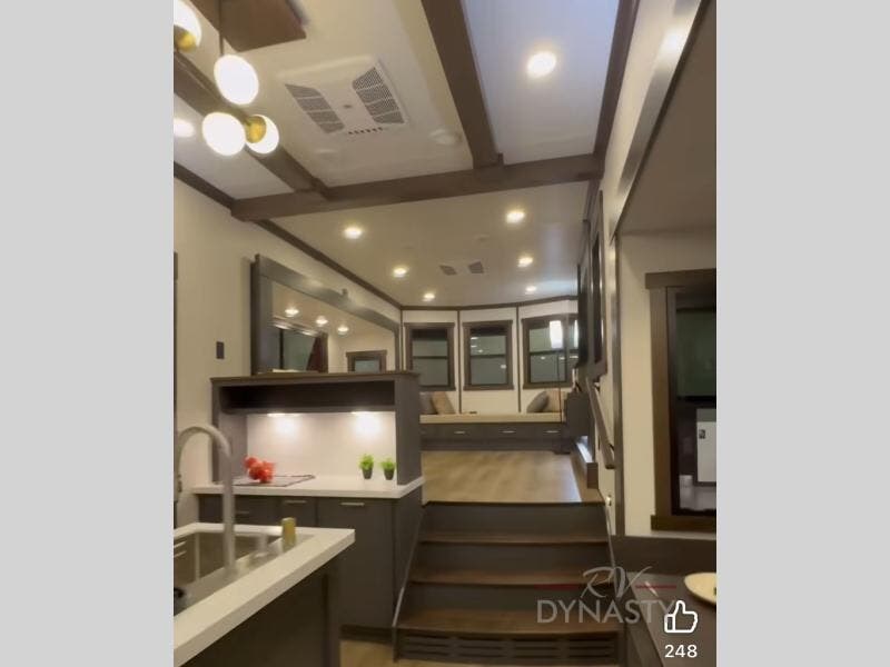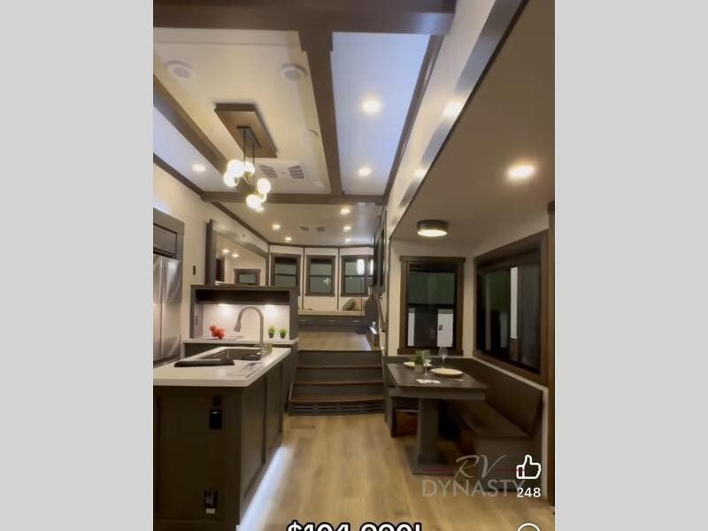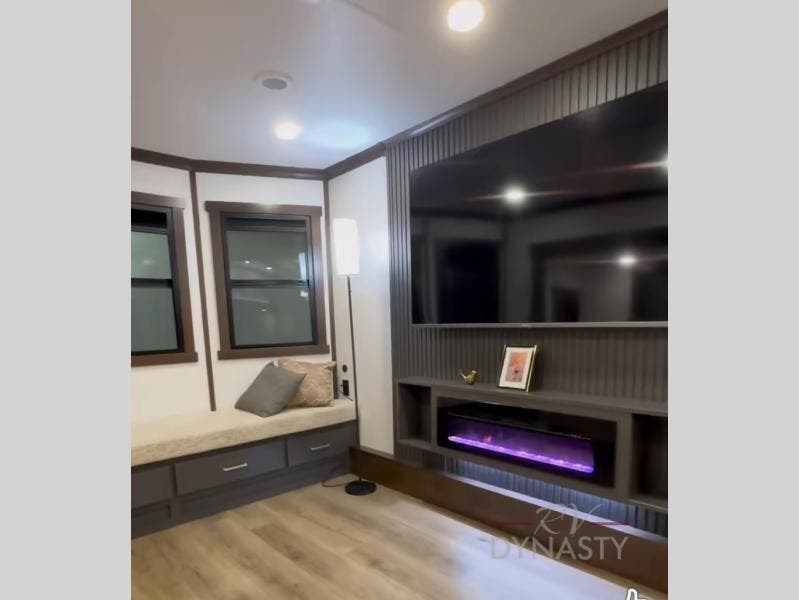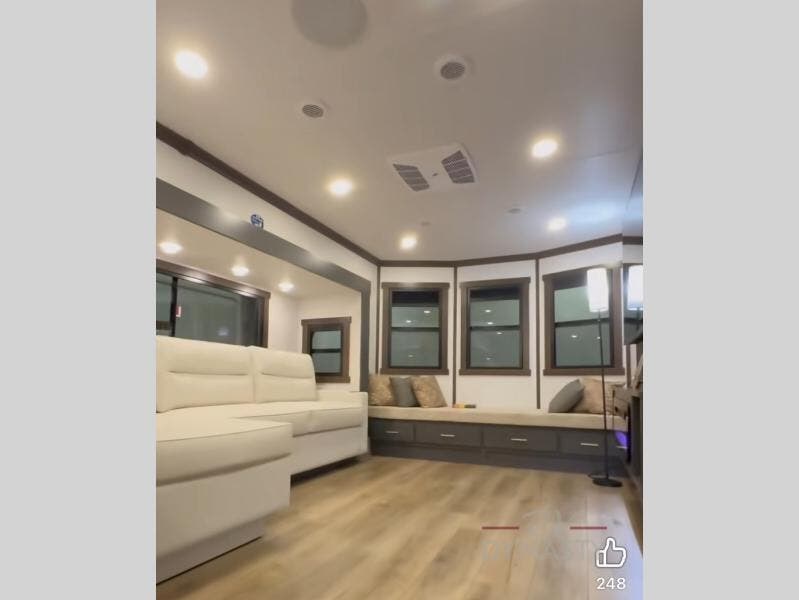 Unwind and refresh in this serene space of the rear bathroom, featuring dual sinks and a spacious linen closet for added convenience and storage. Drift off to sleep surrounded by peaceful surroundings in the private bedroom, complete with a plush king bed, an elegant dresser, and a stunning TV mounted above. The kitchen is a culinary haven, equipped with ample overhead cabinets, a convenient microwave, and a spacious fridge. The ample pantry and second pantry offer ample storage for your favorite ingredients and snacks. Plus, you can enjoy meals with loved ones at the table with swivel chairs! Also, the coat closet and half bath add a touch of practicality, making this fifth wheel perfect for everyday living or extended adventures. The front living room is a vibrant gathering space, featuring a comfortable sectional sofa and a cozy fireplace so you can snuggle up and enjoy quality time with family and friends while watching your favorite shows on the TV!