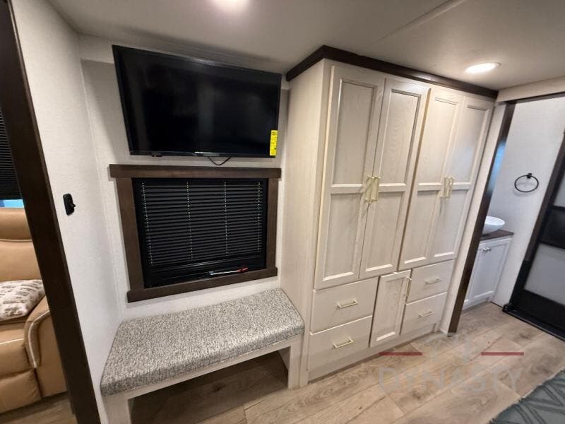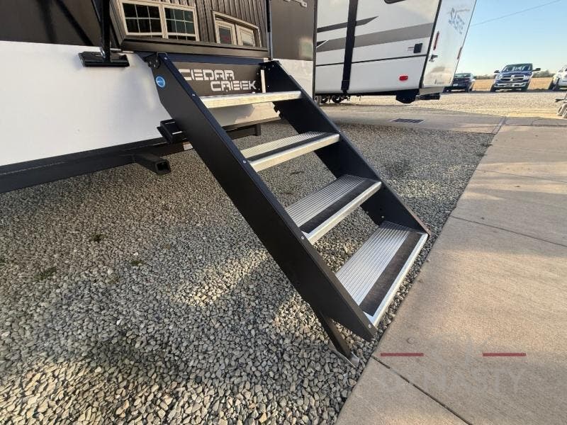 With any Cedar Creek Experience fifth wheel by Forest River, you will bet met with luxury features both inside and out! The True Gelcoat exterior is the best of the best in exteriors and the 3M bonded sidewalls will hold up over years of use. There is also a new 101'' wide-body frame, a Road Warrior suspension, plus a TST tire pressure monitoring system to make towing that much easier. You will find a hidden front storage compartment, along with a 4' x 6' ABS, ribbed, removable underbelly panels, and 6-point hydraulic leveling system, plus many more exterior conveniences. The interior will have you feeling like you haven't left home with vinyl floor coverings, power theater seating with USB ports, a cozy fireplace, vinyl floor covering and the list of comforts goes on! Each model is also pre-wired for satellite to the roof, and you're sure to never go bored with a Smart TV in the bedroom!