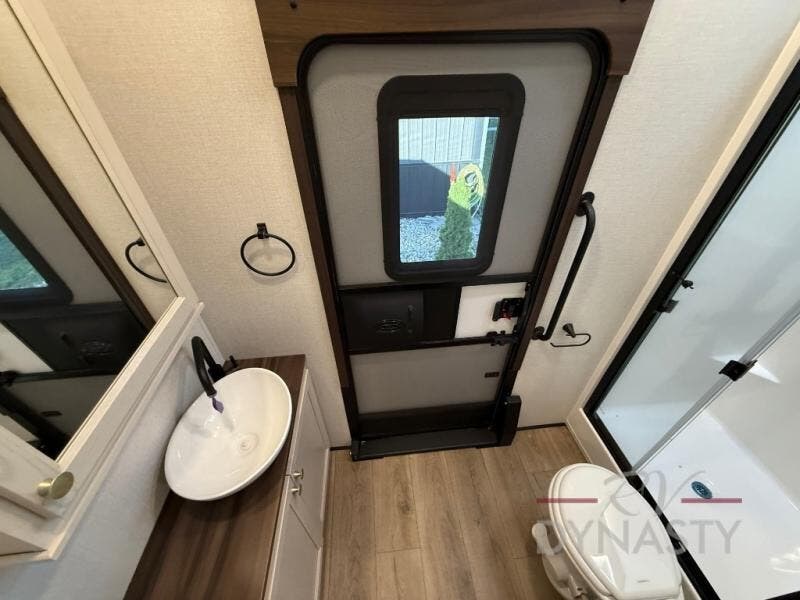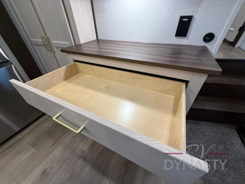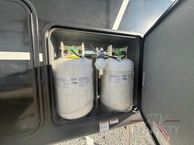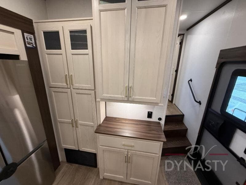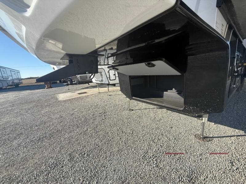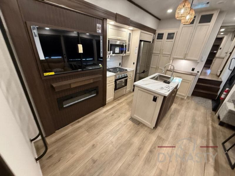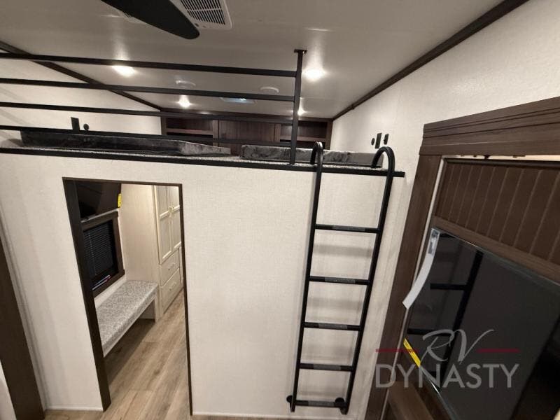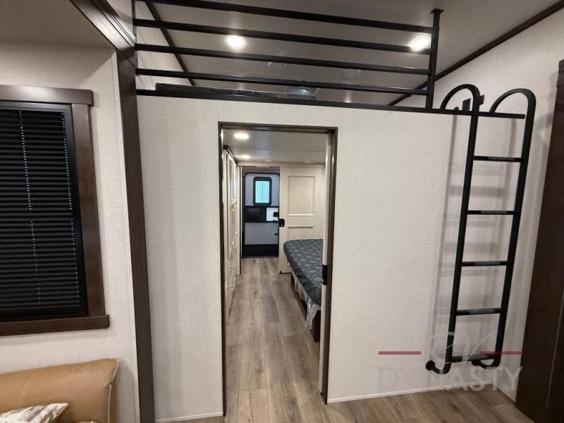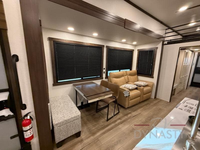 This is the perfect fifth wheel to camp with family or neighbor friends since there are two bedrooms, one of which is a master bedroom with a full rear bath. The second full bath is up front, and both bedrooms include a king bed slide out for added comfort. There is even a loft above the rear bedroom, complete with two bunk mats, two cabinets, and a TV hookup. Everyone can meet in the combined kitchen and living room to enjoy the swivel mounted TV and fireplace across from the theater seating. There is also a wall-mounted dining table with an extension and ottoman.