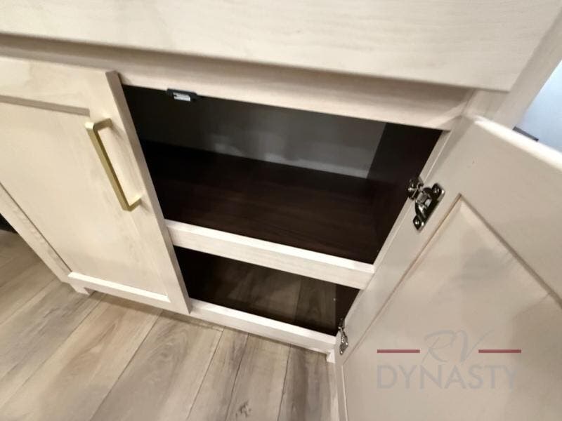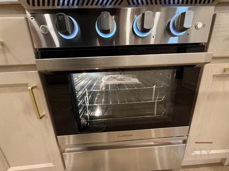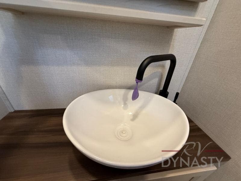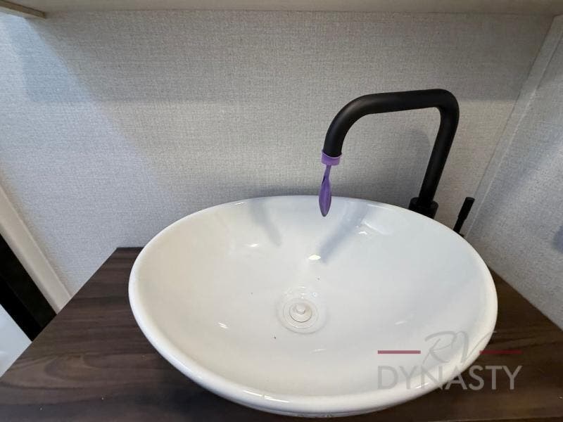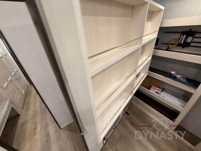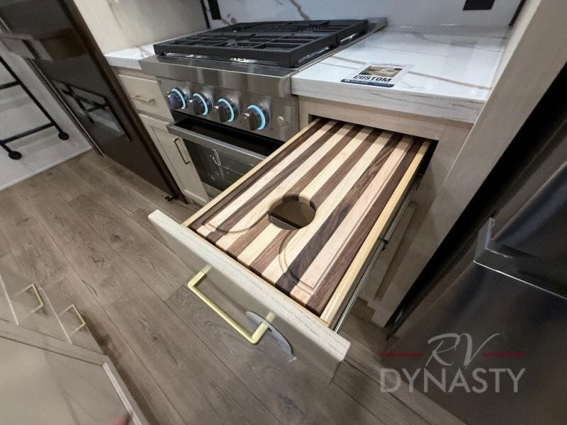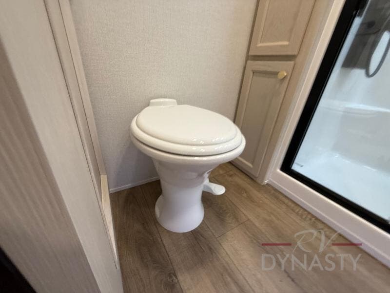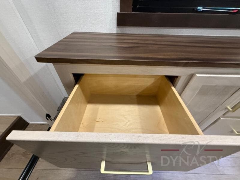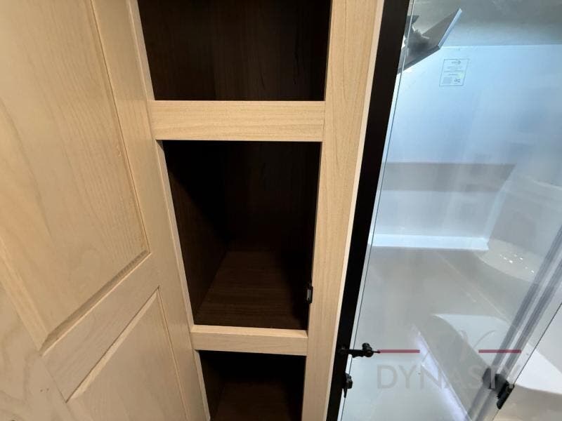 This is the perfect fifth wheel to camp with family or neighbor friends since there are two bedrooms, one of which is a master bedroom with a full rear bath. The second full bath is up front, and both bedrooms include a king bed slide out for added comfort. There is even a loft above the rear bedroom, complete with two bunk mats, two cabinets, and a TV hookup. Everyone can meet in the combined kitchen and living room to enjoy the swivel mounted TV and fireplace across from the theater seating. There is also a wall-mounted dining table with an extension and ottoman.