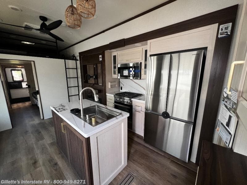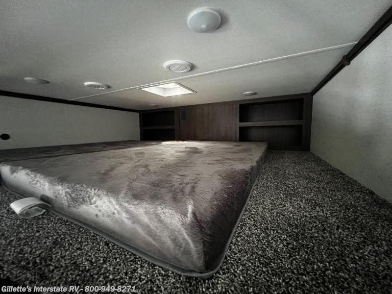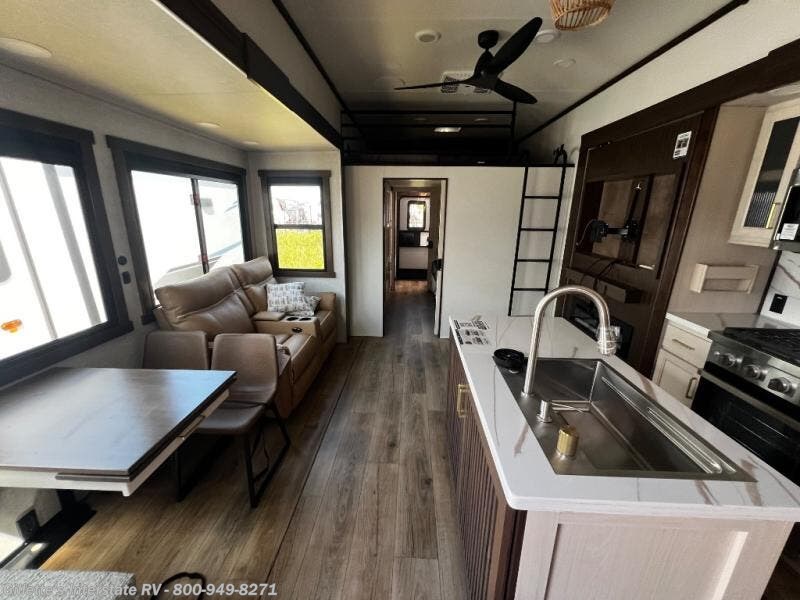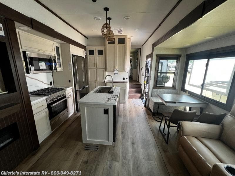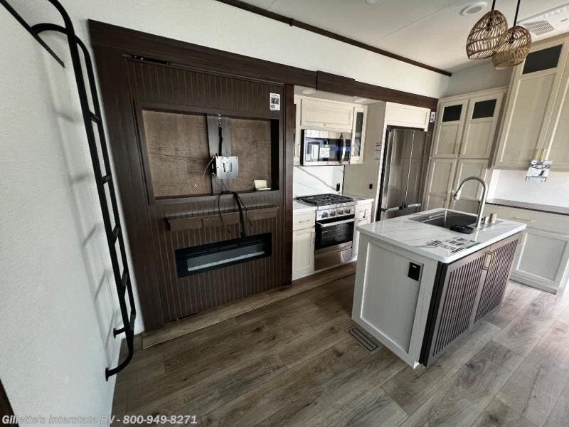This is the perfect fifth wheel to camp with family or neighbor friends since there are two bedrooms, one of which is a master bedroom with a full rear bath. The second full bath is up front, and both bedrooms include a king bed slide out for added comfort. There is even a loft above the rear bedroom, complete with two bunk mats, two cabinets, and a TV hookup. Everyone can meet in the combined kitchen and living room to enjoy the swivel mounted TV and fireplace across from the theater seating. There is also a wall-mounted dining table with an extension and ottoman.