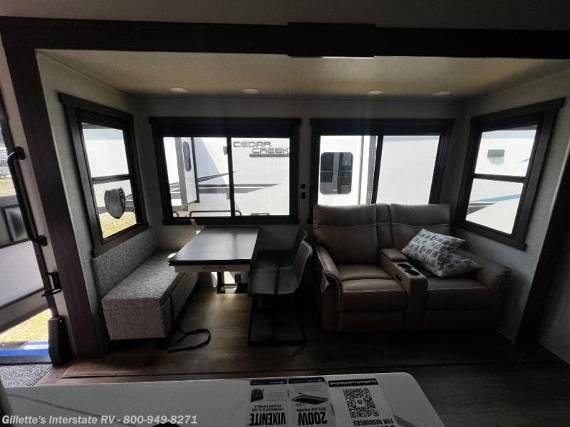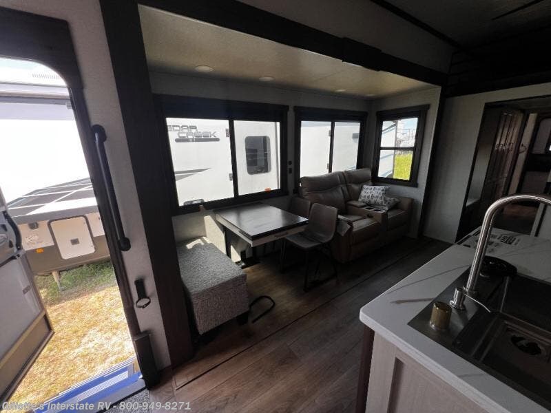 With any Cedar Creek Experience fifth wheel by Forest River, you will bet met with luxury features both inside and out! The True Gelcoat exterior is the best of the best in exteriors and the 3M bonded sidewalls will hold up over years of use. There is also a new 101'' wide-body frame, a Road Warrior suspension, plus a TST tire pressure monitoring system to make towing that much easier. You will find a hidden front storage compartment, along with a 4' x 6' ABS, ribbed, removable underbelly panels, and 6-point hydraulic leveling system, plus many more exterior conveniences. The interior will have you feeling like you haven't left home with vinyl floor coverings, power theater seating with USB ports, a cozy fireplace, vinyl floor covering and the list of comforts goes on! Each model is also pre-wired for satellite to the roof, and you're sure to never go bored with a Smart TV in the bedroom!
