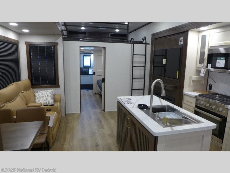 This is the perfect fifth wheel to camp with family or neighbor friends since there are two bedrooms, one of which is a master bedroom with a full rear bath. The second full bath is up front, and both bedrooms include a king bed slide out for added comfort. There is even a loft above the rear bedroom, complete with two bunk mats, two cabinets, and a TV hookup. Everyone can meet in the combined kitchen and living room to enjoy the swivel mounted TV and fireplace across from the theater seating. There is also a wall-mounted dining table with an extension and ottoman.