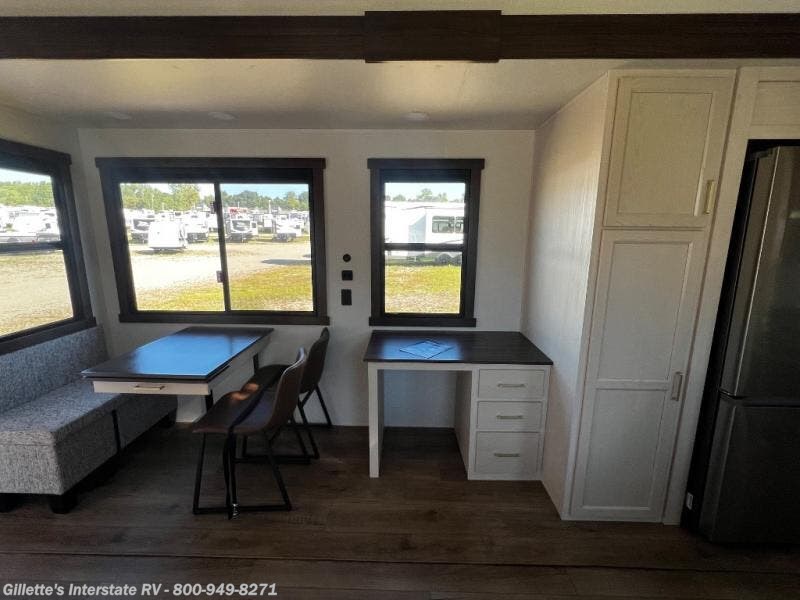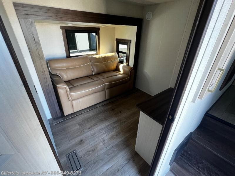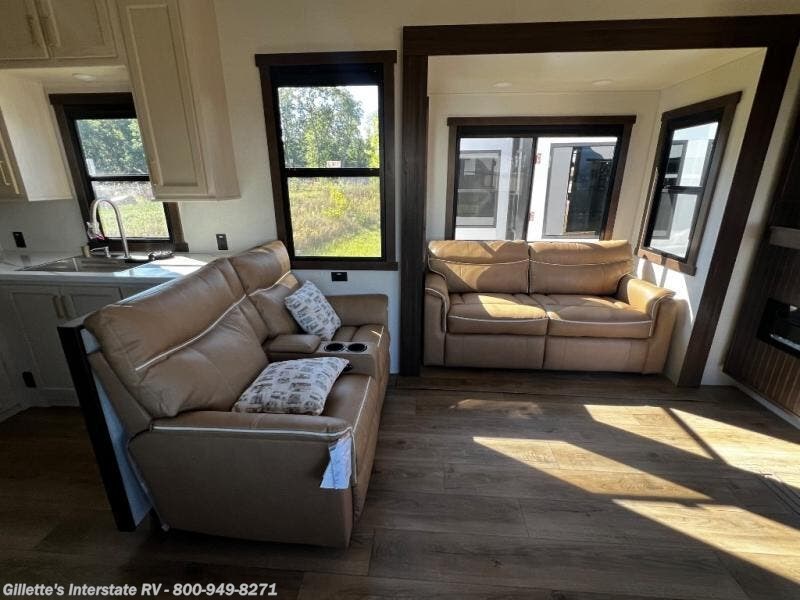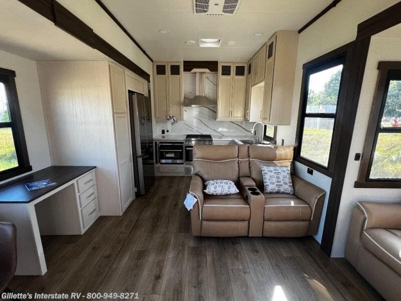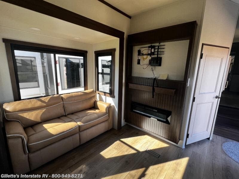 A front kitchen with ample counter space, a middle den, and a front bedroom make this fifth wheel one to remember! The living area will be a favorite spot to visit together since there is a hide-a-bed sofa and theater seating, plus an entertainment center with a fireplace. There is also a free-standing dining table and a desk with a chair if you need to telecommute. Your guests will love the middle den with a hide-a-bed sofa and a closet for their things, plus there is a loft above this room for added sleeping or storage space. A spacious full bath includes a shower with a seat, and the king bed slide out in the front private bedroom is sure to bring a great night's rest.