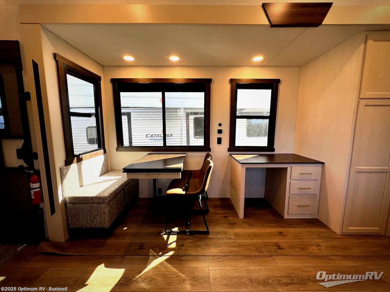 A front kitchen with ample counter space, a middle den, and a front bedroom make this fifth wheel one to remember! The living area will be a favorite spot to visit together since there is a hide-a-bed sofa and theater seating, plus an entertainment center with a fireplace. There is also a free-standing dining table and a desk with a chair if you need to telecommute. Your guests will love the middle den with a hide-a-bed sofa and a closet for their things, plus there is a loft above this room for added sleeping or storage space. A spacious full bath includes a shower with a seat, and the king bed slide out in the front private bedroom is sure to bring a great night's rest.