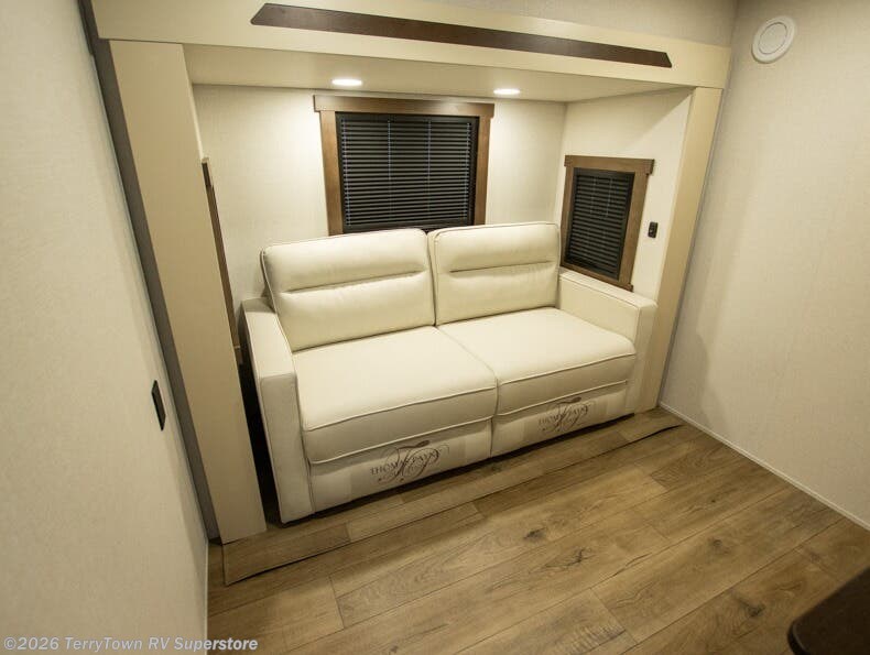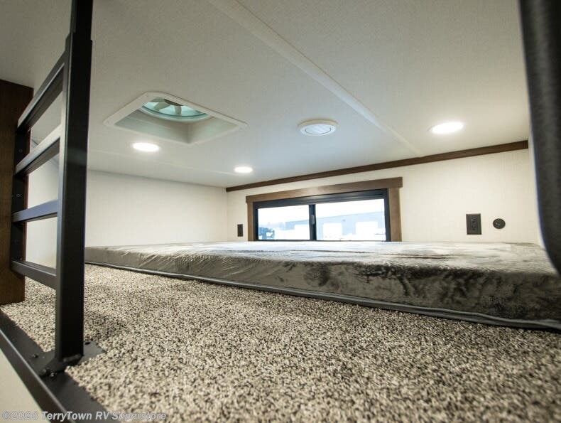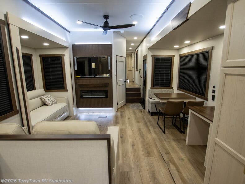 A front kitchen with ample counter space, a middle den, and a front bedroom make this fifth wheel one to remember! The living area will be a favorite spot to visit together since there is a hide-a-bed sofa and theater seating, plus an entertainment center with a fireplace. There is also a free-standing dining table and a desk with a chair if you need to telecommute. Your guests will love the middle den with a hide-a-bed sofa and a closet for their things, plus there is a loft above this room for added sleeping or storage space. A spacious full bath includes a shower with a seat, and the king bed slide out in the front private bedroom is sure to bring a great night's rest.