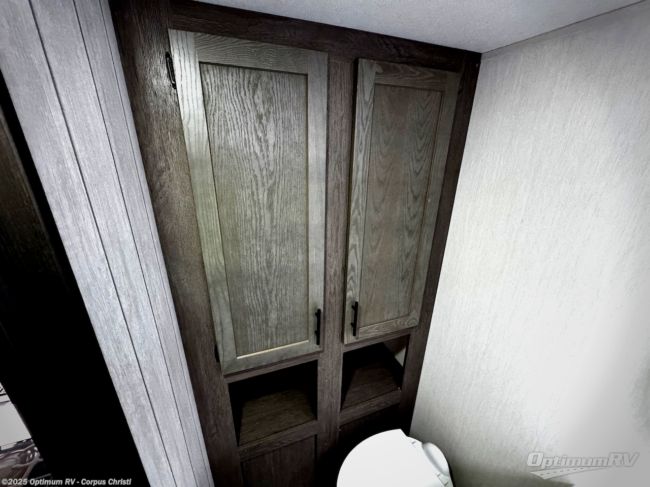 At the front of this travel trailer, a private bedroom with sliding doors offers a peaceful retreat, featuring a comfortable 60" x 80" queen bed and ample storage with dual wardrobes and overhead cabinets for all your essentials. Moving into the center, the living and kitchen area opens up with theater seating housed in a slide-out, creating a spacious feel and a cozy place to relax. Across from it sits the L-shaped kitchen, where solid-surface countertops, a three-burner range, microwave, and 10 cu. ft. refrigerator make meal prep quick and easy. The farm-style sink, complete with a cup washer and helpful accessories, adds both charm and convenience, while the bar top with chairs provides an ideal spot to dine or plan out your day’s adventures. At the rear, the full bathroom awaits with a generous linen closet, an ample shower, and a porcelain stool toilet so you can enjoy comfort and privacy without relying on campsite facilities.