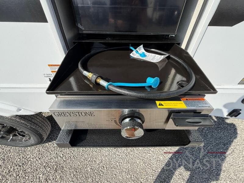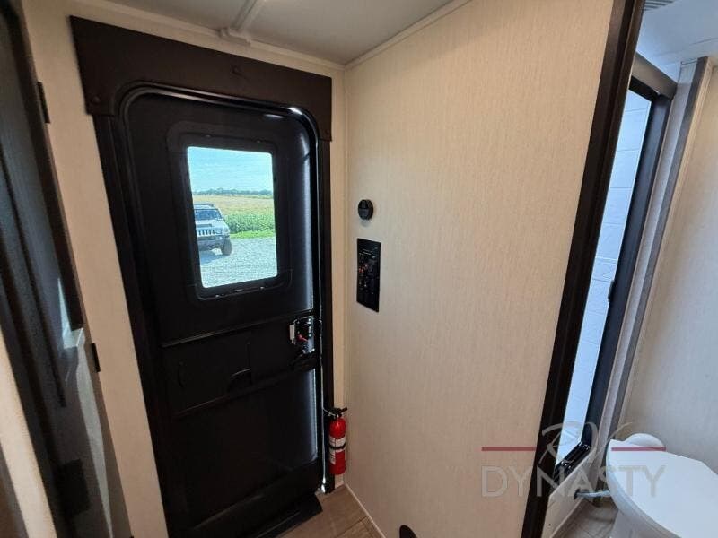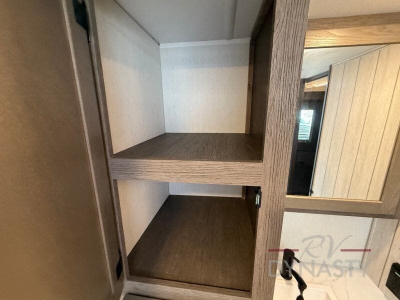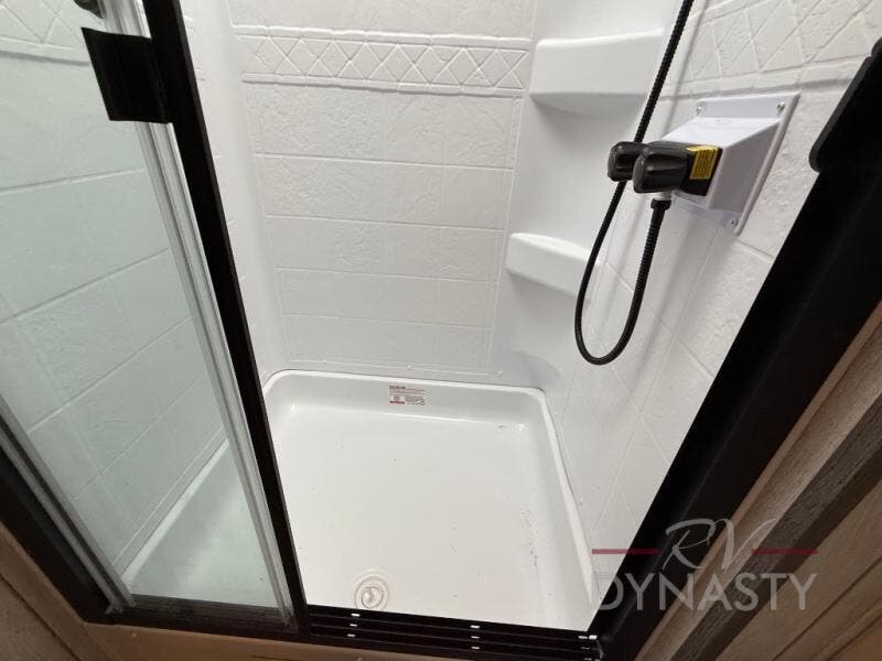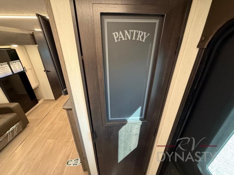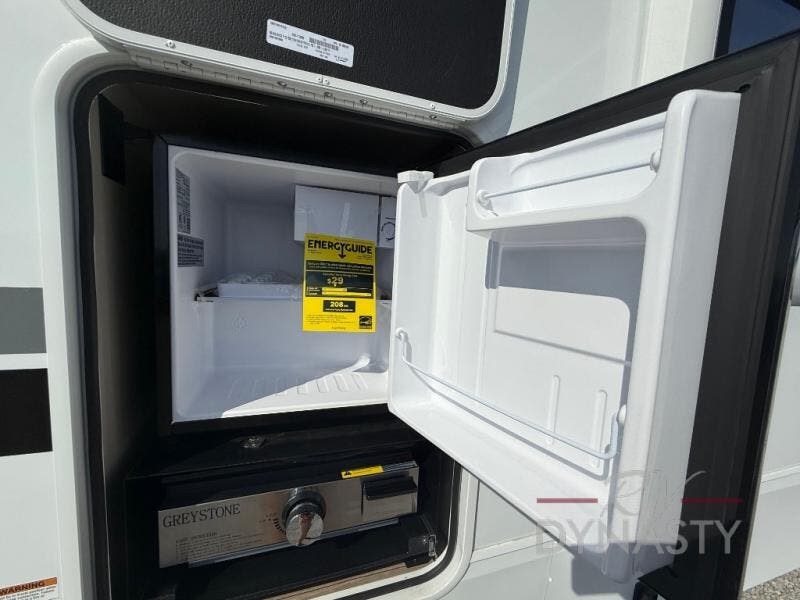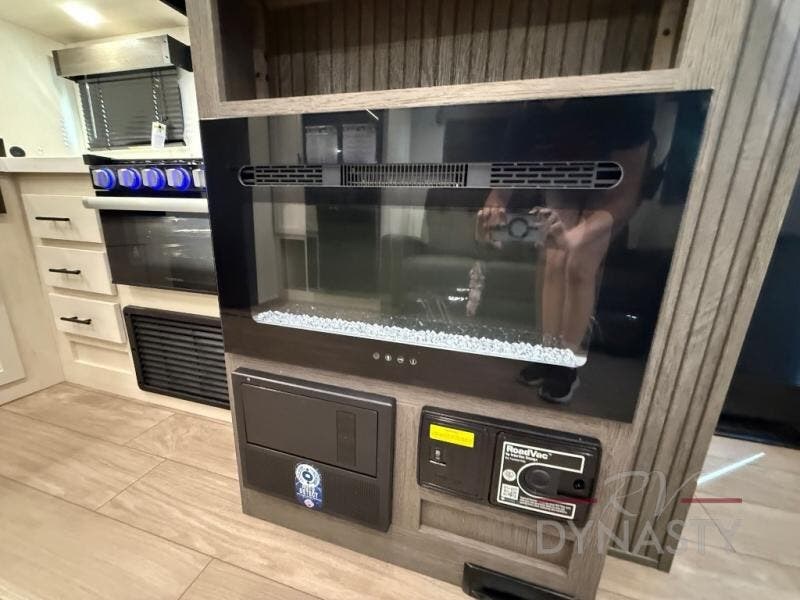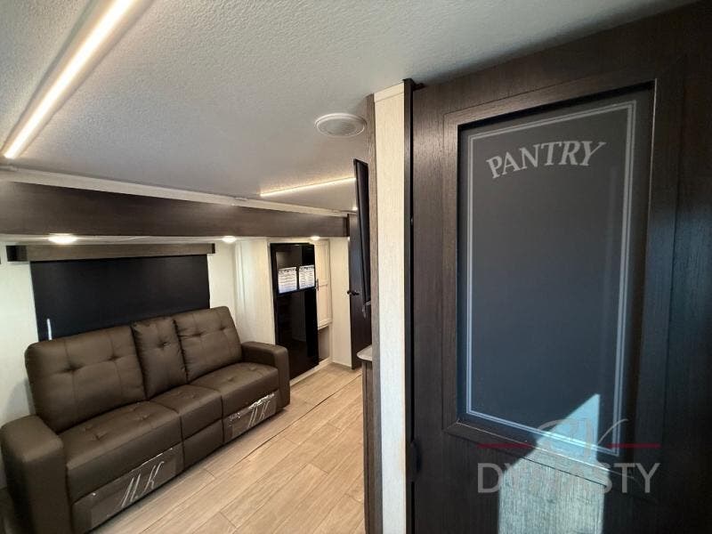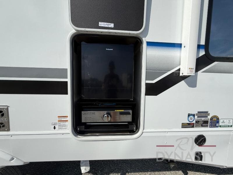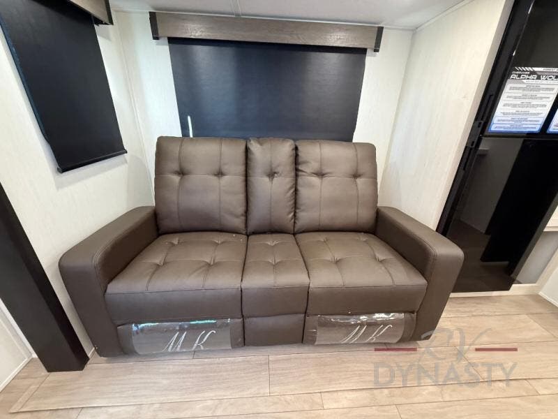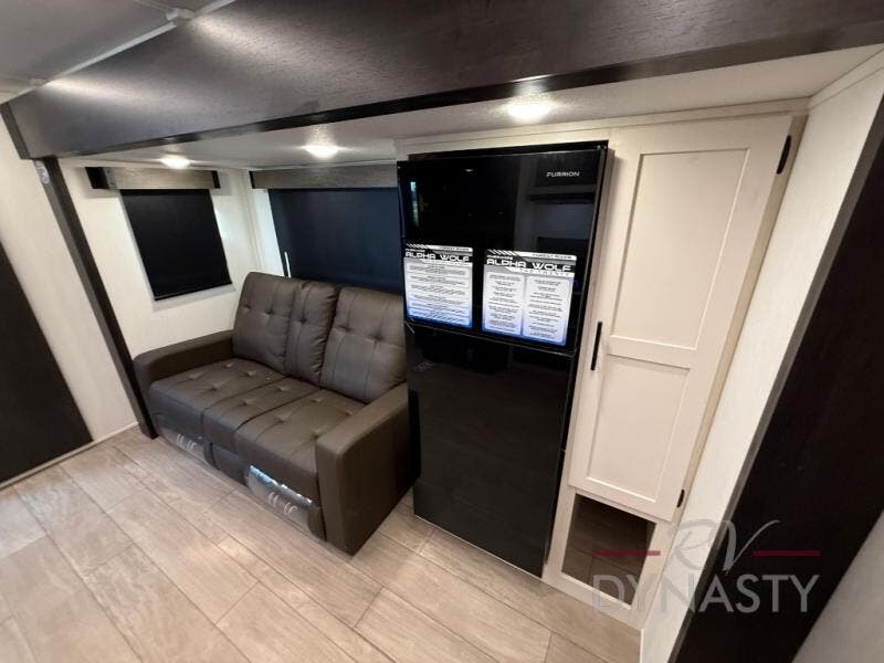 Looking for the perfect trailer for two with a spacious bathroom and bedroom? This Alpha Wolf provides a rear oversized bathroom complete with linen storage and a sliding door that saves space and looks great. The front bedroom includes a walk-around queen bed, dual wardrobes, a sliding door plus windows for natural lighting and great views. The main living and kitchen area is spacious as well with a large slide out that includes theater seating with a removable table across from the entertainment center with a fireplace, a 12V residential style refrigerator for lots of cold storage, and a pantry for your snacks and dry goods. You can decide to cook indoors on the three burner cooktop, or head outdoors to cook on the outside kitchen!