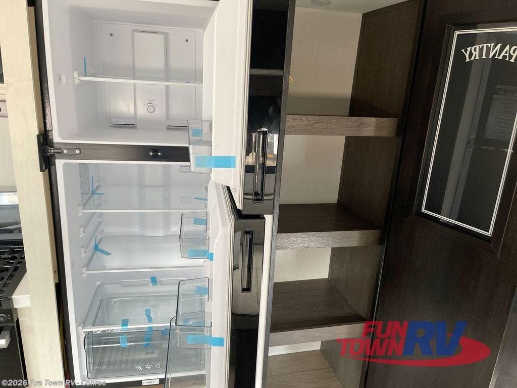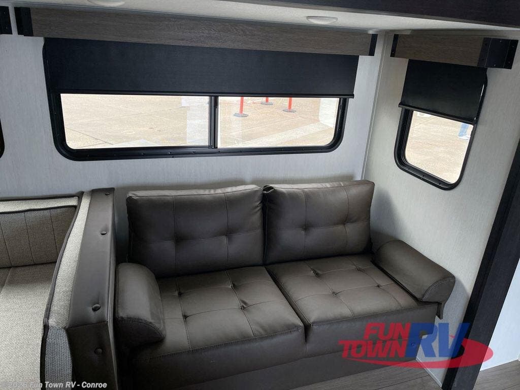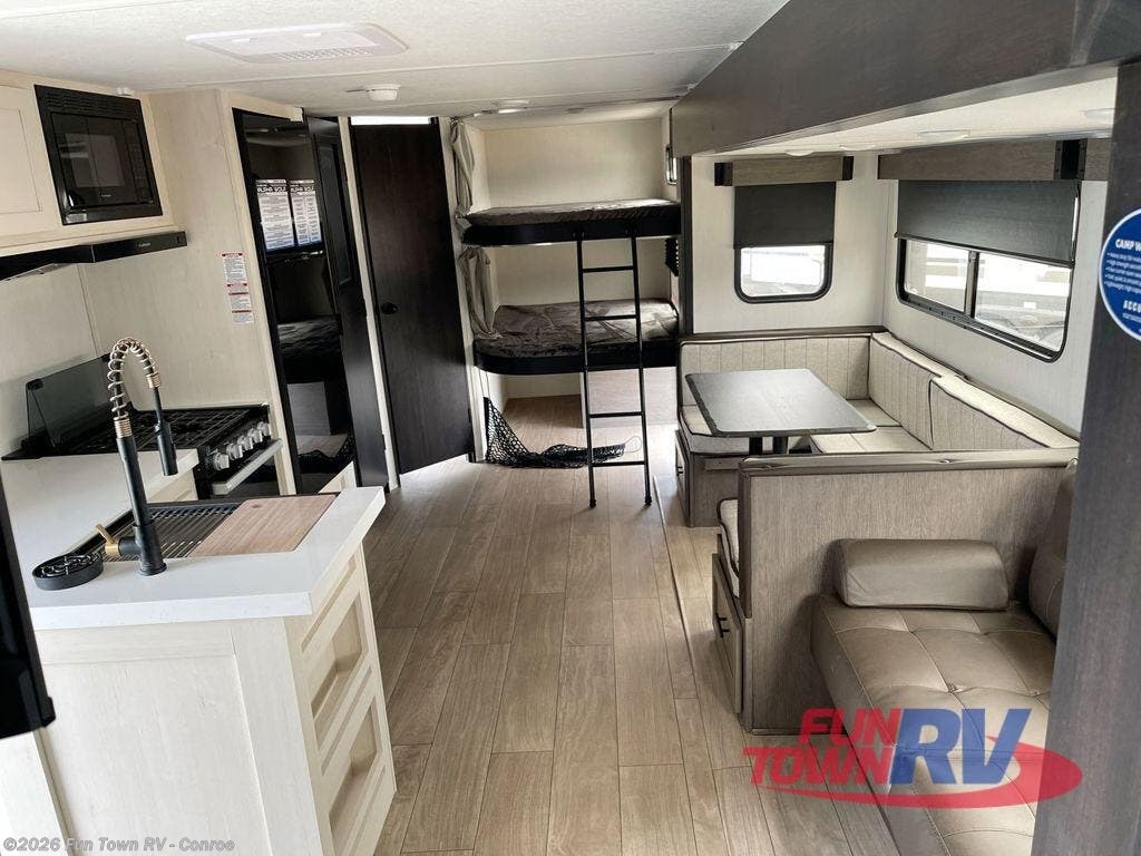 Looking for a multi-sleeper trailer to sleep up to nine campers? You've found it in this dual entry model with an outside kitchen, double-size bunks, and a large slide out! The main living and kitchen area has a U-shaped dinette to utilize as a dining table, game table, work station, and/or an extra sleeping space. You will also find a hidden pantry behind the entertainment center and full kitchen amenities including a large sink and a residential-style refrigerator. The exterior provides a 20' awning for an outdoor living area, outside storage, plus large steps with oversized landing and quick release for convenience. You will also appreciate the Juice Pack that comes with a 100W solar panel, a battery, a 30 AMP solar charger, and more!