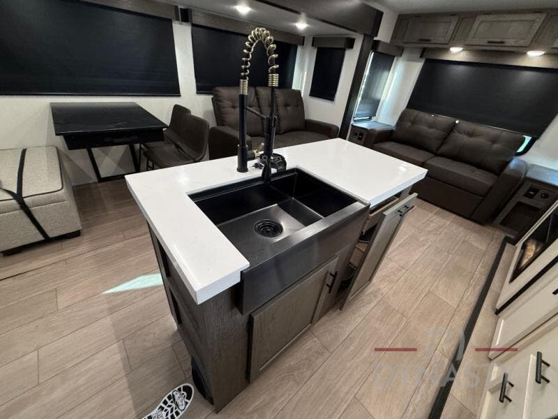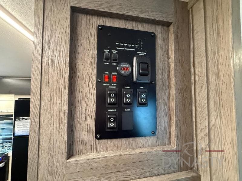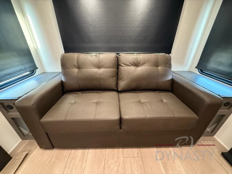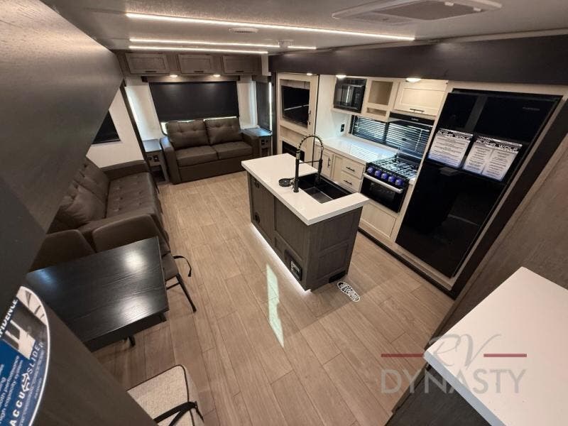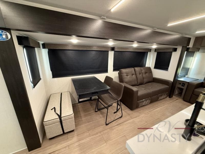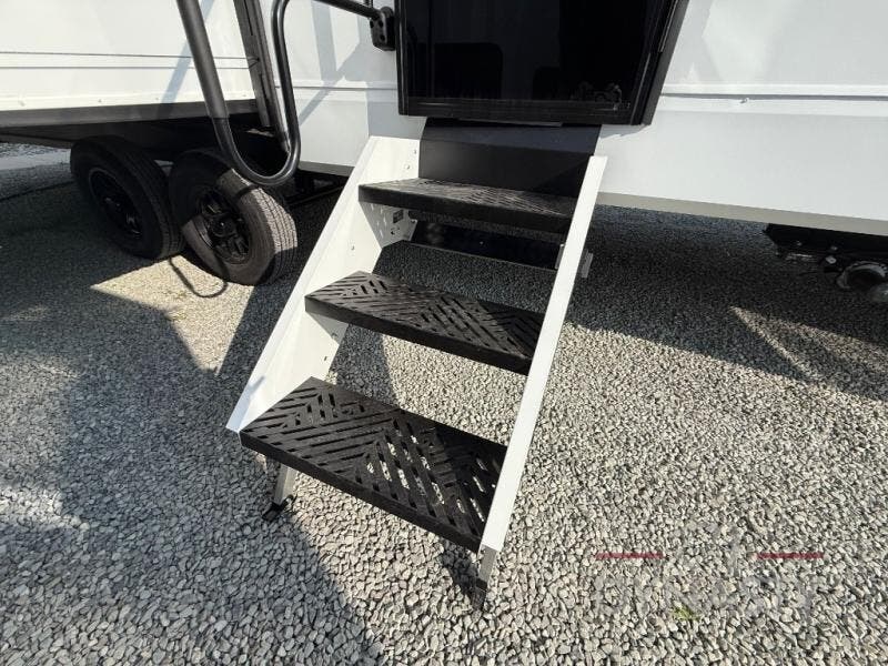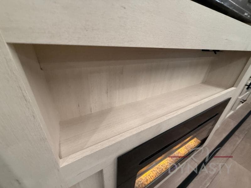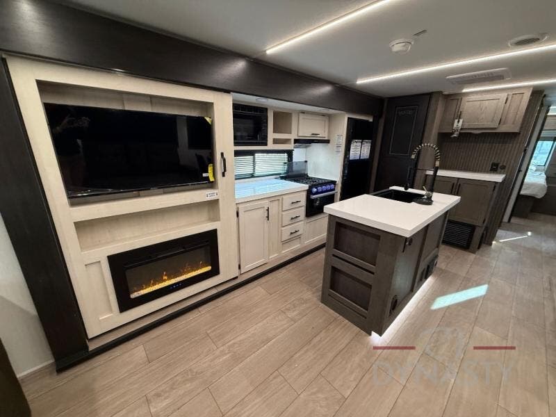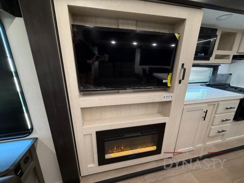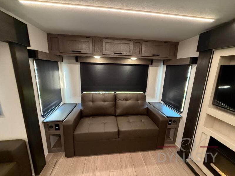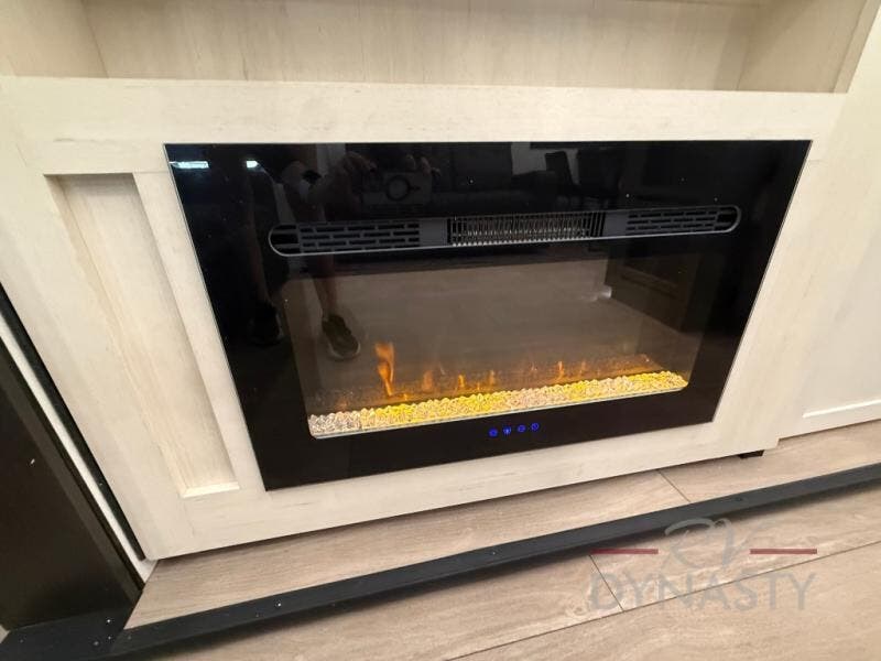 This trailer has it all for maximum comfort and convenience as well as entertainment! The rear living area includes a tri-fold sofa with a rear Pano-Vision window for great views of your campsite, and dual opposing slides widen this area so you can visit with friends. You'll also find theater seating, plus a free-standing table with two chairs and a storage ottoman seat. Enjoy the fireplace on a cool night or when you want a little ambiance while seated inside. Two patio awnings will provide an outdoor living area; just grab your camping chairs from the full pass-through storage. When you want to call it a night, fall quickly to sleep on the queen bed in the front bedroom with easy access to a dual entry bathroom!