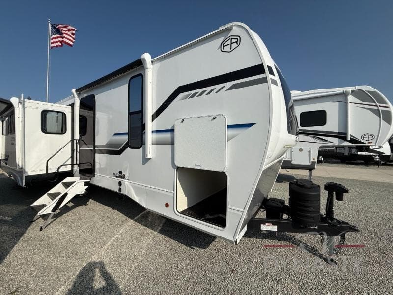 This trailer has it all for maximum comfort and convenience as well as entertainment! The rear living area includes a tri-fold sofa with a rear Pano-Vision window for great views of your campsite, and dual opposing slides widen this area so you can visit with friends. You'll also find theater seating, plus a free-standing table with two chairs and a storage ottoman seat. Enjoy the fireplace on a cool night or when you want a little ambiance while seated inside. Two patio awnings will provide an outdoor living area; just grab your camping chairs from the full pass-through storage. When you want to call it a night, fall quickly to sleep on the queen bed in the front bedroom with easy access to a dual entry bathroom!