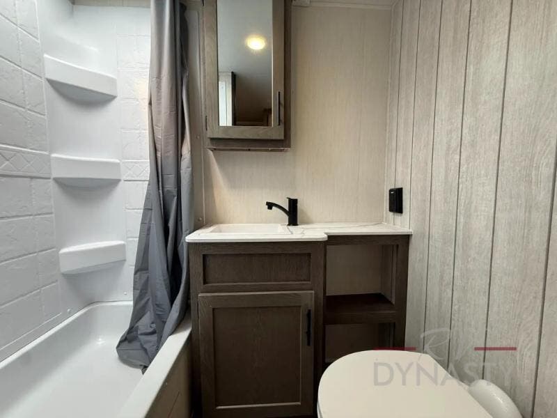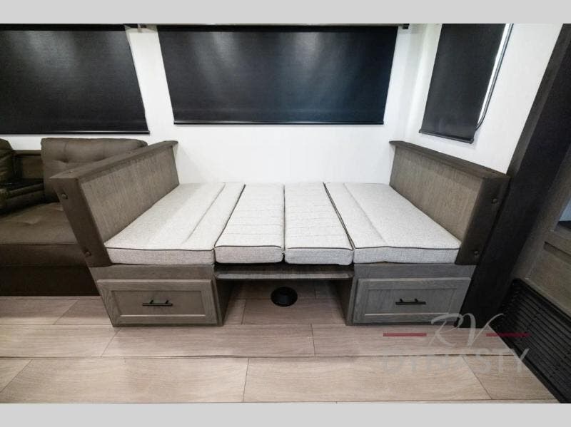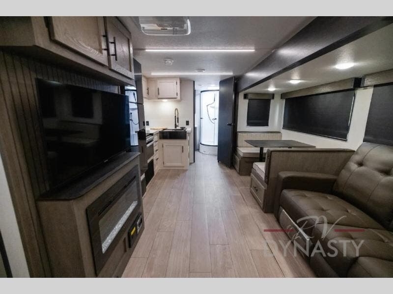 Load up your clothes, food, and outdoor gear to enjoy a long weekend away from the city in this travel trailer! There are triple slide outs, a private bunkhouse with a half bathroom with a second exterior entry/door for convenience, plus an outside kitchen, complete with ice! The bunkhouse also has two bunks, a jackknife sofa and a trundle bed, plus a slide out for more interior floor space. The main living and kitchen area is spacious as well with two opposing slides, a kitchen island with a large sink, a pantry, plus a cozy fireplace. The full walk-through bathroom allows double access, and the front bedroom allows you to sleep like royalty.