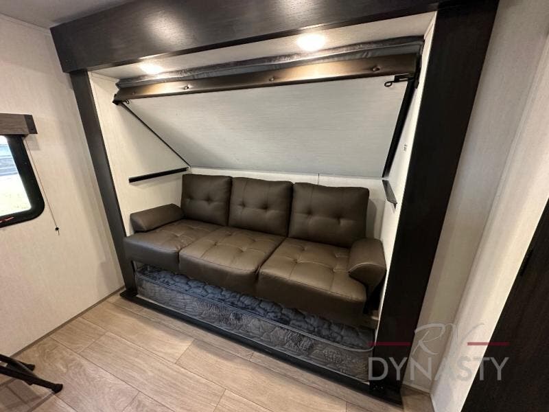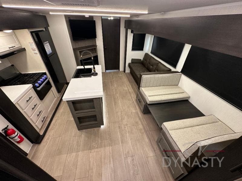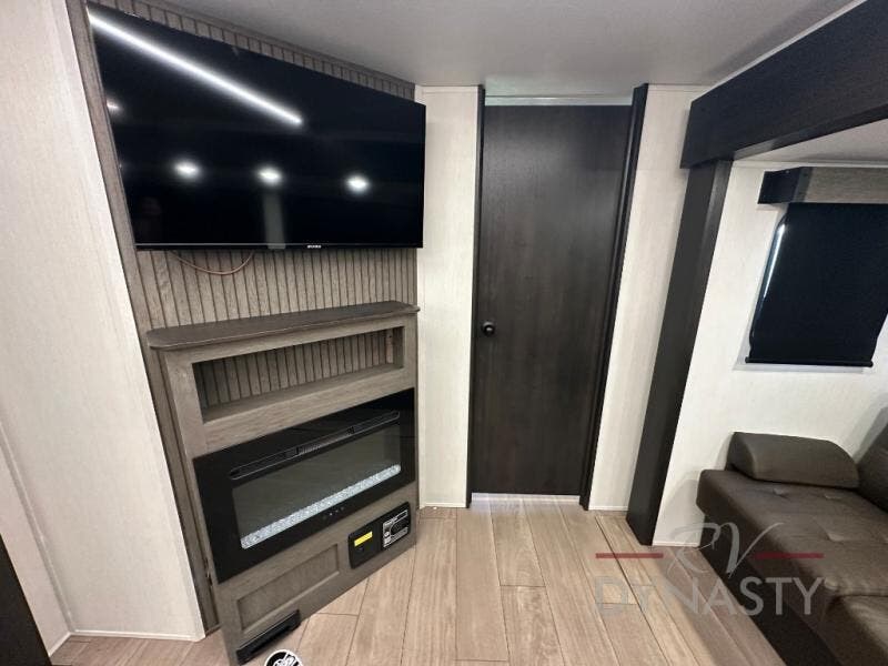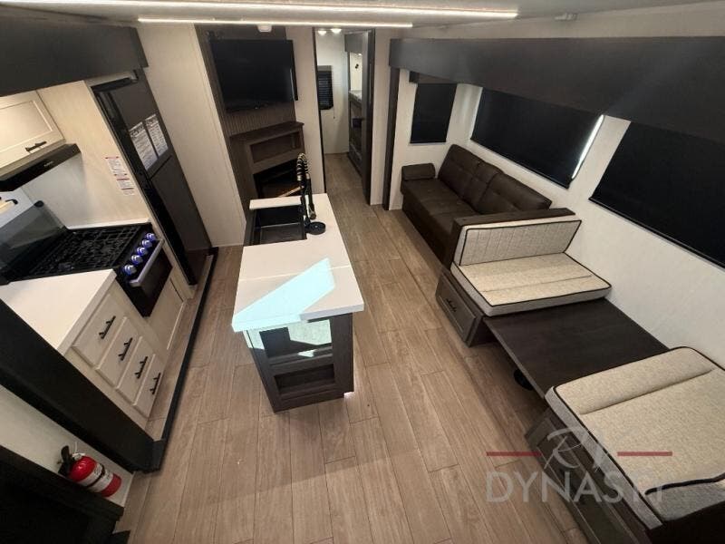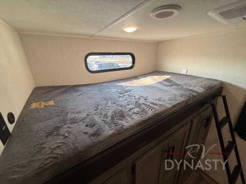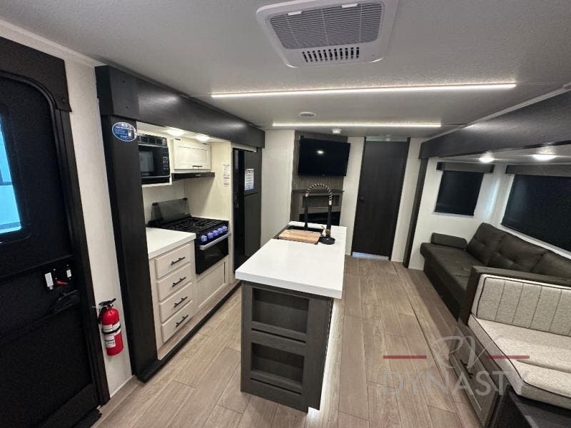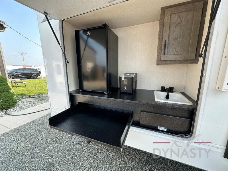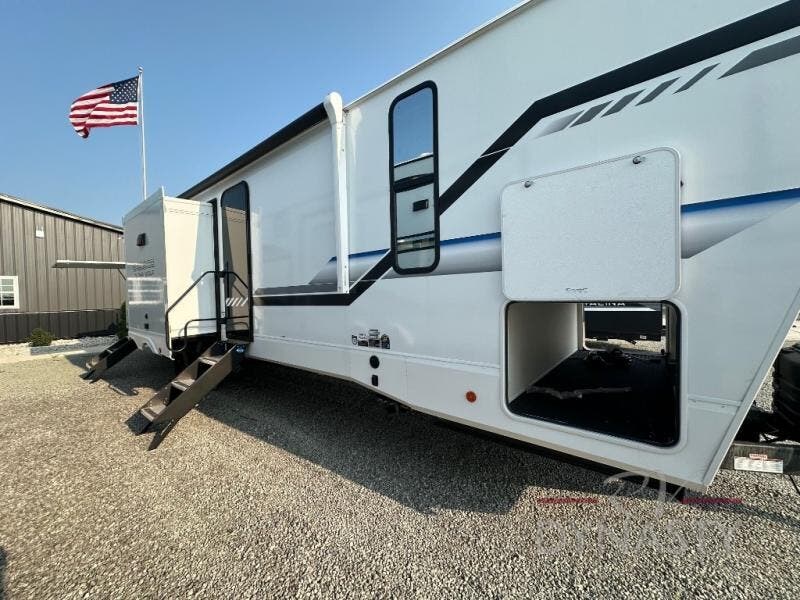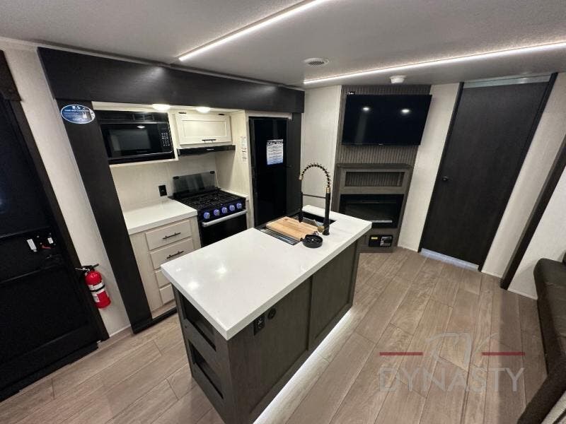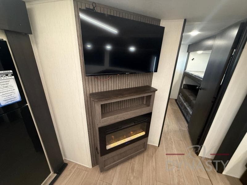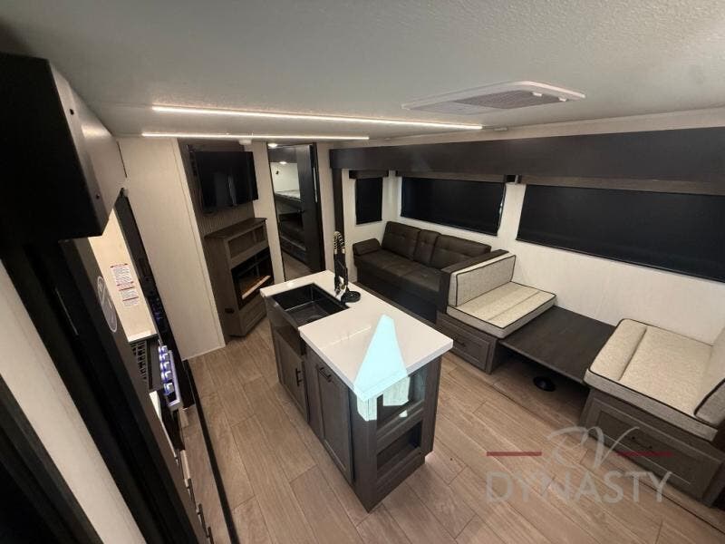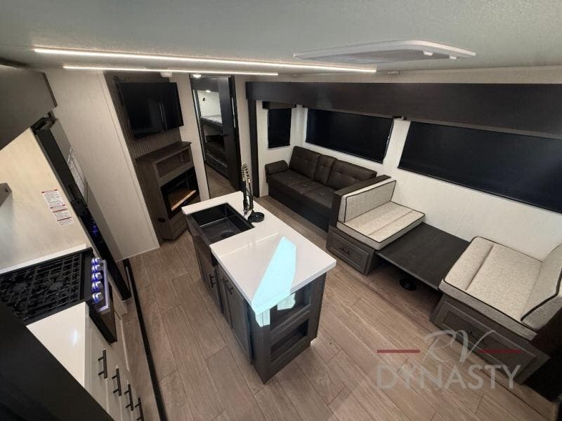 Load up your clothes, food, and outdoor gear to enjoy a long weekend away from the city in this travel trailer! There are triple slide outs, a private bunkhouse with a half bathroom with a second exterior entry/door for convenience, plus an outside kitchen! The bunkhouse also has two bunks, a jackknife sofa and a trundle bed, plus a slide out for more interior floor space. The main living and kitchen area is spacious as well with two opposing slides, a kitchen island with a large sink, a pantry, plus a cozy fireplace. The full walk-through bathroom allows double access, and the front bedroom allows you to sleep like royalty.