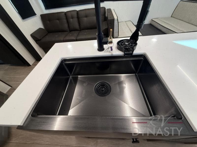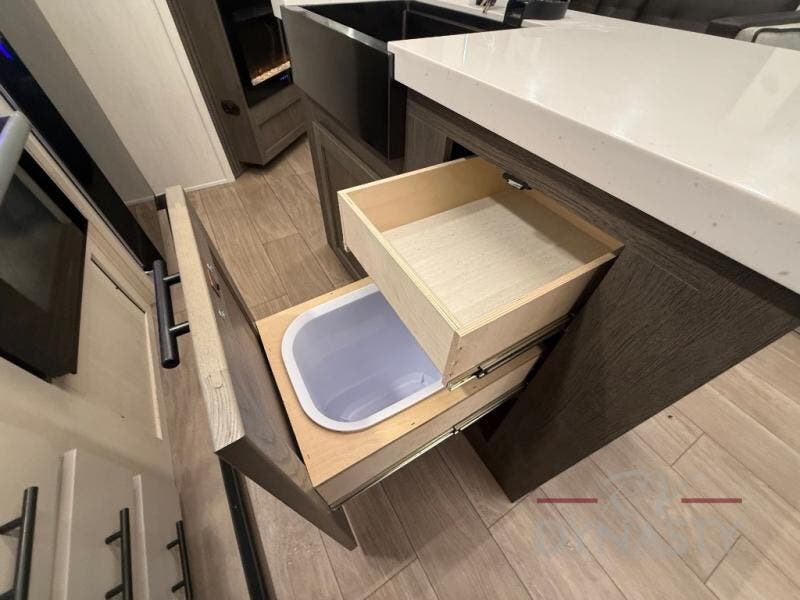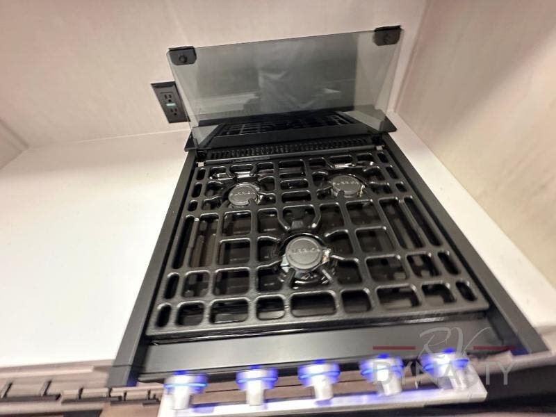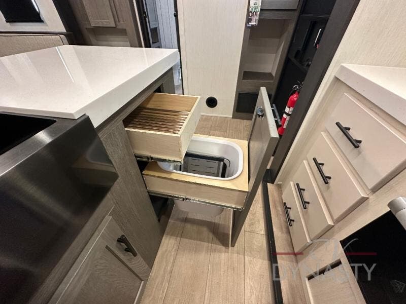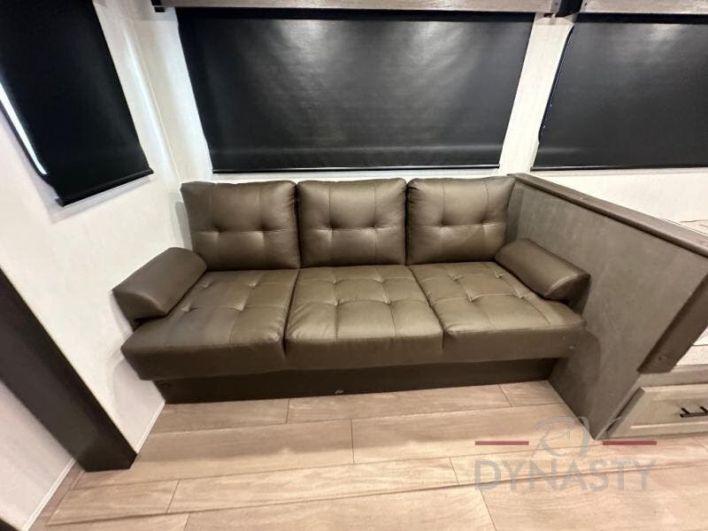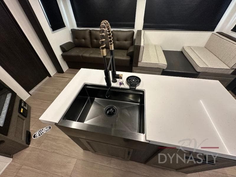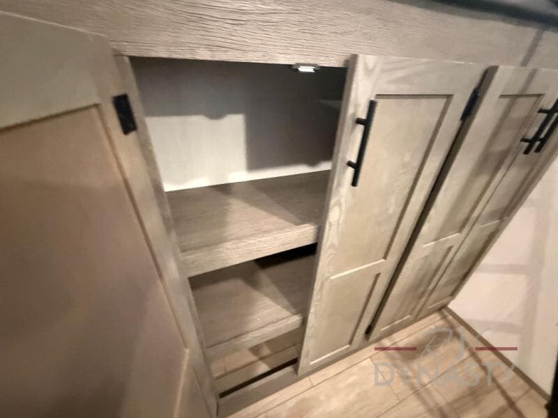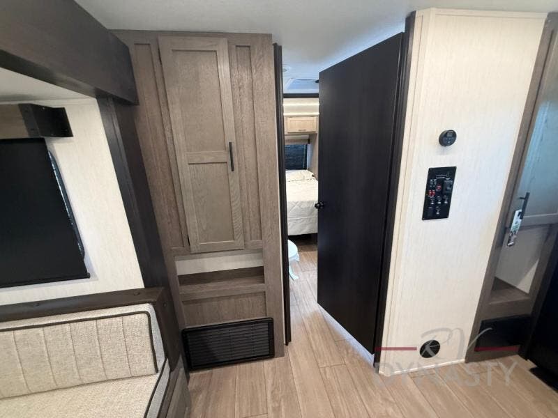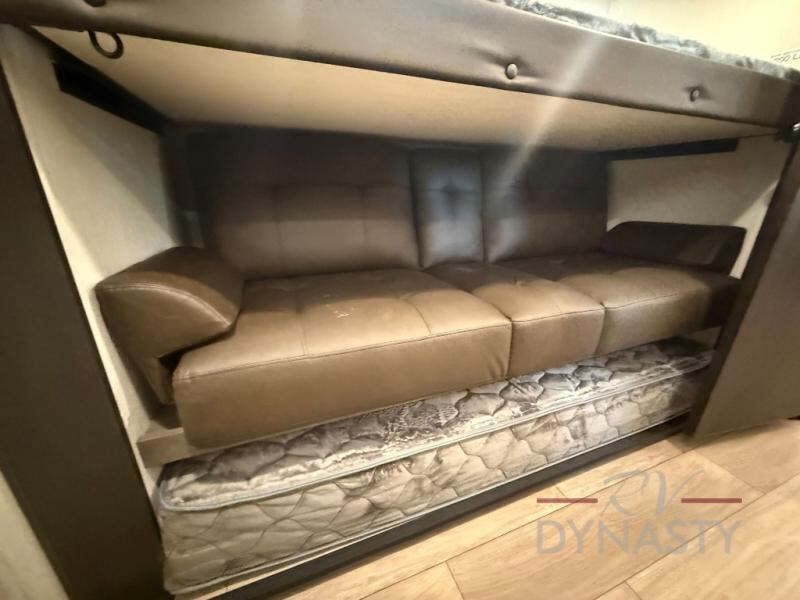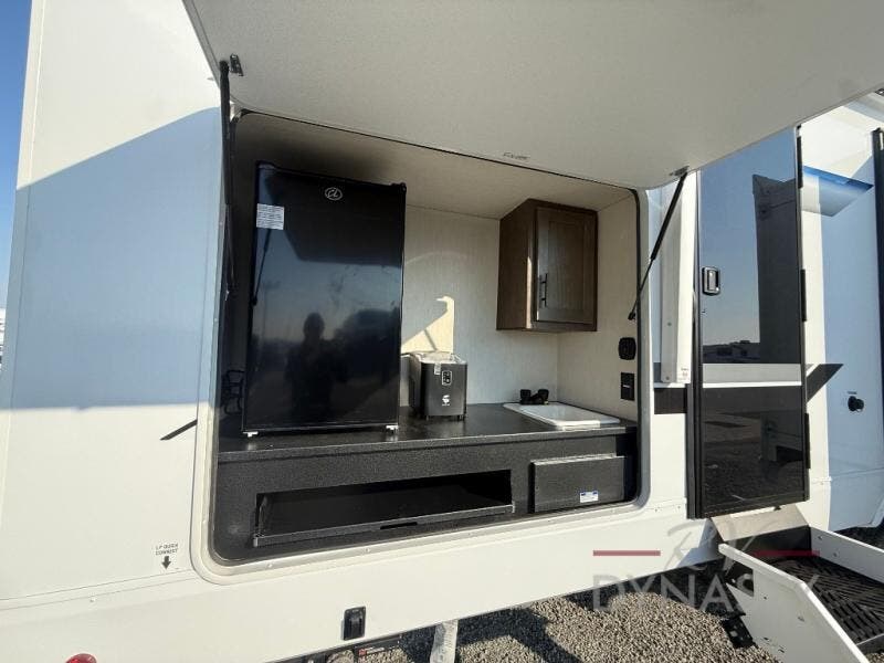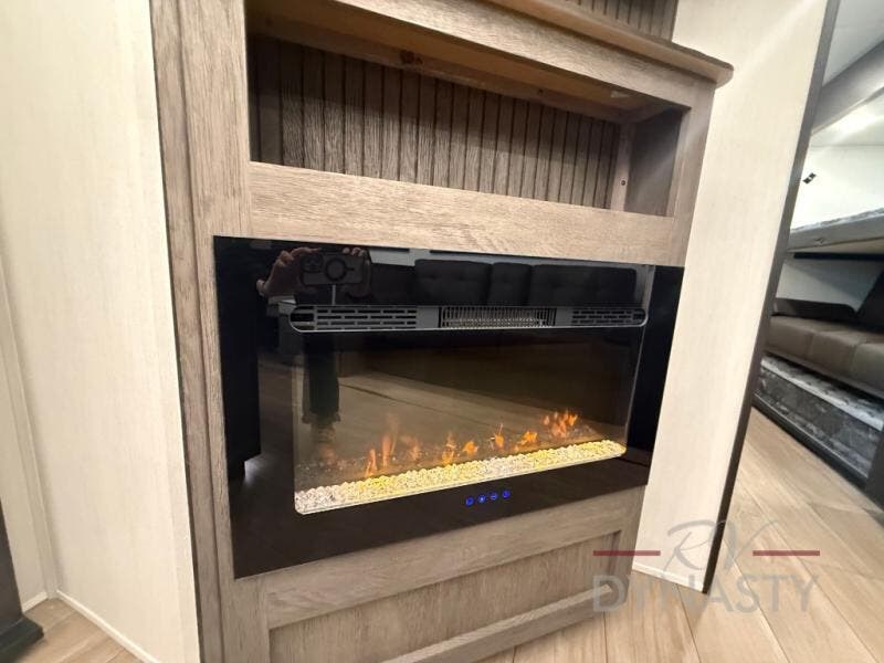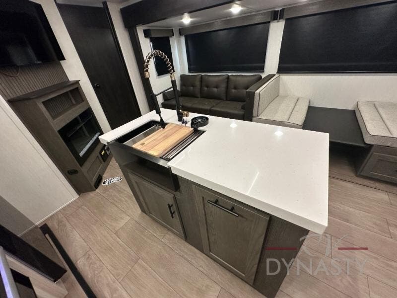 Load up your clothes, food, and outdoor gear to enjoy a long weekend away from the city in this travel trailer! There are triple slide outs, a private bunkhouse with a half bathroom with a second exterior entry/door for convenience, plus an outside kitchen! The bunkhouse also has two bunks, a jackknife sofa and a trundle bed, plus a slide out for more interior floor space. The main living and kitchen area is spacious as well with two opposing slides, a kitchen island with a large sink, a pantry, plus a cozy fireplace. The full walk-through bathroom allows double access, and the front bedroom allows you to sleep like royalty.