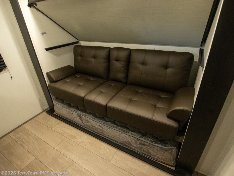 Load up your clothes, food, and outdoor gear to enjoy a long weekend away from the city in this travel trailer! There are triple slide outs, a private bunkhouse with a half bathroom with a second exterior entry/door for convenience, plus an outside kitchen, complete with ice! The bunkhouse also has two bunks, a jackknife sofa and a trundle bed, plus a slide out for more interior floor space. The main living and kitchen area is spacious as well with two opposing slides, a kitchen island with a large sink, a pantry, plus a cozy fireplace. The full walk-through bathroom allows double access, and the front bedroom allows you to sleep like royalty.